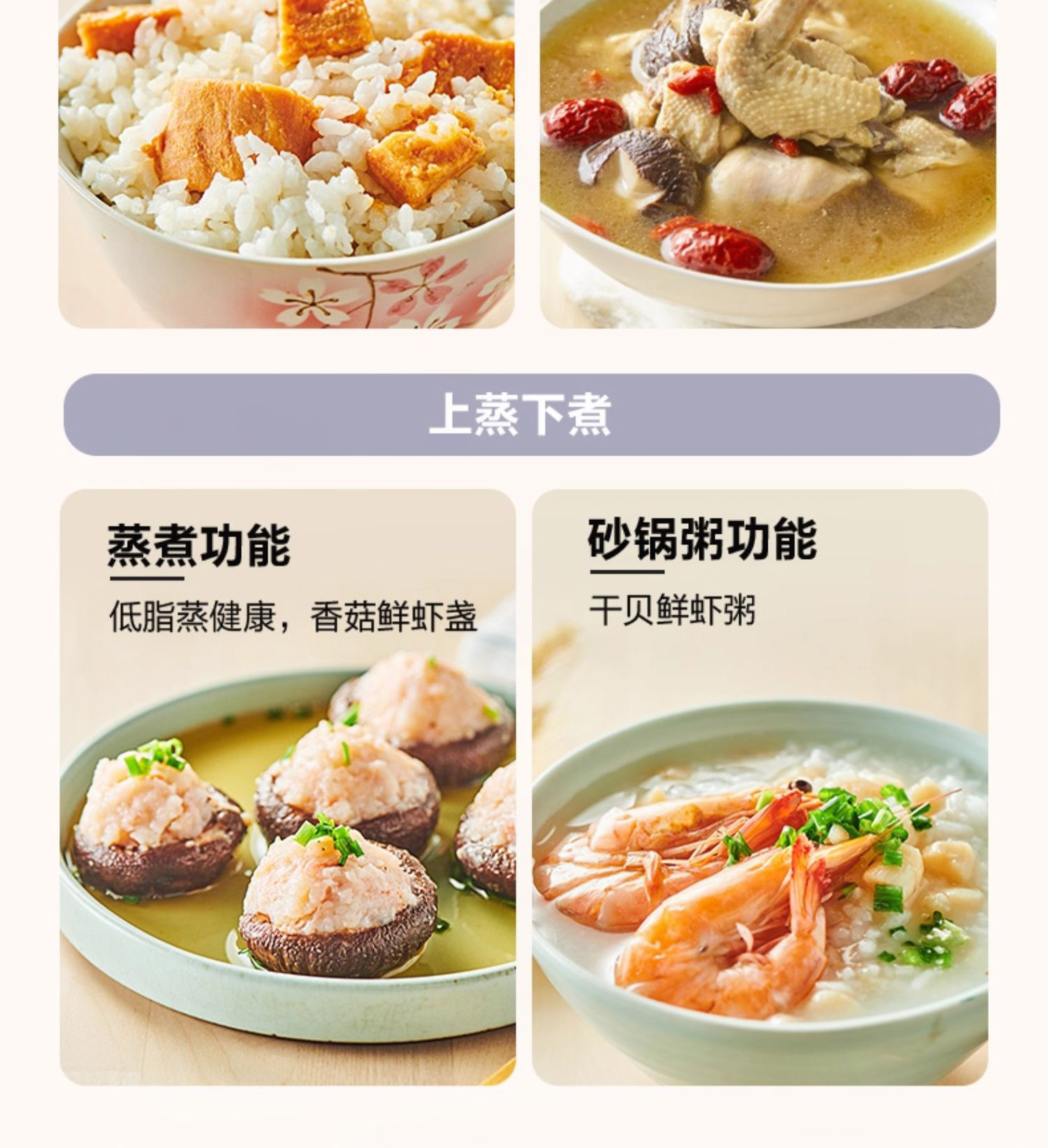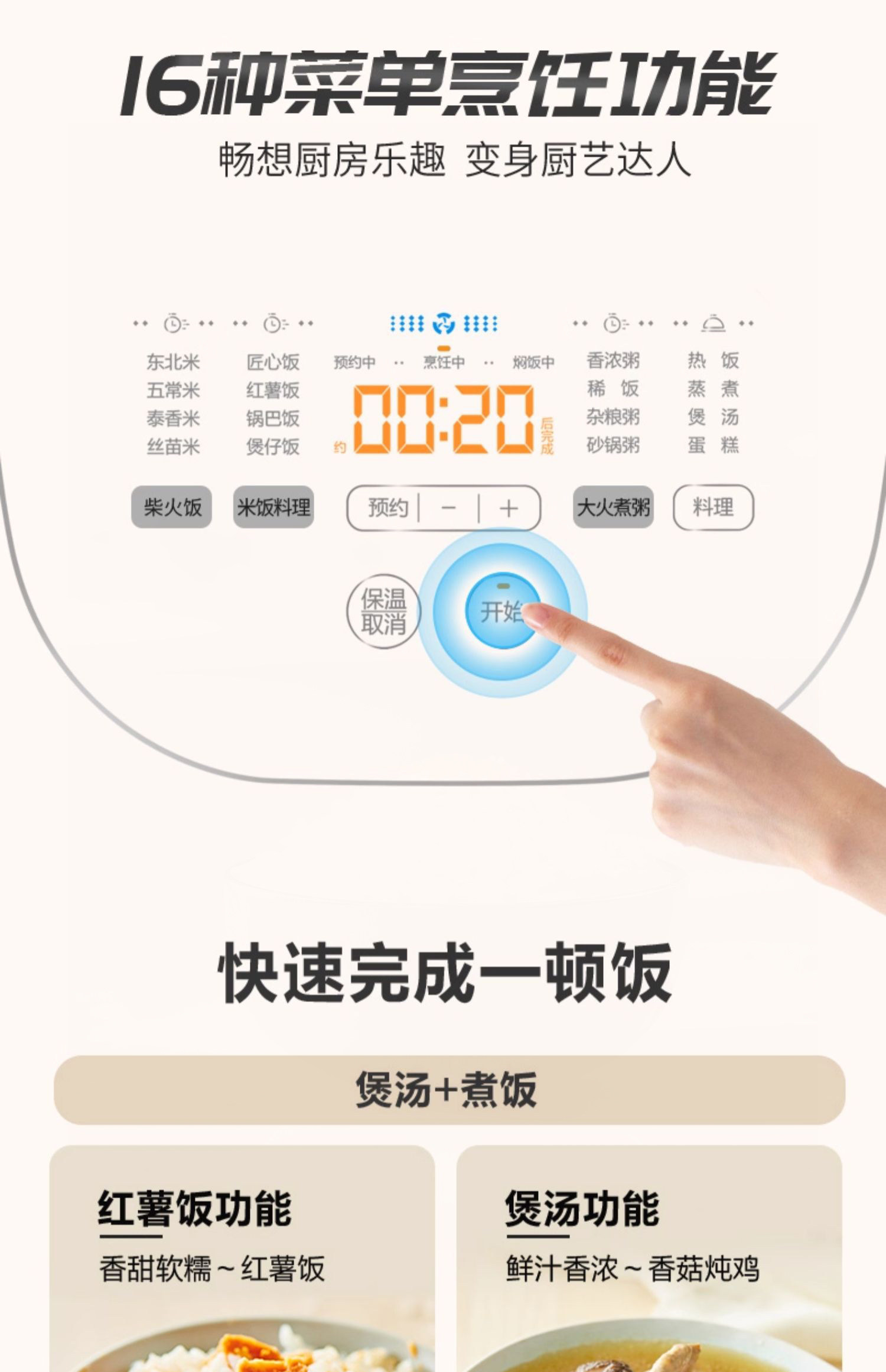 | Multifunctional Rice Cooker | Steaming,Soup,Cake,Cooking Rice,Claypot Rice,Appointment,Hot Meals,Keep Warm,Cook Porridge |