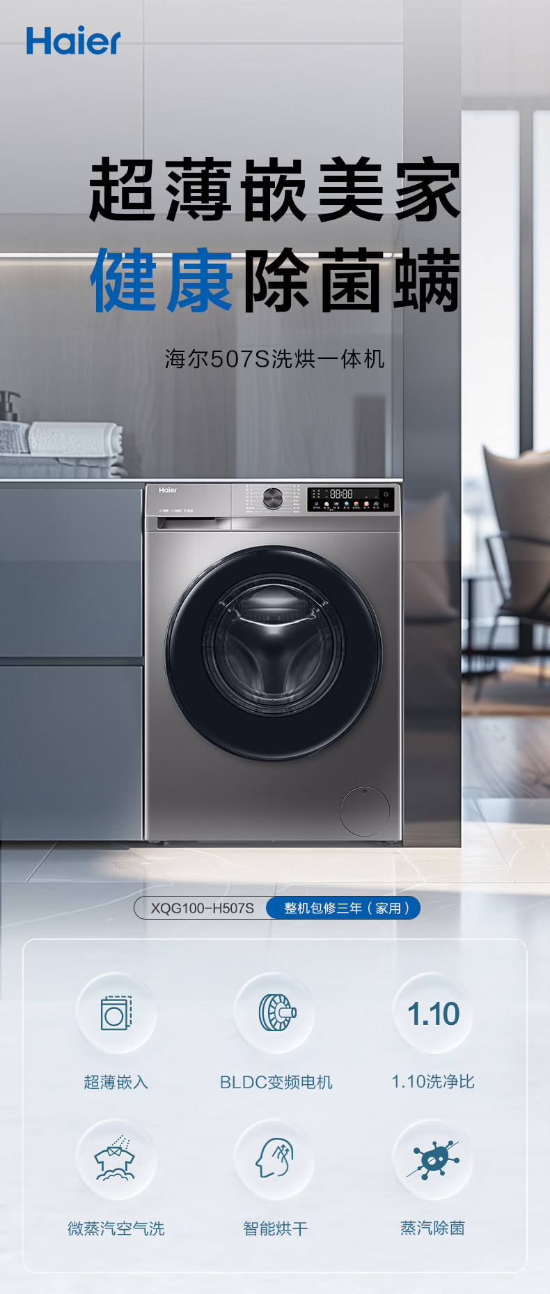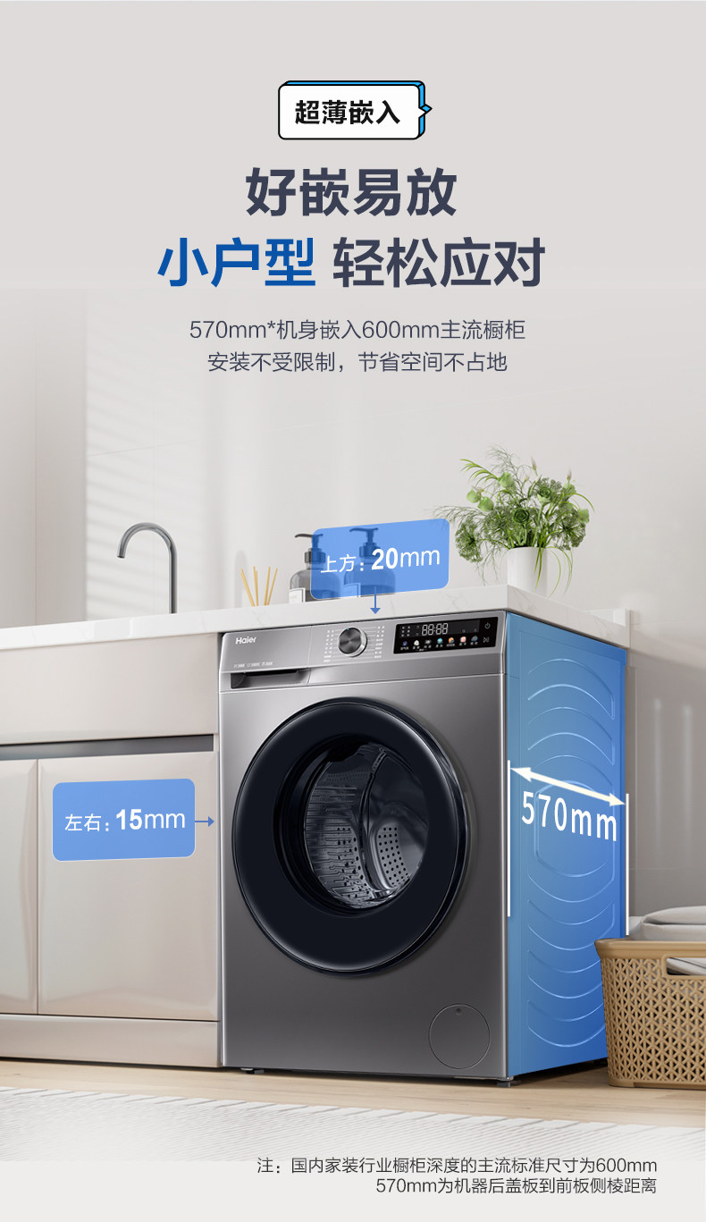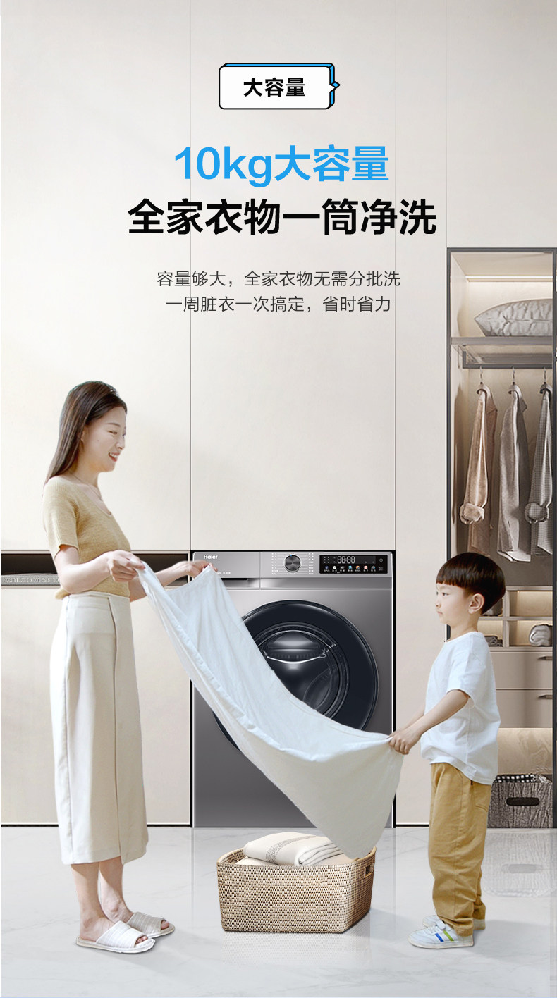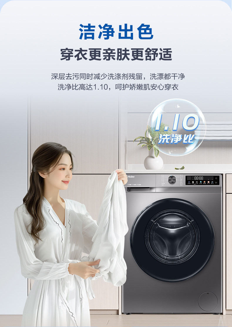 1:1 Washing Capacity, Haier 10kg Ultra-Thin Inverter Washing and Drying Integrated Washing Machine for Home Use, Sterilization, Dual Spray H507S