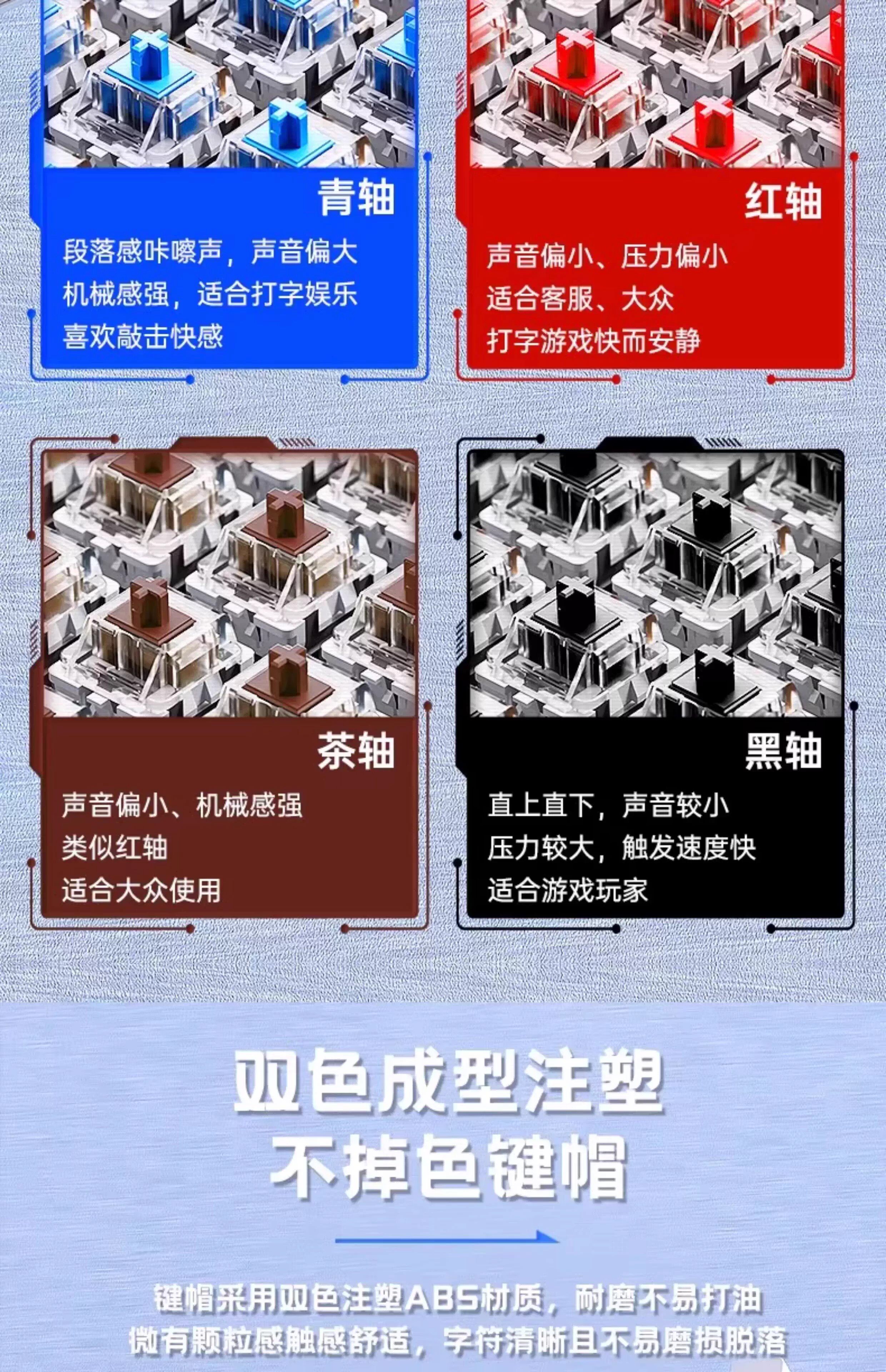 | Axis Name | Blue Axis (Crisp Sound, Strong Button Response),Brown Switches (Versatile Switches, Relatively Quiet),Red Axis (Low Sound, Light Pressing Force),Black Axis (Fast Trigger, High Pressing Force) |