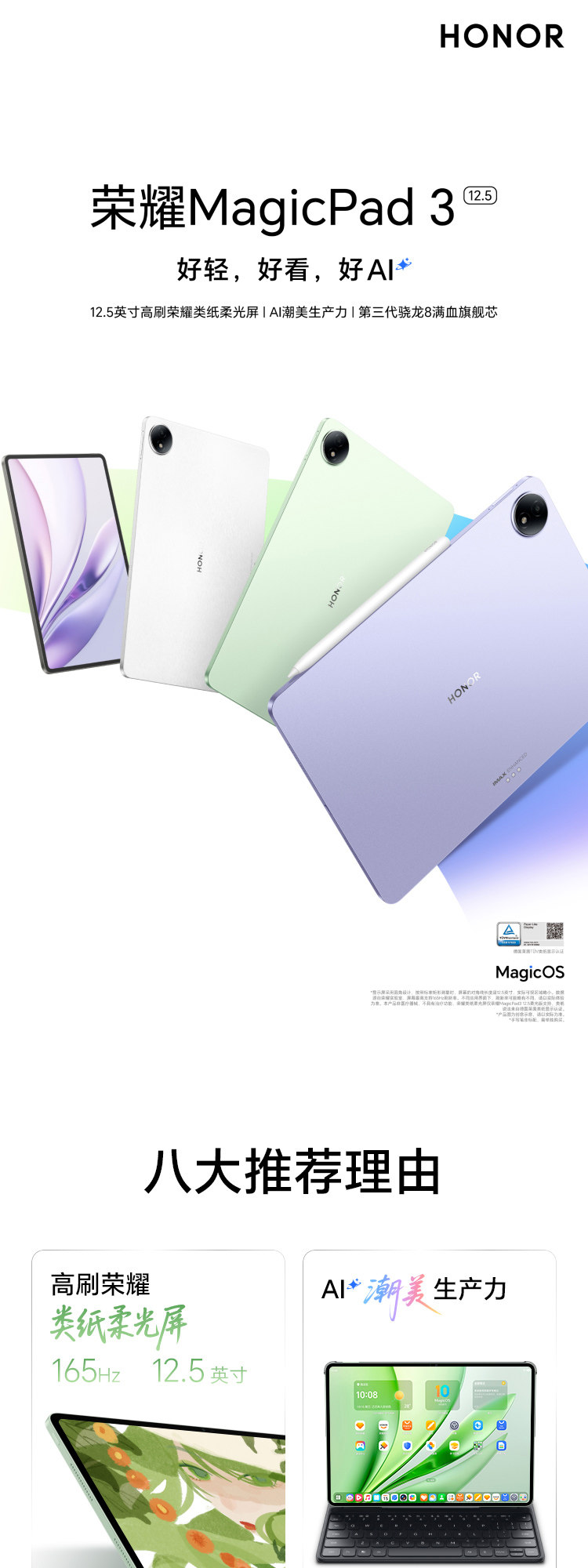 [Official Website] Honor/Magicpad3 12.5inch Tablet Computer, Honor Paper-Like Soft Light Screen, Colorful and Lightweight Tablet for Office and Gaming, Official Website