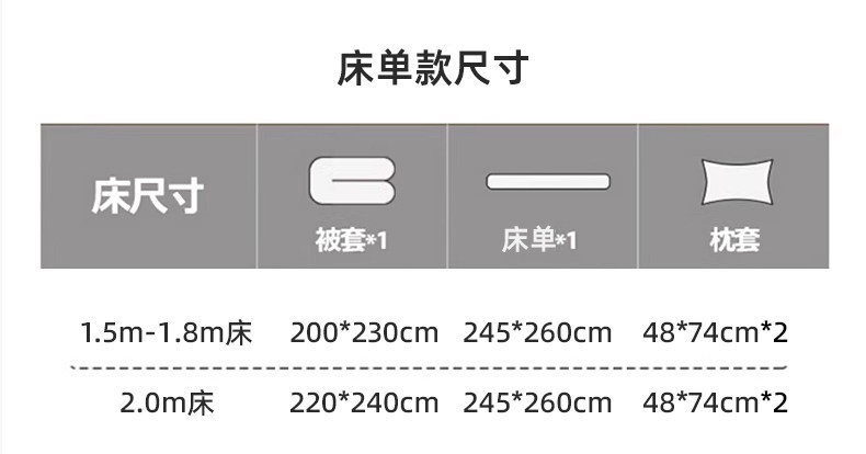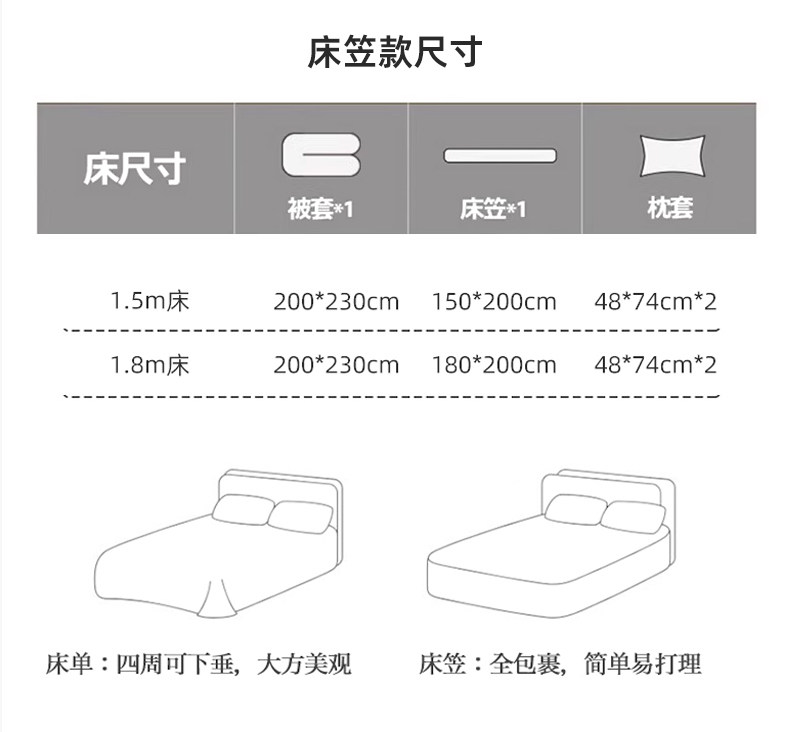 | Applicable Bed Size | 1.5m Bed Sheet Four-Piece Set [Quilt Cover 200*230Cm/Sheets 245*260Cm/Pillowcase 48*74cm*2],1.8m Bed Sheet Four-Piece Set [Quilt Cover 200*230Cm/Sheets 245*260Cm/Pillowcase 48*74cm*2],2.0m Bed Sheet Four-Piece Set [Quilt Cover 220*240Cm/Sheets 245*260Cm/Pillowcase 48*74cm*2],1.5m Fitted Sheet Set of Four [Quilt Cover 200*230Cm/Fitted Sheet 150*200Cm/Pillowcase 48*74cm*2],1.8m Fitted Sheet Set of Four [Quilt Cover 200*230Cm/Fitted Sheet 180*200Cm/Pillowcase 48*74cm*2],"Extra Large" 1.8m Fitted Sheet Four-Piece Set [Quilt Cover 220*240Cm/Fitted Sheet 180*200Cm/Pillowcase 48*74cm*2] |