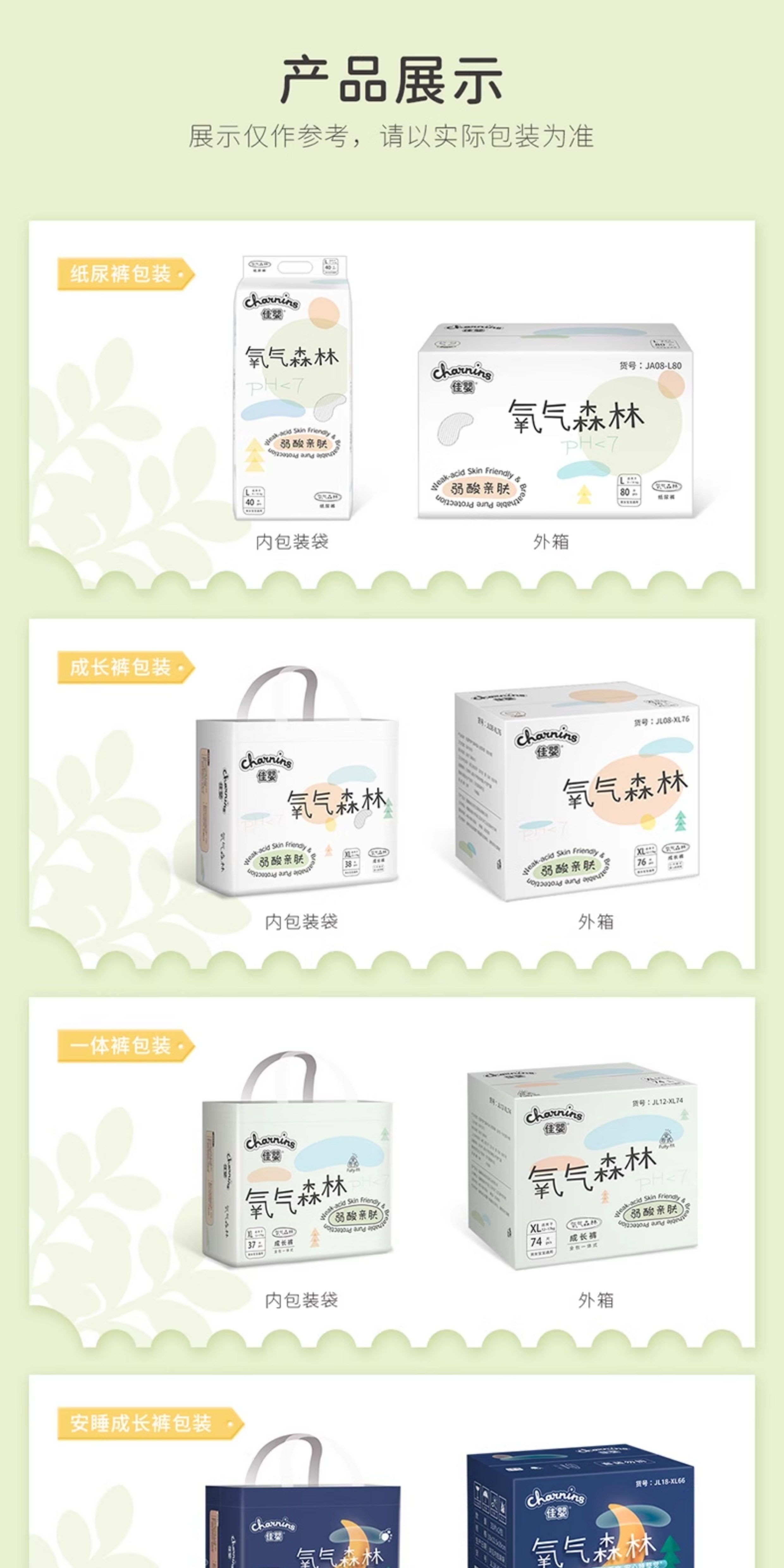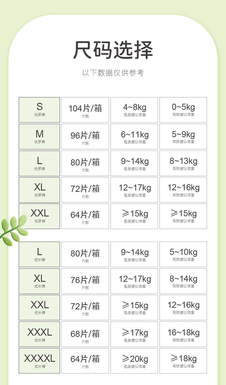 | Size | All-Inclusive Pull-Up Pants, Size L, 6 Packs, Total 234 Pieces (5-10kg),All-Inclusive Pull-Up Pants, XL Size, 6 Packs, Total 222 Pieces (8-14kg),All-Inclusive Pull-Up Pants, Size 2XL, 6 Packs Totaling 204 Pieces (12-16kg),All-Inclusive Pull-Up Pants, Size 3XL, 6 Packs, Total 192 Pieces (16-18kg),All-Inclusive Pull-Up Pants, Size 4XL, 6 Packs of 180 Pieces (18kg +),All-Inclusive Pull-Up Pants, Size 5XL, 6 Packs Totaling 168 Pieces (20kg +)),Diapers S Size 6 Pack Total 312 Pieces (0-5kg),Diapers m Size 6 Pack Total 288 Pieces (5-9kg),Diapers L Size L6 Pack Total 240 Pieces (8-13kg),Diapers XL Size 6 Pack Totaling 216 Pieces (12-16kg),Diapers XXL Size 6 Pack Totaling 192 Pieces (16kg +),Night-Use All-Inclusive Pull-Up Pants, Size L, 6 Packs Totaling 210 Pieces (5-10kg),Night-Use All-Inclusive Pull-Up Pants Xl6 Pack Totaling 198 Pieces (8-14kg),Night-Use All-Inclusive Pull-Up Pants, Size 2XL, 6 Packs Totaling 180 Pieces (12-16kg),Night-Use All-Inclusive Pull-Up Pants, Size 3XL, 6 Packs Totaling 168 Pieces (16-18kg),Night-Use All-Inclusive Pull-Up Pants, Size 4XL, 6 Packs Totaling 156 Pieces (18kg +),Night-Use All-Inclusive Pull-Up Pants, Size 5XL, 6 Packs Totaling 144 Pieces (20kg +),Half Pack of Pull-Up Pants, Size L, 6 Packs, Total 240 Pieces (5-10kg),Half Pack of Pull-Up Pants, XL Size, 6 Packs, Total 228 Pieces (8-14kg),Half Pack of Pull-Up Pants, Size 2XL, 6 Packs, Total 216 Pieces (12-16kg),Half Pack of Pull-Up Pants, Size 3XL, 6 Packs, Total 204 Pieces (16-18kg),Half Pack of Pull-Up Pants, Size 4XL, 6 Packs, Total 192 Pieces (18kg +) |