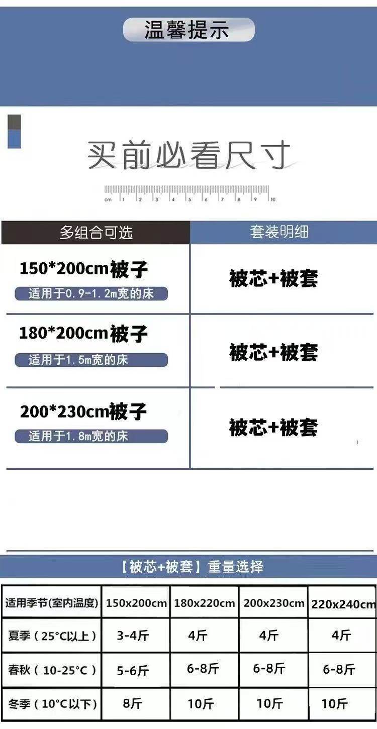 | Size | Single 150*200cm 1.5kg Quilt + Velvet Quilt Cover,Single 150*200cm 2kg Quilt + Velvet Quilt Cover,Single 150*200cm 2.5kg Quilt + Velvet Quilt Cover,Single 150*200cm 3kg Quilt + Velvet Quilt Cover,Single 150*200cm 4kg Quilt + Velvet Quilt Cover,Single Plus Size 180*220cm 3kg Quilt + Velvet Quilt Cover,Single Plus Size 180*220cm 4kg Quilt + Velvet Quilt Cover,Single Plus Size 180*220cm 5kg Quilt + Velvet Quilt Cover,Double 200*230cm 3kg Quilt + Velvet Quilt Cover,Double 200*230cm 4kg Quilt + Velvet Quilt Cover,Double 200*230cm 5kg Quilt + Velvet Quilt Cover,Double 220*240cm 3kg Quilt + Velvet Quilt Cover,Double 220*240cm 4kg Quilt + Velvet Quilt Cover,Quilt Cover 150*200cm,180X220Cm Quilt Cover,200X230Cm Quilt Cover,220X240 Quilt Cover |