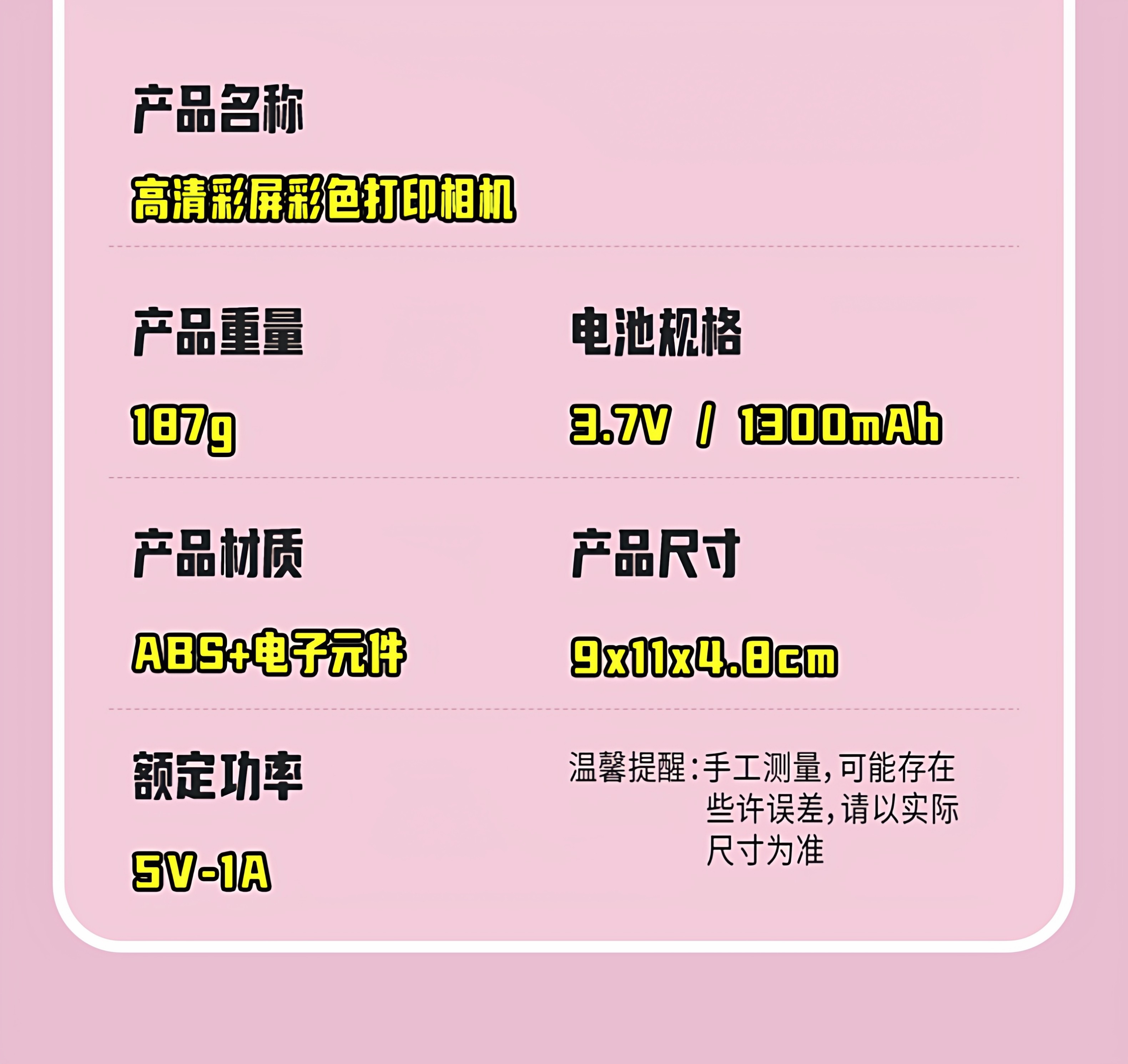 | Color Classification | Collecting Buyer Show [Free Lifetime Photo Paper],[Fast Delivery | Write Greeting Cards | Consult Customer Service],"Simple White | Comes with 128g Memory Card | [4 Rolls of Color Printing Paper] | Supports Color Printing,"Simple White | Comes with 64g Memory Card | [4 Rolls of Color Printing Paper] | Supports Color Printing,"Simple White | Comes with 32g Memory Card | [4 Rolls of Color Printing Paper] | Supports Color Printing,"Simple White | No Card | [4 Rolls of Color Printing Paper] | Supports Color Printing",Taro Purple | Comes with 128Gb Memory Card | [4 Rolls of Color Printing Paper] | Supports Color Printing,Taro Purple | Comes with 64Gb Memory Card | [4 Rolls of Color Printing Paper] | Supports Color Printing,Taro Purple | Comes with a 32Gb Memory Card | [4 Rolls of Color Printing Paper] | Supports Color Printing,Taro Purple | No Card | [4 Rolls of Color Printing Paper] | Supports Color Printing,Cute Pink | Comes with 128Gb Memory Card | [4 Rolls of Color Printing Paper] | Supports Color Printing,Cute Pink | Comes with 64Gb Memory Card | [4 Rolls of Color Printing Paper] | Supports Color Printing,Cute Pink | Comes with 32Gb Memory Card | [4 Rolls of Color Printing Paper] | Supports Color Printing,Cute Pink | No Card | [4 Rolls Color Printing Paper] | Supports Color Printing,"Green Grass | Comes with 128g Memory Card | [4 Rolls of Color Printing Paper] | Supports Color Printing,"Green Grass | Comes with 64g Memory Card | [4 Rolls of Color Printing Paper] | Supports Color Printing,"Green Grass | Comes with 32g Memory Card | [4 Rolls of Color Printing Paper] | Supports Color Printing,Green Grass | No Card | [4 Rolls of Color Printing Paper] | Supports Color Printing |