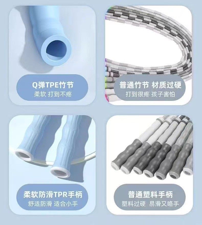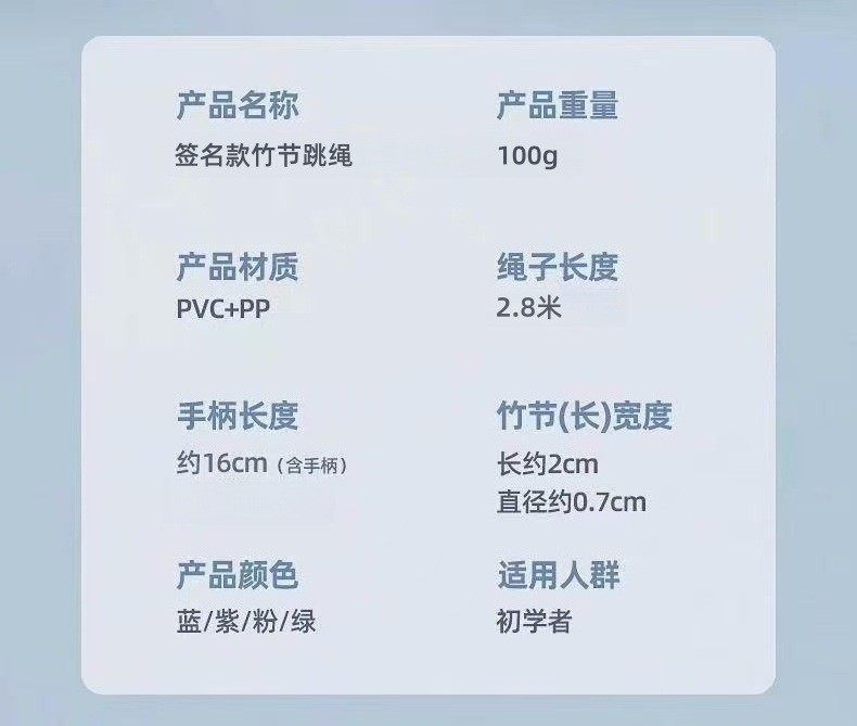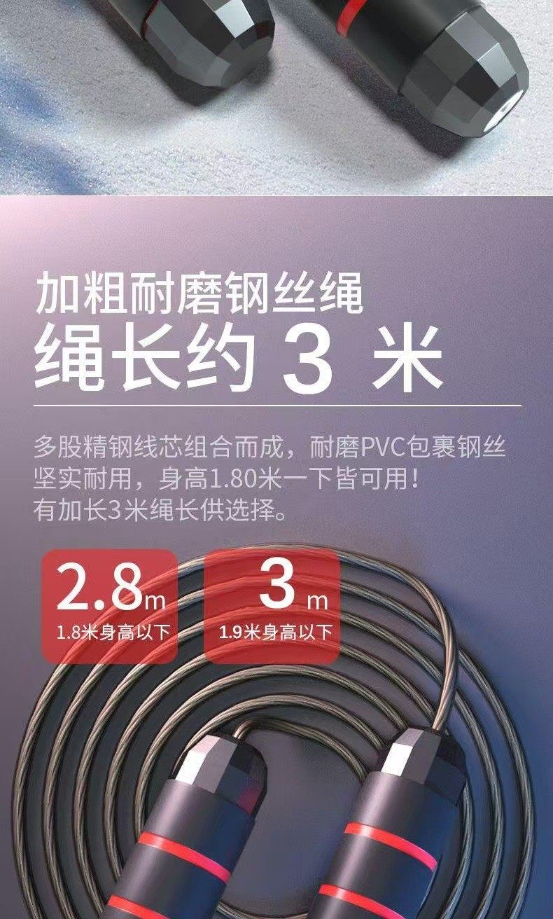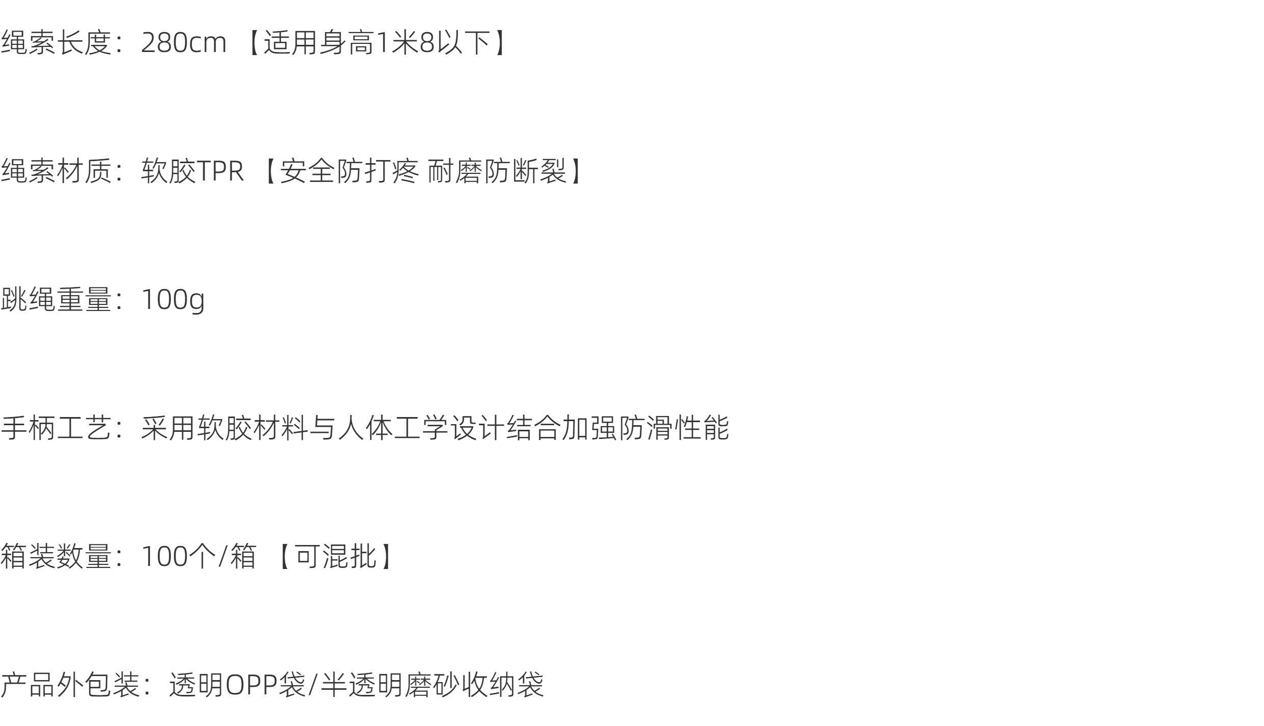 | Color Classification | Pure Black[Steel Wire Type]Abrasion Resistant Anti-Breakage/ 3m Rope Length/No Load,Black and Red[Steel Wire Type]Abrasion Resistant Anti-Breakage/ 3m Rope Length/No Load,Blue-Black[Steel Wire Type]Abrasion Resistant Anti-Breakage/ 3m Rope Length/No Load,[Bamboo Style]-Pink (Soft Rubber Does Not Hurt When Kicking/Can Write Your Name),[Bamboo Style]-Blue (Soft Rubber Does Not Hurt When Kicking/Can Write Your Name),[Bamboo Style]-Green (Soft Rubber Does Not Hurt When Kicking/Can Write Your Name),[Bamboo Style]-Purple (Soft Rubber Does Not Hurt When Kicking/Can Write Your Name),[Bamboo Style 2 Pack]Blue+Pink,[Bamboo Style 2 Pack]Purple+Green,[Speed Up Model]Sakura Pink (Adjustable Sports Style/2.8m Ropes),[Speed Up Model]Lake Blue (Adjustable Sports Model/2.8m Ropes),[Speed Up Model]Vibrant Orange (Adjustable Sports Model/2.8m Ropes),[Speed Up Model]Obsidian Black (Adjustable Sports Model/2.8m Ropes),[Speed Up Model] Fluorescent Yellow (Adjustable Sports Model/2.8m Ropes),[Speed Up Model]Emerald (Adjustable Sports Model/2.8m Ropes),[Speed Boost 2 Pack]Blue+Pink,[Speed Boost 2 Pack]Yellow+Green,[Speed Boost 2 Pack]Black+Orange,Height Enhancer[Pink Unicorn]2.8m Long Rope Adjustable/Cotton Rope Material,Height Enhancer[Princess]2.8m Long Rope Adjustable/Cotton Rope Material,Height Enhancer[Blue Elephant]2.8m Long Rope Adjustable/Cotton Rope Material,Height Enhancer[Green Deer]2.8m Long Rope Adjustable/Cotton Rope Material,Height Enhancer[Buy One Get One Free]Blue+Pink,Height Enhancer[Buy One Get One Free]Blue+Green,Height Enhancer[Buy One Get One Free]Pink+Green,2 Pieces of Height Increasing Tools[Pink Unicorn],2 Pieces of Height Increasing Tools[Blue Elephant],2 Pieces of Height Increasing Tools[Green Deer],10 Jump Ropes (Wholesale for Schools - High Volume) - Colors Can Be Specified in the Order Notes,20 Jump Ropes (Wholesale for Schools - High Volume) - Colors Can Be Specified in the Order Notes,50 Jump Ropes (Wholesale for Schools - High Volume) - Colors Can Be Specified in the Order Notes,[Bamboo Style 10 Pack]Four Colors Mixed Hair (Soft Rubber Does Not Hurt When Kicking/Can Write Your Name),[Speed Boosting Pack of 10]Six-Color Assorted (Adjustable Sports Style / 2-Pack).8m Ropes) |