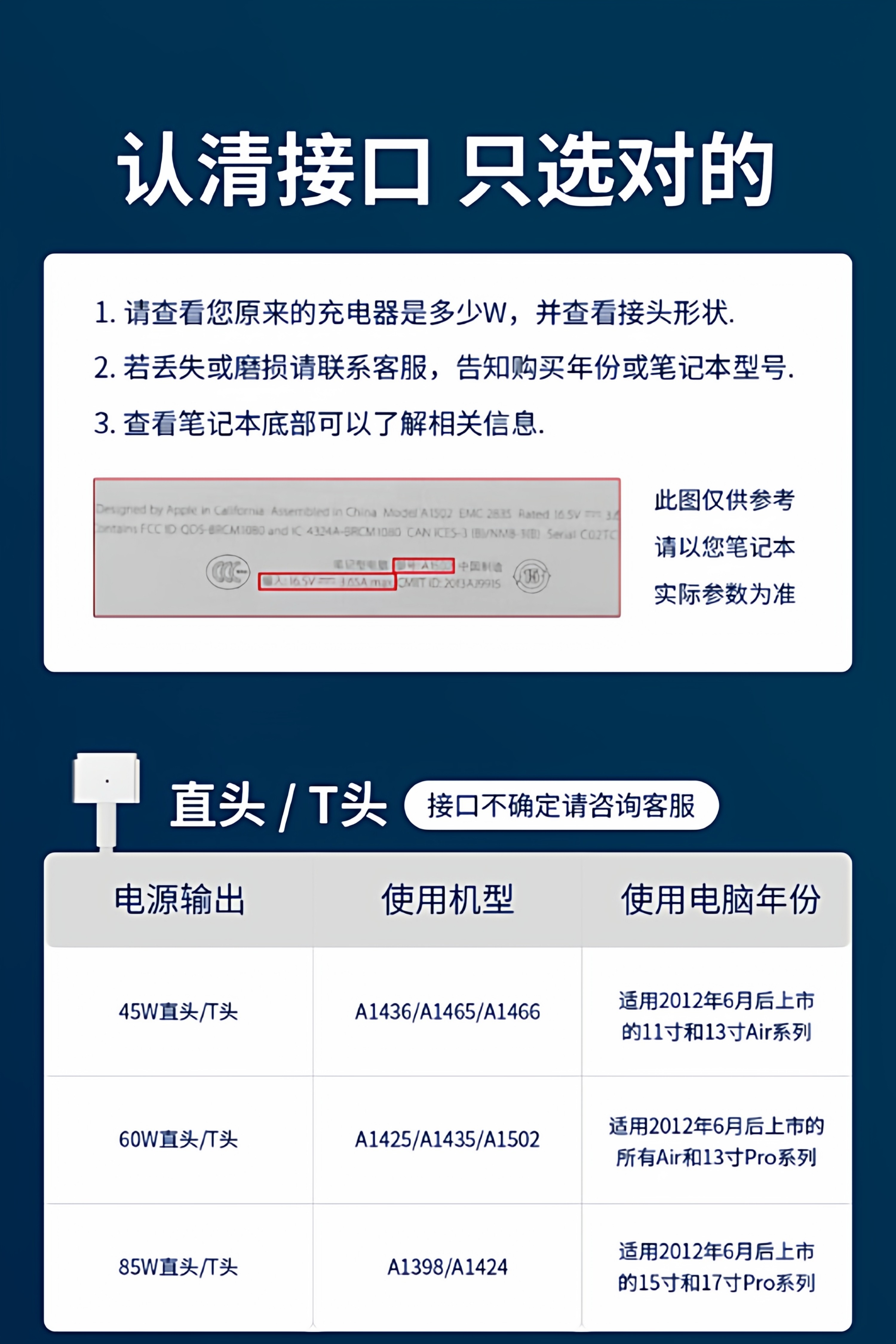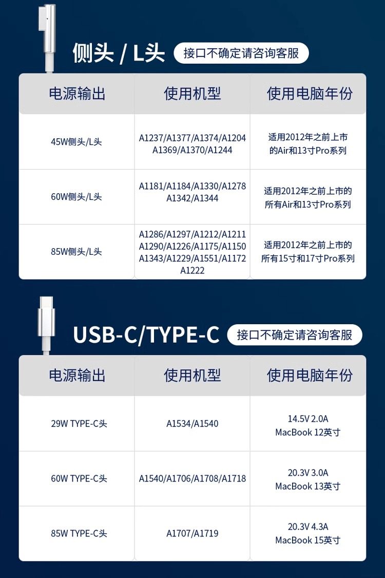 | Color Classification | Type a 45W Side Head/L Head/Generation [3C Certification | Tmall Urgent Delivery],Model B 45W Straight Head/T Head/Second Generation [3C Certification | Tmall Urgent Delivery],C Model 60W Side Head/L Head/Generation [3C Certification | Tmall Urgent Delivery],D Type 60W Straight Head/T Head/Second Generation [3C Certification | Tmall Urgent Delivery],E Type 85W Side Head/L Head/Generation [3C Certification | Tmall Urgent Delivery],F Type 85W Straight Head/T Head/Second Generation [3C Certification | Tmall Urgent Delivery],G Type 29W/30W/Type-C/A1534|A1932 [3C Certification | Tmall Urgent Delivery],H Type 61W/Type-C/A1706 | A1708 [3C Certification | Tmall Urgent Delivery],Type I 87W/Type-C/A1707|A1990 [3C Certification | Tmall Urgent Delivery],V Type 96W/Type-C/A2141|A2166 [3C Certification | Tmall Urgent Delivery],W Third Generation/Magsafe 3 Magnetic Wire (Single Wire) [Tmall Urgent Delivery],X Model Third Generation//87W Charging Head + Magsafe3 Magnetic Cable [3C Certification | Tmall Urgent Delivery],Y Model Third Generation/96W Charging Head + Magsafe3 Magnetic Cable [3C Certification | Tmall Urgent Delivery],Model B 45W Straight Head/T Head/Second Generation [3C Certification | Tmall Urgent Delivery]. |