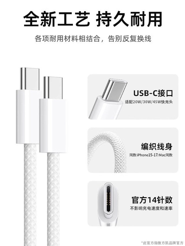 | Color Classification | [Exclusively for Phone15-17]Double Type-C Braided Wire-1.0m,[Exclusively for Phone15-17]Double Type-C Braided Wire-1.5m,[Exclusively for Phone15-17]Double Type-C Braided Wire-2.0m,[Exclusively for Phone15-17]Two-Pack - Dual Type-C Braided Cable - 1.0m,[Exclusively for Phone15-17]Two-Pack - Dual Type-C Braided Cable - 1.5m,[Exclusively for Phone15-17]Two-Pack - Dual Type-C Braided Cable - 2.0m,[New 45W]Usb-C Power Adapter,[Special for Phone15-17 - Braided Wire]45W Fast Charging Head +1.0m Pair of Type-C Braided Cable,[Special for Phone15-17 - Braided Wire]45W Fast Charging Head +1.5m Pair of Type-C Braided Cable,[Special for Phone15-17 - Braided Wire]45W Fast Charging Head +2.0m Pair of Type-C Braided Cable,[Certified 30W]Usb-C Power Adapter,[Special for Phone15-17 - Braided Wire]30W Fast Charging Head +1.0m Pair of Type-C Braided Cable,[Special for Phone15-17 - Braided Wire]30W Fast Charging Head +1.5m Pair of Type-C Braided Cable,[Special for Phone15-17 - Braided Wire]30W Fast Charging Head +2.0m Pair of Type-C Braided Cable,[The Following Options Support Phone8-14]All Models Have Passed the Official Pd Certification,[Exclusively for Phone8-14]Pd Fast Charging Cable-1.0m,[Exclusively for Phone8-14]Pd Fast Charging Cable-1.5m,[Exclusively for Phone8-14]Pd Fast Charging Cable-2.0m,[Exclusively for Phone8-14]Two-Pack-Pd Fast Charging Cable-1.0m,[Exclusively for Phone8-14]Two-Pack-Pd Fast Charging Cable-1.5m,[Exclusively for Phone8-14]Two-Pack-Pd Fast Charging Cable-2.0m,[Phone8-14]Pd30W Charger,[Dedicated Fast Charging Cable for Phone8-14]30W Fast Charging Head +1.0m Pd Fast Charging Cable,[Dedicated Fast Charging Cable for Phone8-14]30W Fast Charging Head +1.5m Pd Fast Charging Cable,[Dedicated Fast Charging Cable for Phone8-14]30W Fast Charging Head +2.0m Pd Fast Charging Cable,[Exclusively for Phone15-17]Double Type-C Braided Wire-1.0m [Do Not Take Tests] |