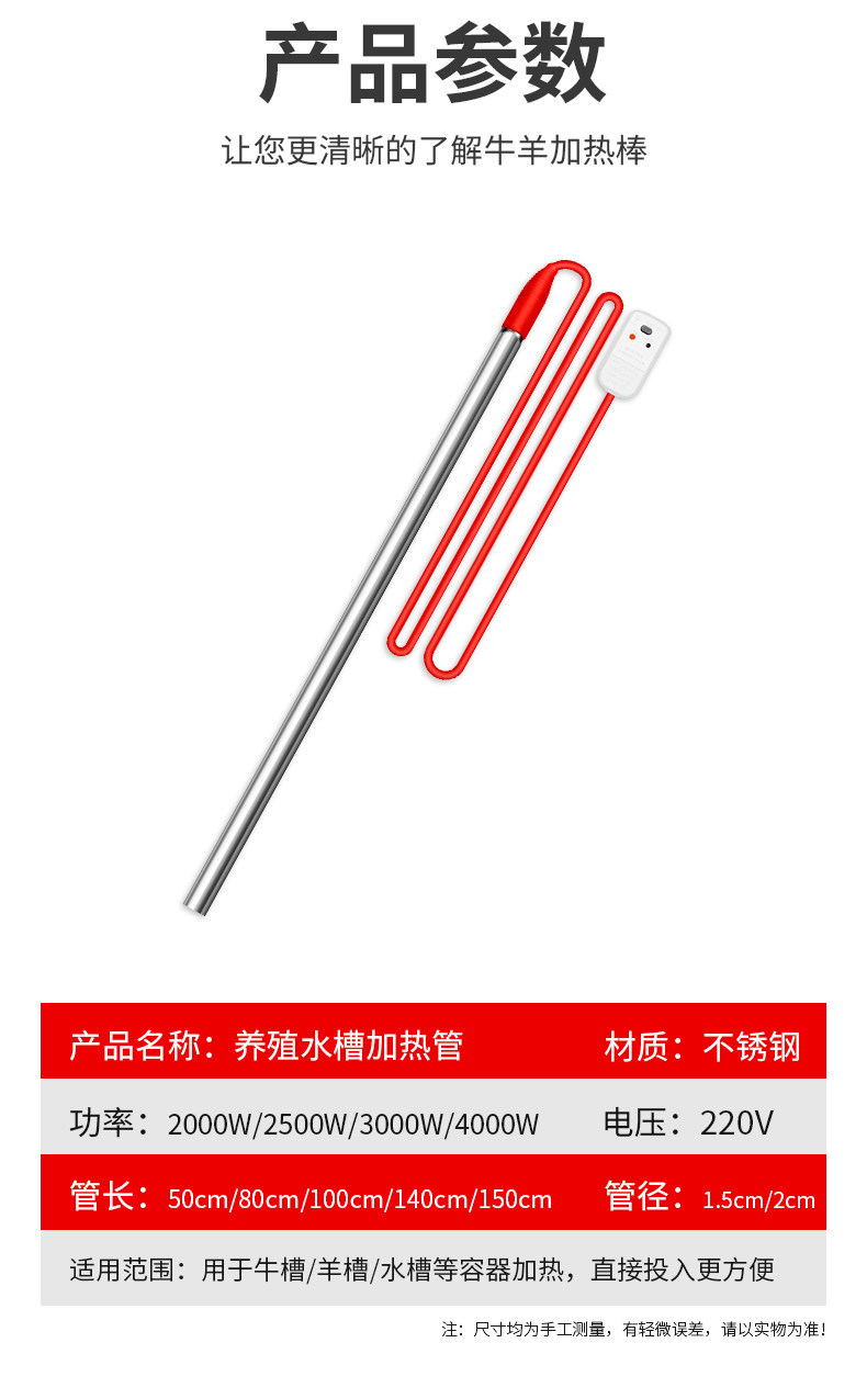 | Color Classification | [Temperature Controlled Model]2000W/30Cm Heating Rod + Leakage Protection + Temperature Control,[Temperature Controlled Model]2000W/50Cm Heating Rod + Leakage Protection + Temperature Control,[Temperature Controlled Model]2000W/80Cm Heating Rod + Leakage Protection + Temperature Control,[Temperature Controlled Model]2000W/100Cm Heating Rod + Leakage Protection + Temperature Control,[Temperature Controlled Model]2000W/140Cm Heating Rod + Leakage Protection + Temperature Control,[Temperature Controlled Model]3000W/30Cm Heating Rod + Leakage Protection + Temperature Control,[Temperature Controlled Model]3000W/50Cm Heating Rod + Leakage Protection + Temperature Control,[Temperature Controlled Model]3000W/80Cm Heating Rod + Leakage Protection + Temperature Control,[Temperature Controlled Model]3000W/100Cm Heating Rod + Leakage Protection + Temperature Control,[Temperature Controlled Model]3000W/140Cm Heating Rod + Leakage Protection + Temperature Control,[With Anti-Bite Tube]2000W/30Cm Heating Rod + Leakage Protection + Temperature Control + 1.5m Anti-Bite Tube for Cattle and Sheep,[With Anti-Bite Tube]2000W/50Cm Heating Rod + Leakage Protection + Temperature Control + 1.5m Anti-Bite Tube for Cattle and Sheep,[With Anti-Bite Tube]2000W/80Cm Heating Rod + Leakage Protection + Temperature Control + 1.5m Anti-Bite Tube for Cattle and Sheep,[With Anti-Bite Tube]2000W/100Cm Heating Rod + Leakage Protection + Temperature Control + 1.5m Anti-Bite Tube for Cattle and Sheep,[With Anti-Bite Tube]2000W/140Cm Heating Rod + Leakage Protection + Temperature Control + 1.5m Anti-Bite Tube for Cattle and Sheep,[With Anti-Bite Tube]3000W/30Cm Heating Rod + Leakage Protection + Temperature Control + 1.5m Anti-Bite Tube for Cattle and Sheep,[With Anti-Bite Tube]3000W/50Cm Heating Rod + Leakage Protection + Temperature Control + 1.5m Anti-Bite Tube for Cattle and Sheep,[With Anti-Bite Tube]3000W/80Cm Heating Rod + Leakage Protection + Temperature Control + 1.5m Anti-Bite Tube for Cattle and Sheep,[With Anti-Bite Tube]3000W/100Cm Heating Rod + Leakage Protection + Temperature Control + 1.5m Anti-Bite Tube for Cattle and Sheep,[With Anti-Bite Tube]3000W/140Cm Heating Rod + Leakage Protection + Temperature Control + 1.5m Anti-Bite Tube for Cattle and Sheep |