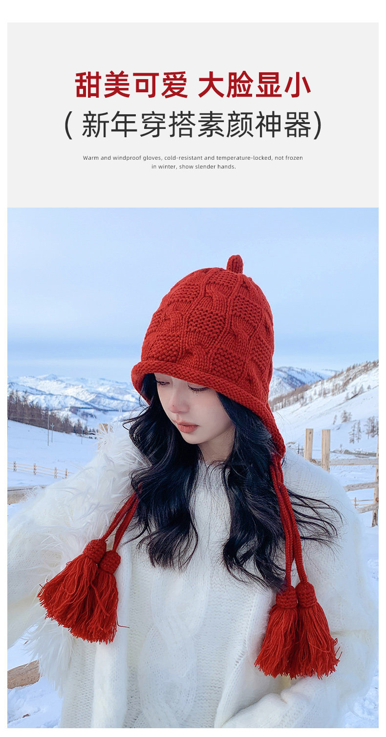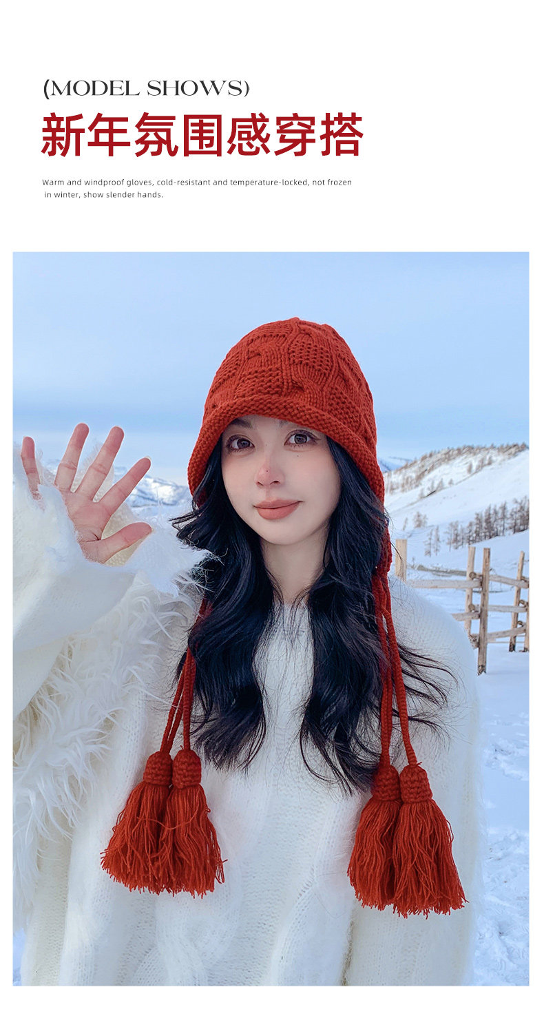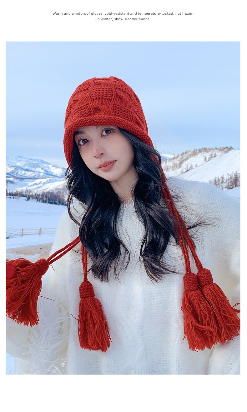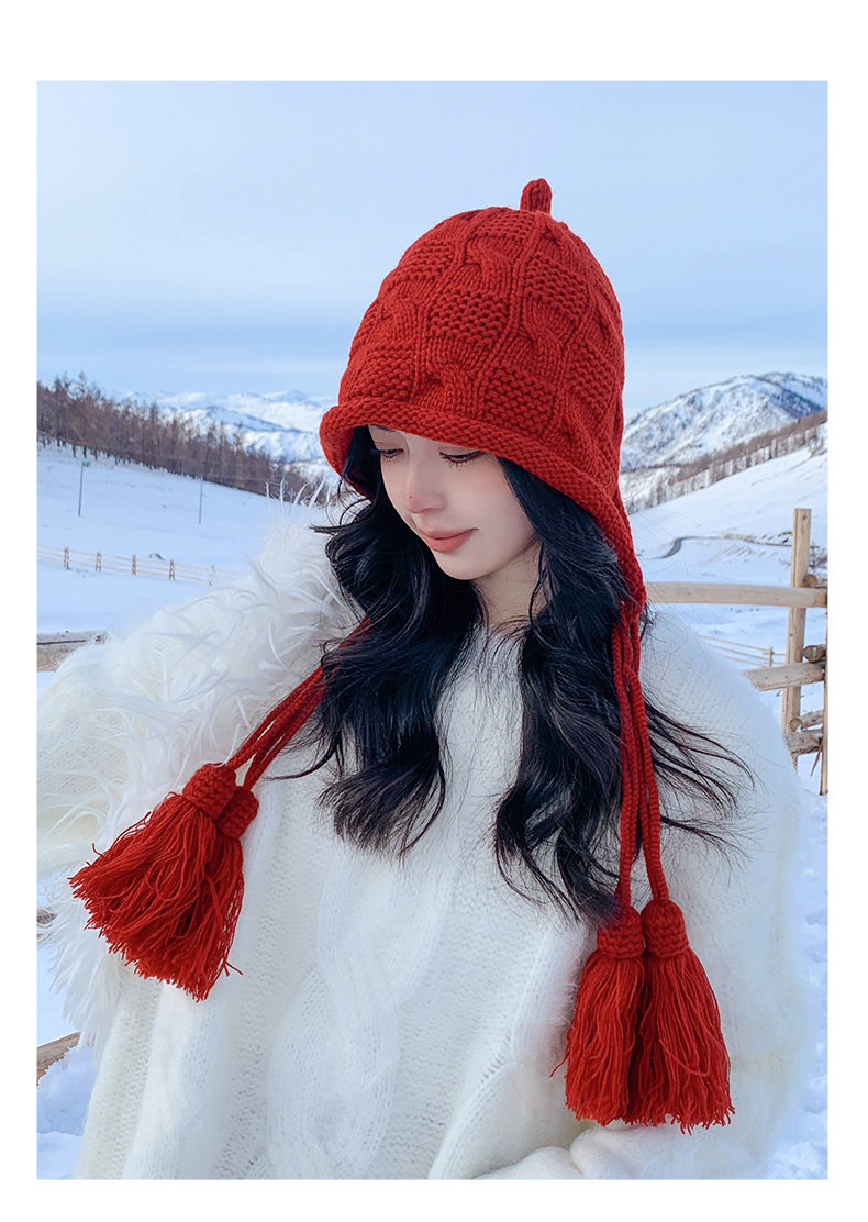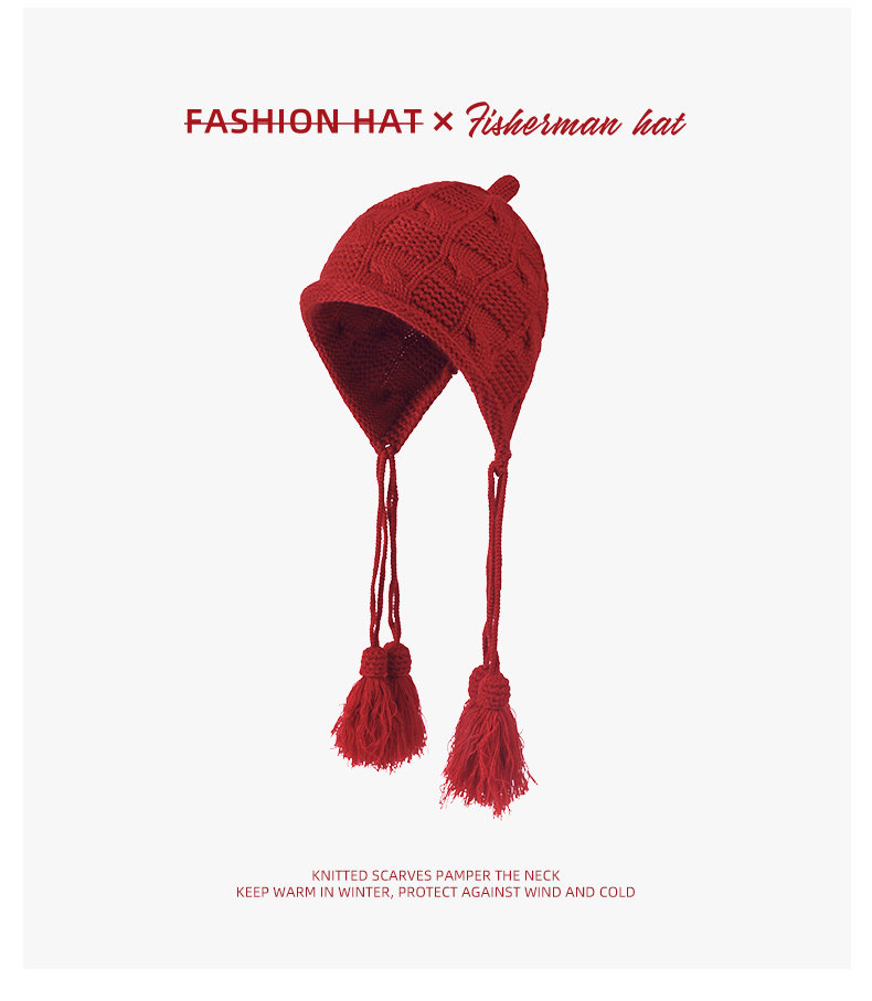 Sichuan Western Tourism Red Tassel Knitted Hat for Women, Autumn and Winter Outing Outfit, Grassland Wool Hat, Hollow-Out Headwrap Hat