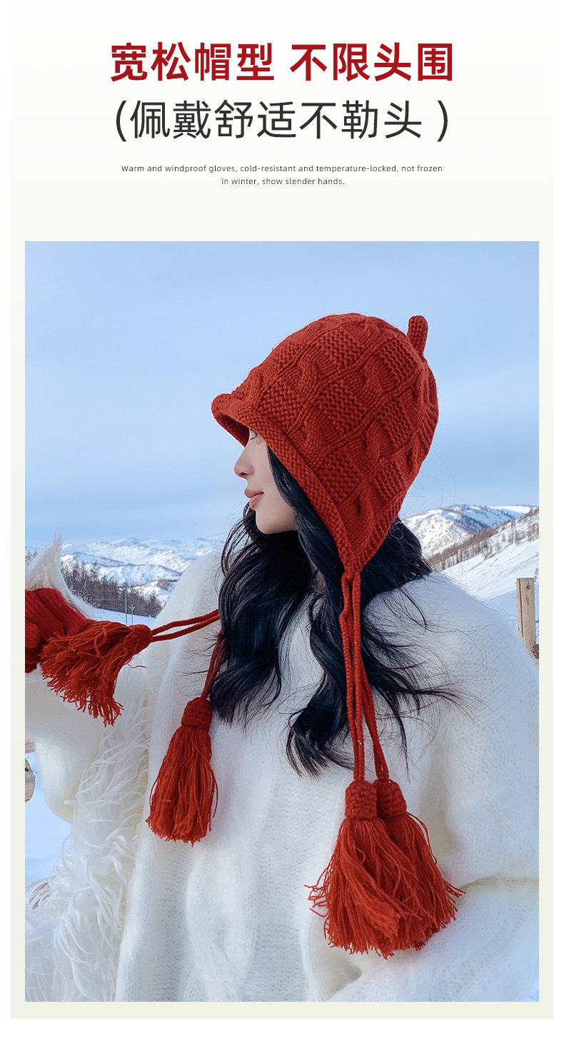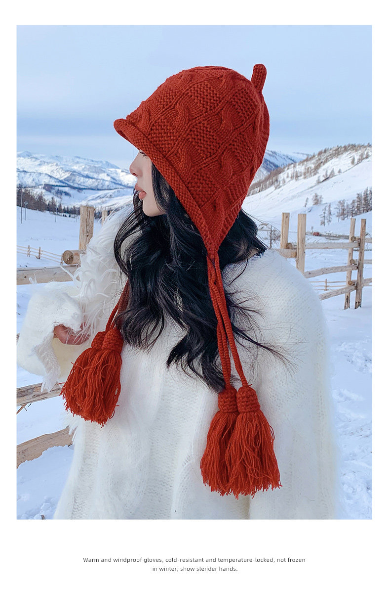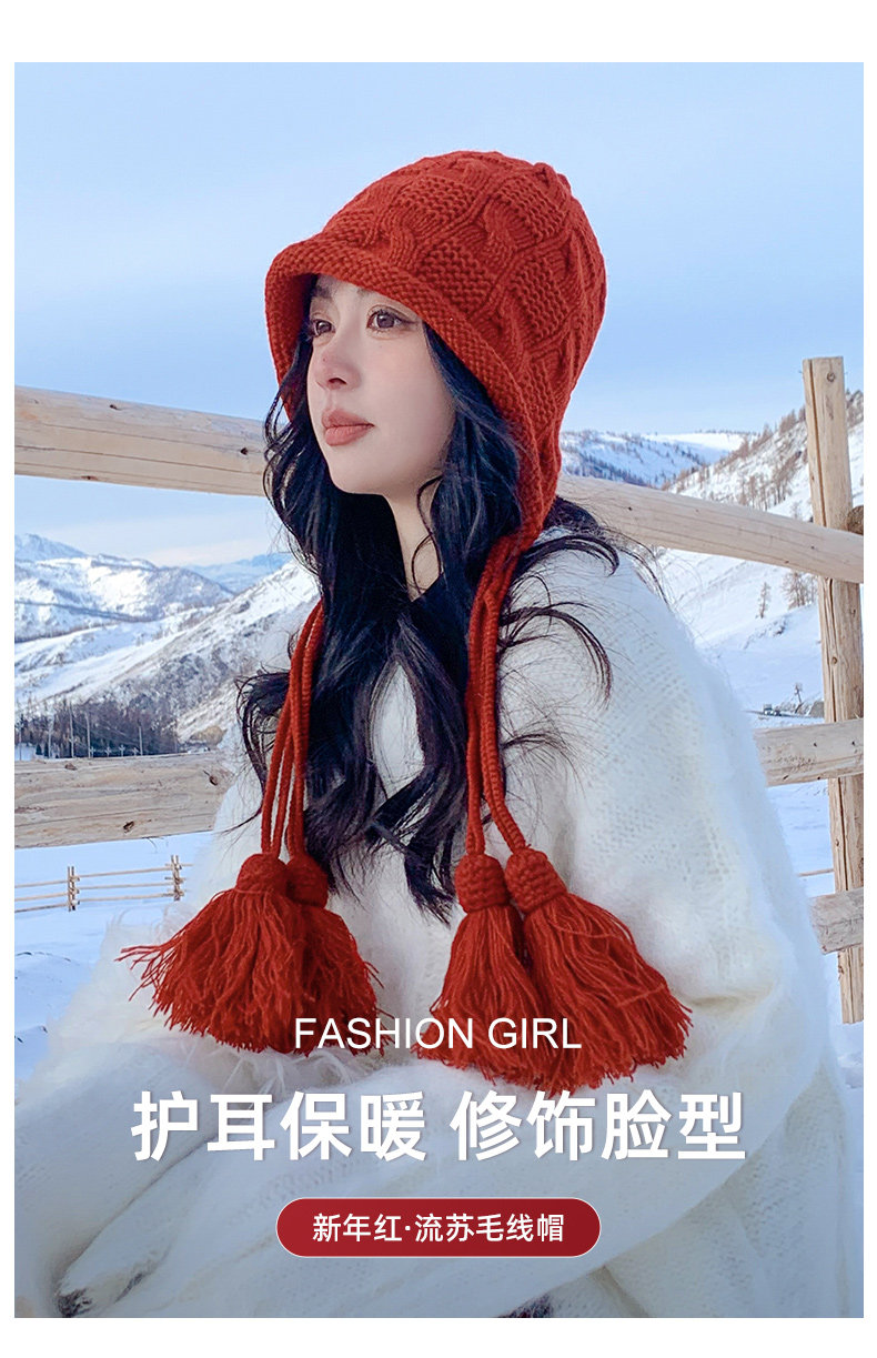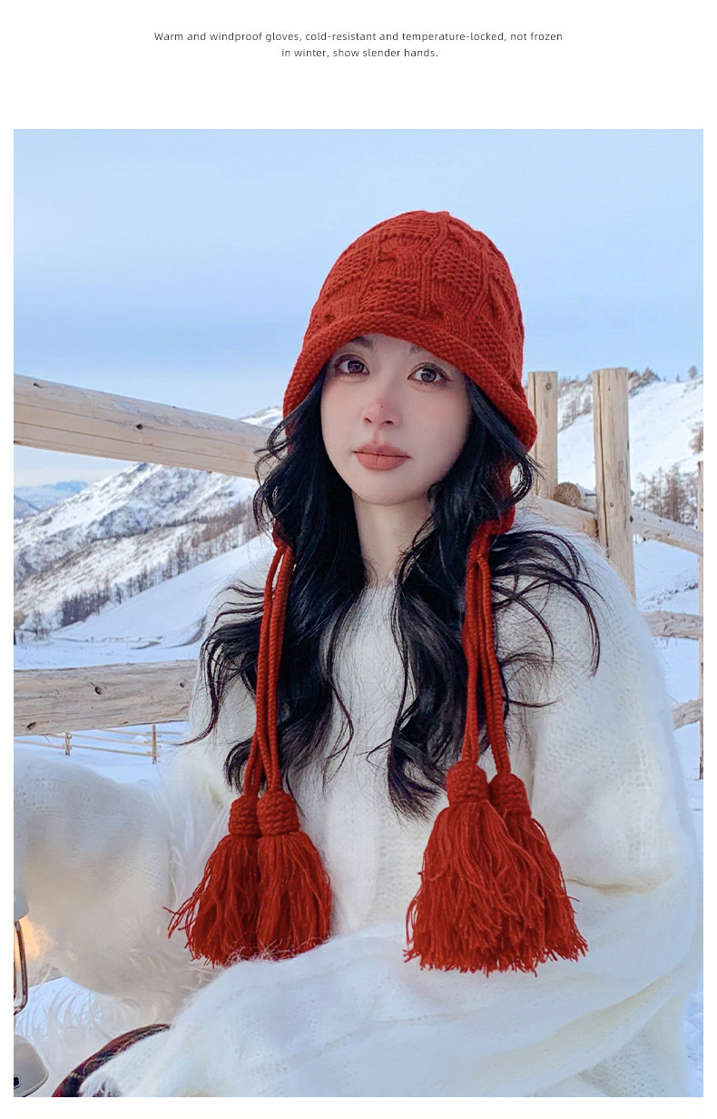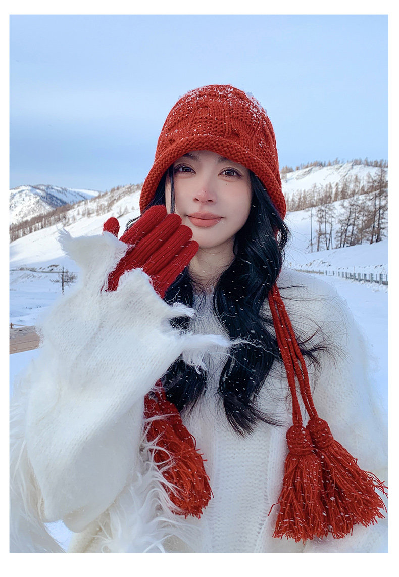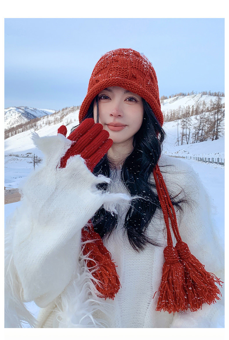 Sichuan Western Tourism Red Tassel Knitted Hat for Women, Autumn and Winter Outing Outfit, Grassland Wool Hat, Hollow-Out Headwrap Hat