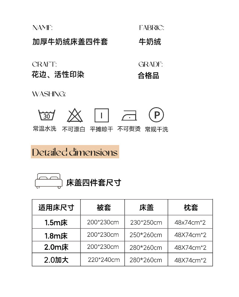 | Applicable Bed Size | 1.5m Bed Four-Piece Set [Quilt Cover 200X230Cm + Bed Cover 230*250cm + 2 Pillowcases],1.8m Bed Four-Piece Set [Quilt Cover 200X230Cm + Bed Cover 250*260cm + 2 Pillowcases],2.0m Bed Four-Piece Set [Quilt Cover 220X240Cm + Bed Cover 250*260cm + 2 Pillowcases] |