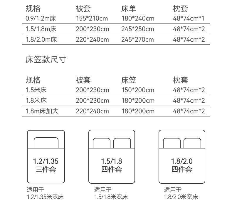 | Applicable Bed Size | 1.2m Bed Sheet Three-Piece Set [Quilt Cover 150*200Cm/Sheets 200*230Cm/Pillowcase 48*74cm*1],1.5m Bed Sheet Four-Piece Set [Quilt Cover 200*230Cm/Sheets 245*250Cm/Pillowcase 48*74cm*2],1.8m Bed Sheet Four-Piece Set [Quilt Cover 200*230Cm/Sheets 245*250Cm/Pillowcase 48*74cm*2],2.0m Bed Sheet Four-Piece Set [Quilt Cover 220*240Cm/Sheets 245*270Cm/Pillowcase 48*74cm*2],1.5m Fitted Sheet Set of Four [Quilt Cover 200*230Cm/Fitted Sheet 150*200Cm/Pillowcase 48*74cm*2],1.8m Fitted Sheet Set of Four [Quilt Cover 200*230Cm/Fitted Sheet 180*200Cm/Pillowcase 48*74cm*2],1.8m Fitted Sheet Set of Four [Quilt Cover 220*240Cm/Fitted Sheet 180*200Cm/Pillowcase 48*74cm*2] |
