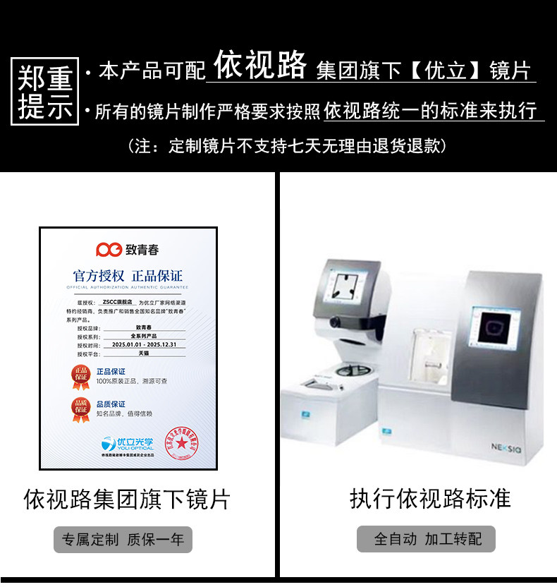 | Lens Refractive Index | Frame + 0-Degree Anti-Blue Light Lenses [Can Be Tried on for 7 Days and Can Be Returned or Exchanged Without Any Reason],Frame + 1.56 Anti-Blue Light Radiation Lens [Suitable for 0-300 Degrees],Frame + 1.61 Anti-Blue Light Radiation Lens [Suitable for 0-500 Degrees],Frame + 1.67 Anti-Blue Light Radiation Lens [Suitable for 0-800 Degrees],Frame + 1.74 Anti-Blue Light Radiation Lens [Suitable for 0-1200 Degrees],Frame + 1.56 Aspherical Radiation-Proof Lens [Suitable for 0-300 Degrees],Frame + 1.61 Aspherical Anti-Radiation Lens [Suitable for 0-500 Degrees],Frame + 1.67 Aspherical Radiation-Proof Lens [Suitable for 0-800 Degrees],Frame + 1.74 Aspherical Radiation-Proof Lens [Suitable for 0-1200 Degrees],Equipped with [Essilor] Yuli 1.56 Multi-Screen Anti-Blue Light Lenses [Suitable for 0-300],Equipped with [Essilor] Yuli 1.60 Multi-Screen Anti-Blue Light Lenses [Suitable for 0-500],Equipped with [Essilor] Yuli 1.67 Multi-Screen Anti-Blue Light Lenses [Suitable for 0-800],Equipped with [Essilor] Yuli 1.74 Multi-Screen Anti-Blue Light Lenses [Suitable for 0-1200],Equipped with [Essilor] Yuli 1.56 Daily Anti-Radiation Lenses [Suitable for 0-300],Equipped with [Essilor] Yuli 1.60 Daily Anti-Radiation Lenses [Suitable for 0-500],Equipped with [Essilor] Yuli 1.67 Daily Anti-Radiation Lenses [Suitable for 0-800],Equipped with [Essilor] Yuli 1.74 Daily Anti-Radiation Lenses [Suitable for 0-1200],↓[Photochromic Lenses]↓Sun Protection and Uv Protection↓,Frame + [Grey/Tea] 1.56 Anti-Blue Light and Anti-Uv Lenses [Suitable for 0-300],Frame + [Grey/Tea] 1.61 Anti-Blue Light and Anti-Uv Lenses [Suitable for 0-500],Frame + [Grey/Tea] 1.67 Anti-Blue Light and Anti-Uv Lenses [Suitable for 0-800],Frame + [Grey/Tea] 1.74 Anti-Blue Light and Anti-Uv Lenses [Suitable for 0-1200],↓【Officially Licensed by Zeiss】↓ Authenticity Guaranteed: Get 10X Your Money Back if It's Fake. Lens Packaging Included.,Equipped with [Zeiss Vision] 1.56 High-Definition Aspherical [Applicable to 0-300 Degrees],Equipped with [Zeiss Vision] 1.60 High-Definition Aspherical [Applicable to 0-500 Degrees],Equipped with [Zeiss Vision] 1.67 High-Definition Aspherical [Applicable to 0-800 Degrees],Equipped with [Zeiss Vision] 1.56 High-Definition Anti-Blue Light [Applicable to 0-300 Degrees],Equipped with [Zeiss Vision] 1.60 High-Definition Anti-Blue Light [Applicable to 0-500 Degrees],Equipped with [Zeiss Vision] 1.67 High-Definition Anti-Blue Light [Applicable to 0-800 Degrees] |