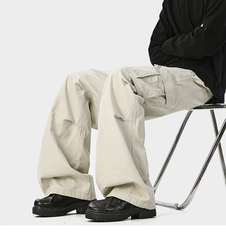 American-Style Workwear Blue Cargo Pants for Men, Trendy Brand, High-End Feel, Multi-Pocket, Pure Cotton, Pleated, Straight-Leg, Wide-Leg Pants for Autumn