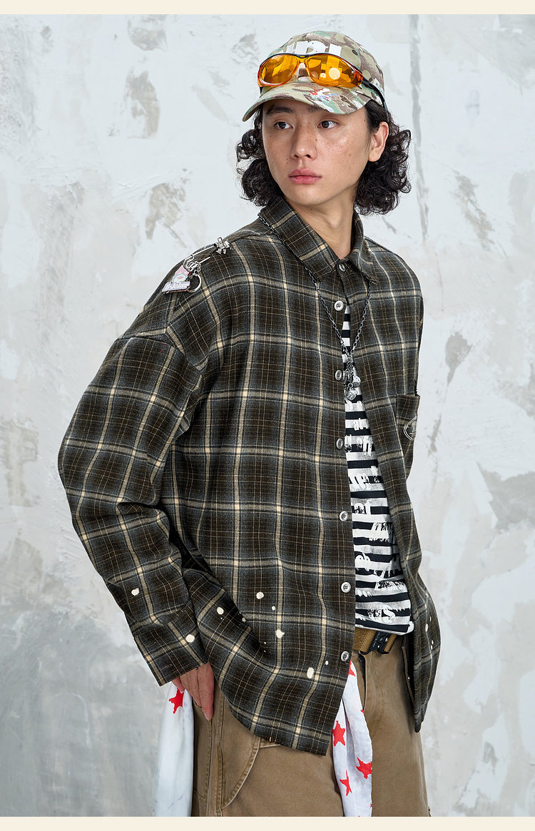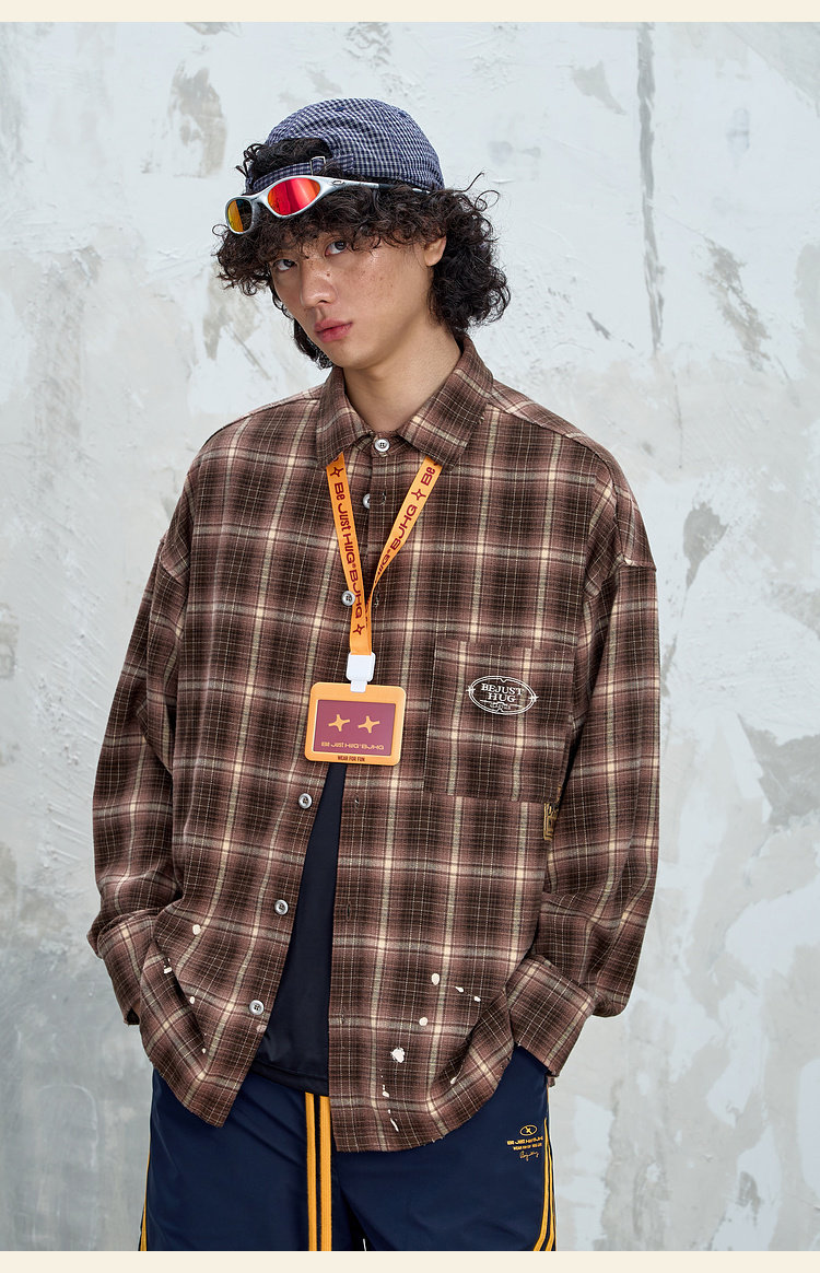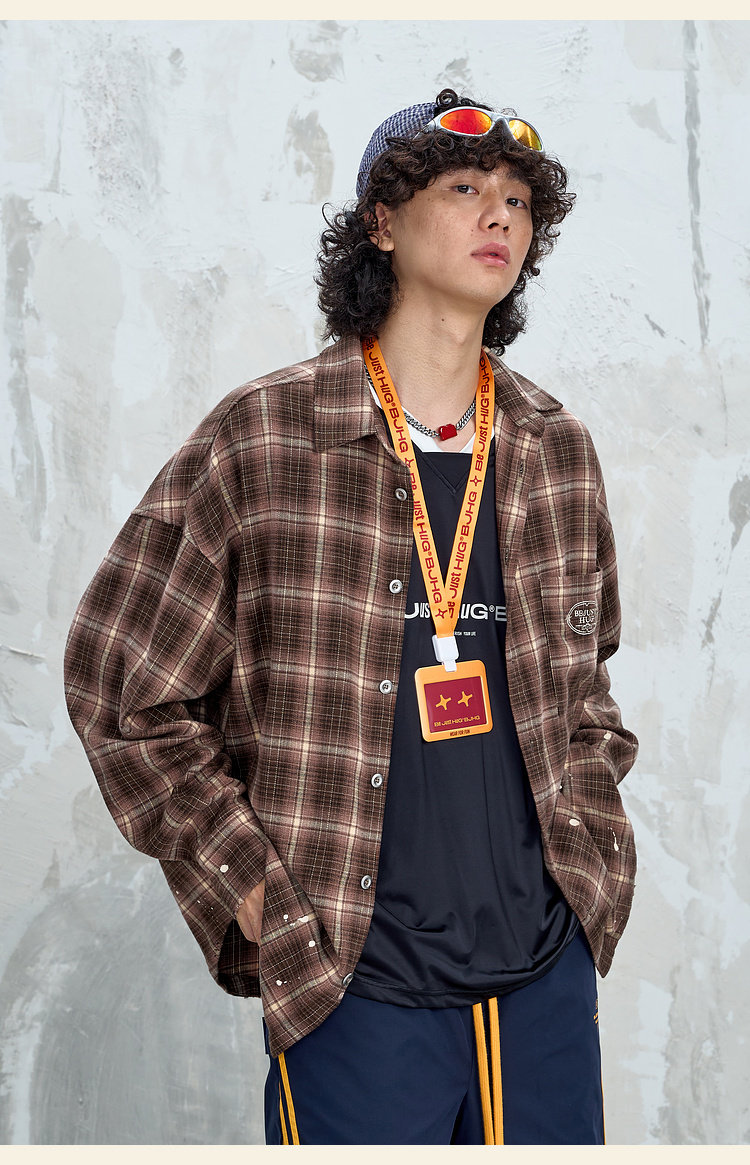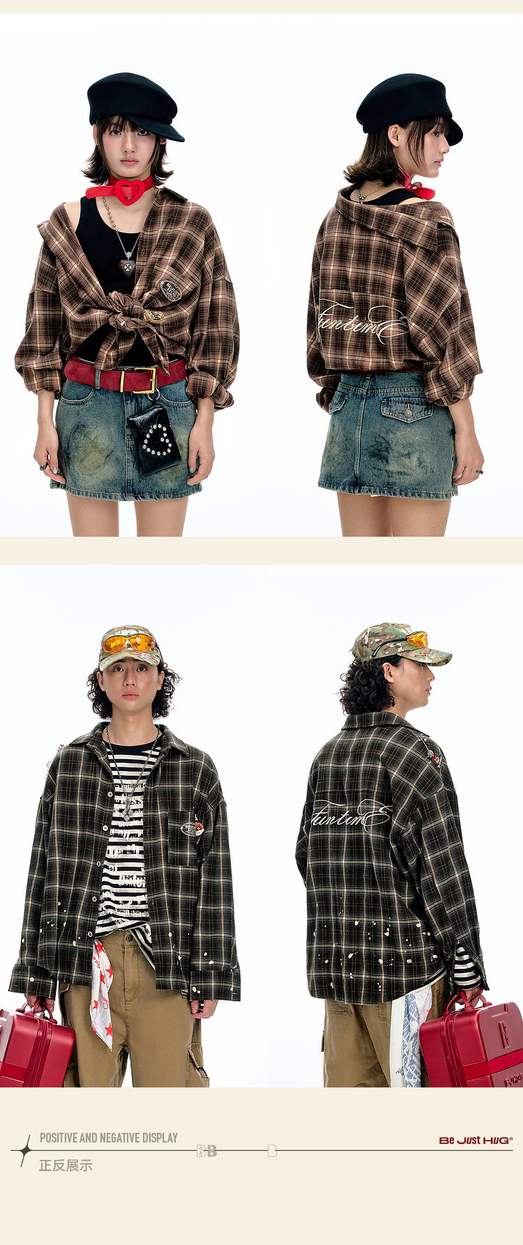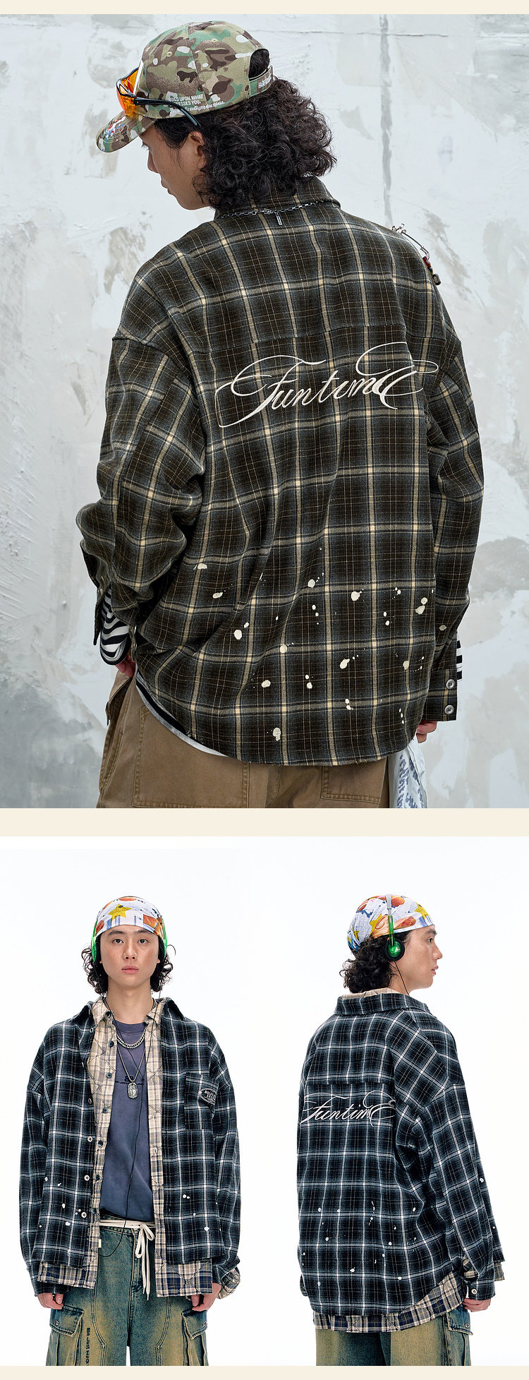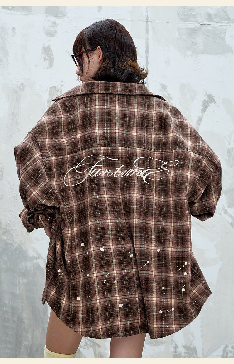Bjhg Reckless Retro Plaid Shirt Jacket for Men, Autumn and Winter Trendy Brand Splatter Ink Loose Casual Shirt Jacket for Women
