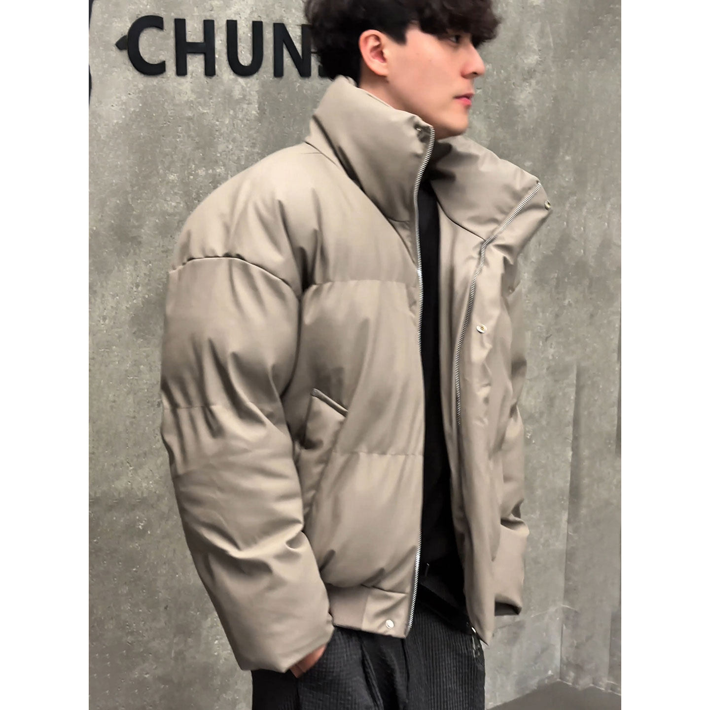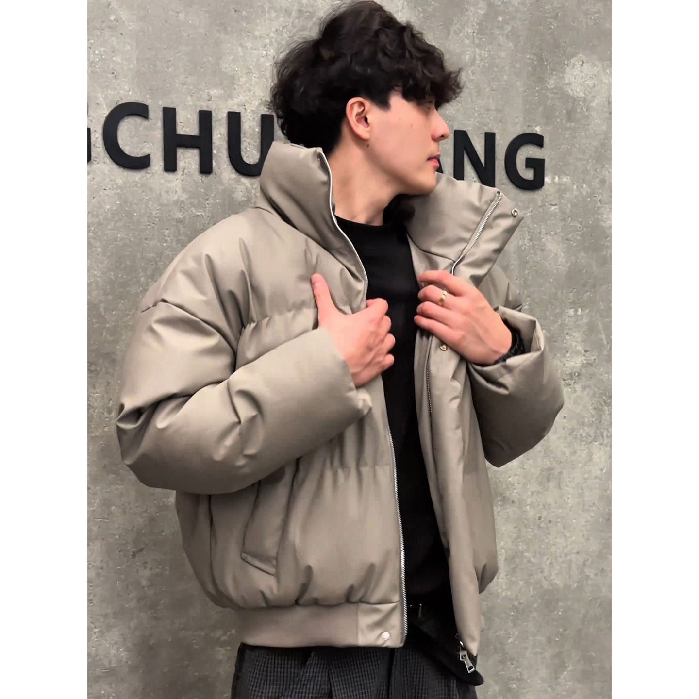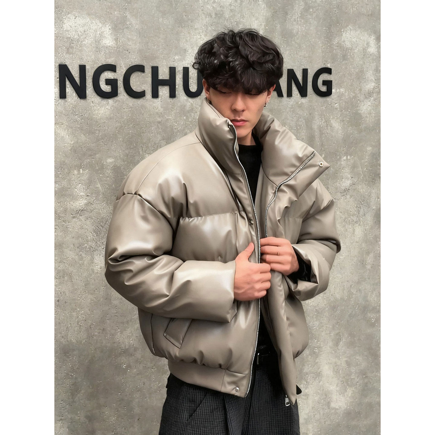 American Retro Pu Leather down Cotton Jacket for Men, Winter Stand-Up Collar Warm Coat, High-End Stylish Short Puffer Jacket