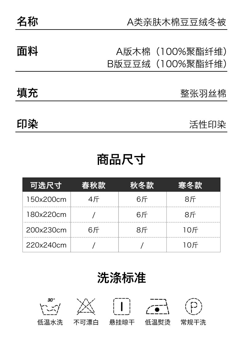| Size | 100X150Cm [Net Weight 1.25kg Suitable for Room Temperature 18-27℃】,150X200Cm Spring/Autumn Quilt [Net Weight 1.75kg] - Ideal for Room Temperatures of 15-25°C (59-77°F) ℃ 】,150X200Cm Autumn and Winter Quilt [Net Weight 2.75kg Suitable for Room Temperature 0-10℃ 】,150X200Cm Thickened Winter Quilt [Net Weight 3.75kg Suitable for Room Temperature 0℃ Following],180X220Cm Spring/Autumn Quilt [Net Weight 2.75kg] - Ideal for Room Temperatures of 5-10°C (41-50°F)℃】,180X220Cm Winter Quilt [Net Weight 3.75kg Suitable for Room Temperature 0-5℃ 】,180X220Cm Thickened Winter Quilt [Net Weight 4.75kg Suitable for Room Temperature 0℃Following],200X230Cm Spring/Autumn Quilt [Net Weight 2.75kg] - Ideal for Room Temperatures of 11-20°C (52-68°F)℃】,200X230Cm Winter Quilt [Net Weight 3.75kg Suitable for Room Temperature 5-10℃】,200X230Cm Thickened Winter Quilt [Net Weight 4.75kg Suitable for Room Temperature 0℃Following],220X240Cm Winter Quilt [Net Weight 3.75kg Suitable for Room Temperature 5-10℃】,220X240Cm Thickened Winter Quilt [Net Weight 4.75kg Suitable for Room Temperature 0℃Following] |