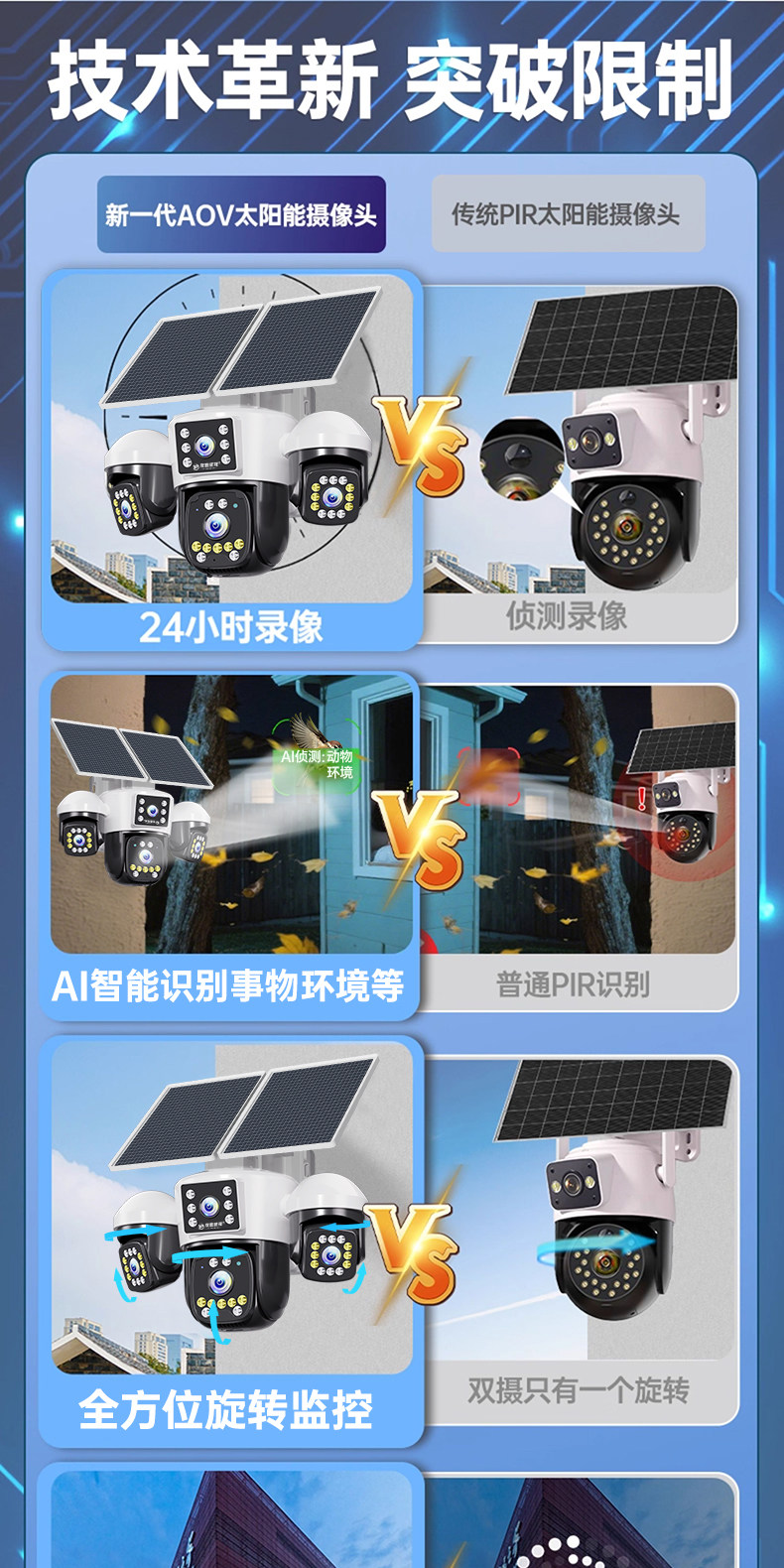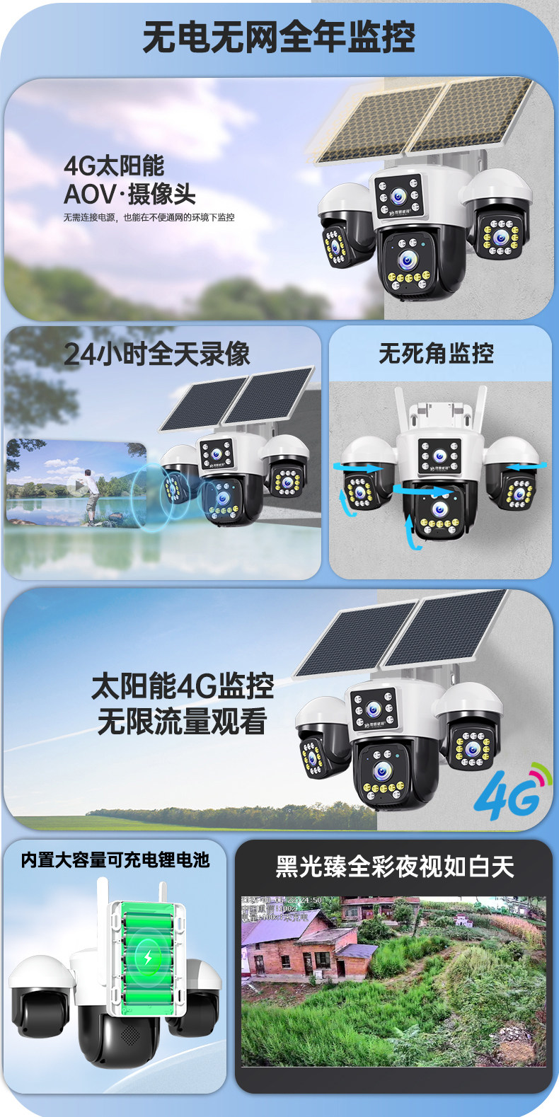 Aov Solar-Powered Surveillance Camera 360-Degree No Blind Spots Mobile Remote Outdoor High-Definition 4g No Electricity No Internet