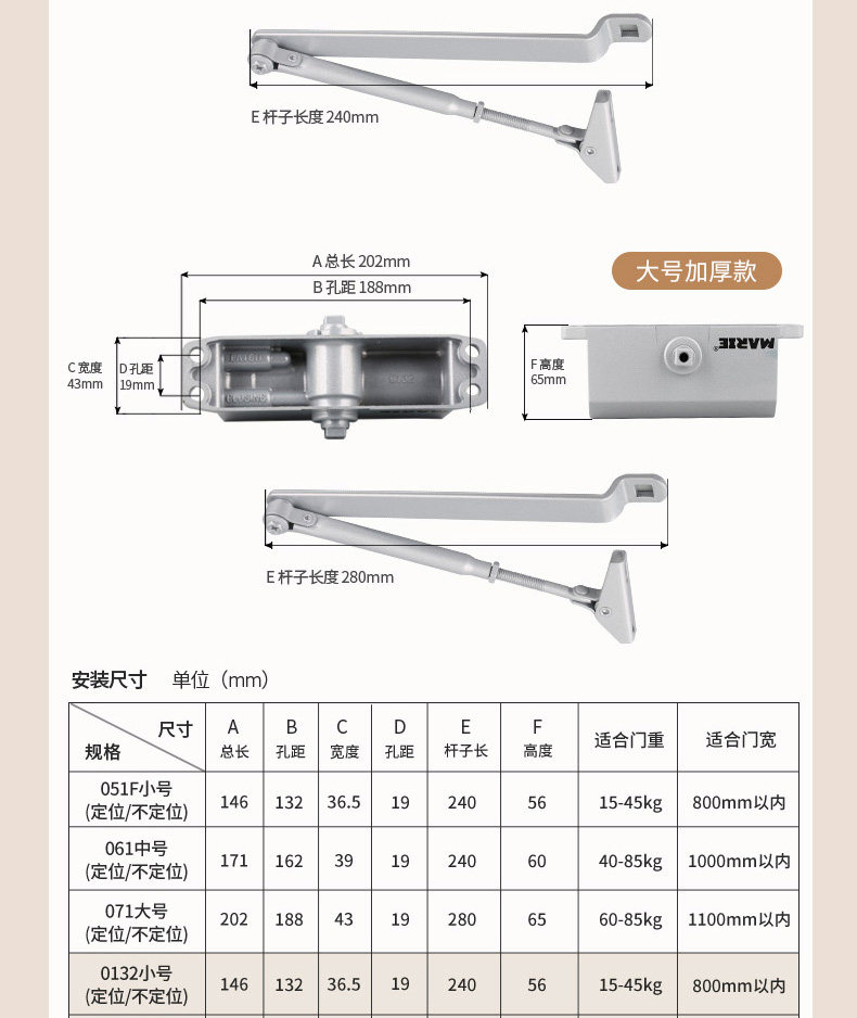 | Color Classification | [Engineering Model] Suitable for Door Weight 15-45kg, Silver Small Size, No Positioning,[Engineering Model] Suitable for Door Weight 40-85kg, Silver Medium Size, No Positioning,[Engineering Model] Suitable for Door Weight 60-85kg, Silver Large Size, No Positioning,ćPremium QualityćSuitable for Door Weights 15-45kg, Silver, Small Size, Non-Positioning,[Quality Model] Suitable for Door Weight 40-85kg, Silver Medium Size, No Positioning,[Quality Model] Suitable for Door Weight 60-85kg, Silver Large Size, No Positioning,ćPremium QualityćSuitable for Door Weights 15-45kg, Black, Small Size, Non-Positioning,[Quality Model] Suitable for Door Weight 40-85kg, Black Medium Size, No Positioning,[Quality Model] Suitable for Door Weight 60-85kg, Black Large Size, No Positioning,[Engineering Model] Suitable for Door Weight 15-45kg Silver Small Size Positioning,[Engineering Model] Suitable for Door Weight 40-85kg Silver Medium Size Positioning,[Engineering Model] Suitable for Door Weight 60-85kg Silver Large Size Positioning,ćPremium QualityćSuitable for Door Weights 15-45kg, Silver, Small Size, Fixed Positioning,[Quality Model] Suitable for Door Weight 40-85kg Silver Medium Size Positioning,[Quality Model] Suitable for Door Weight 60-85kg Silver Large Size Positioning,ćPremium QualityćSuitable for Door Weights 15-45kg, Black, Small Size, Fixed Positioning,[Quality Model] Suitable for Door Weight 40-85kg Black Medium Size Positioning,[Quality Model] Suitable for Door Weight 60-85kg Black Large Size Positioning |