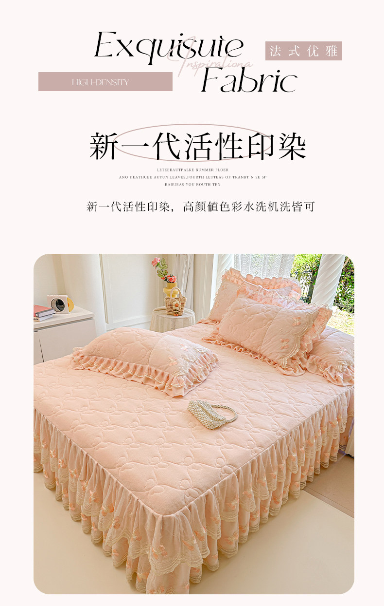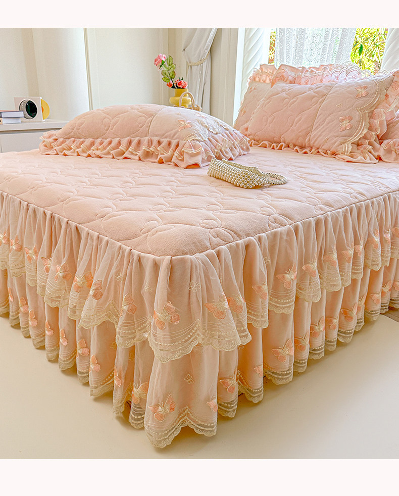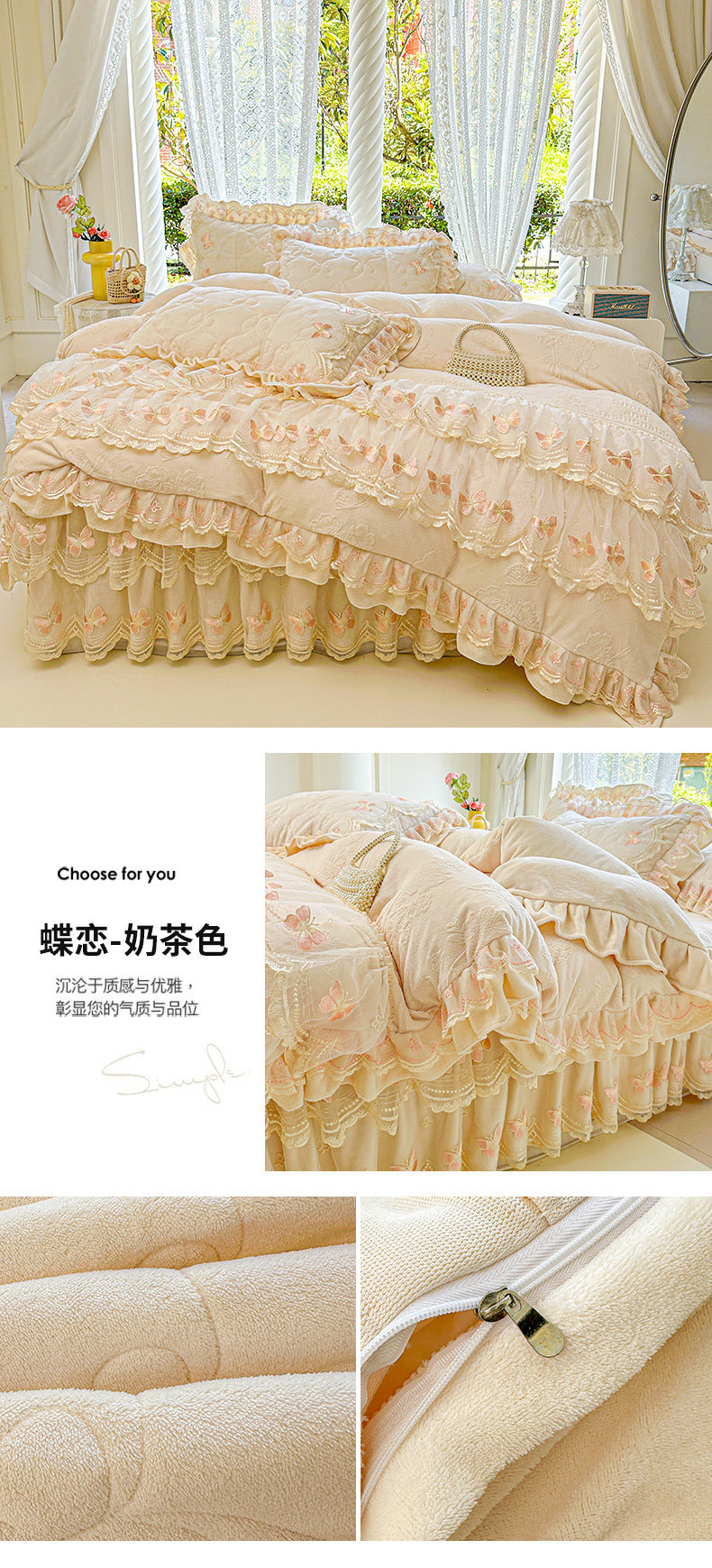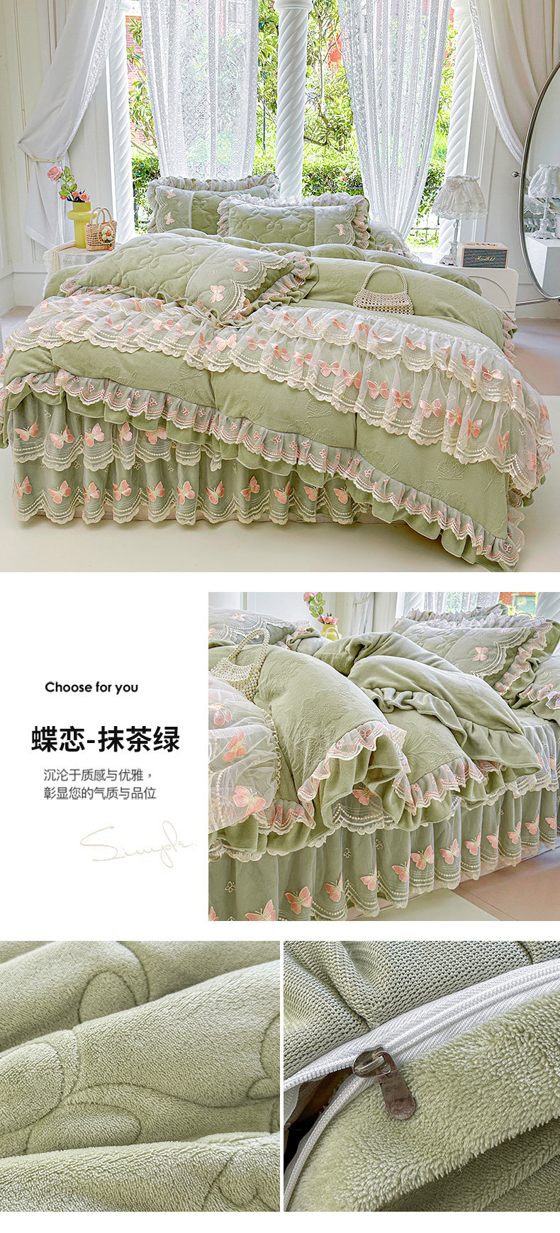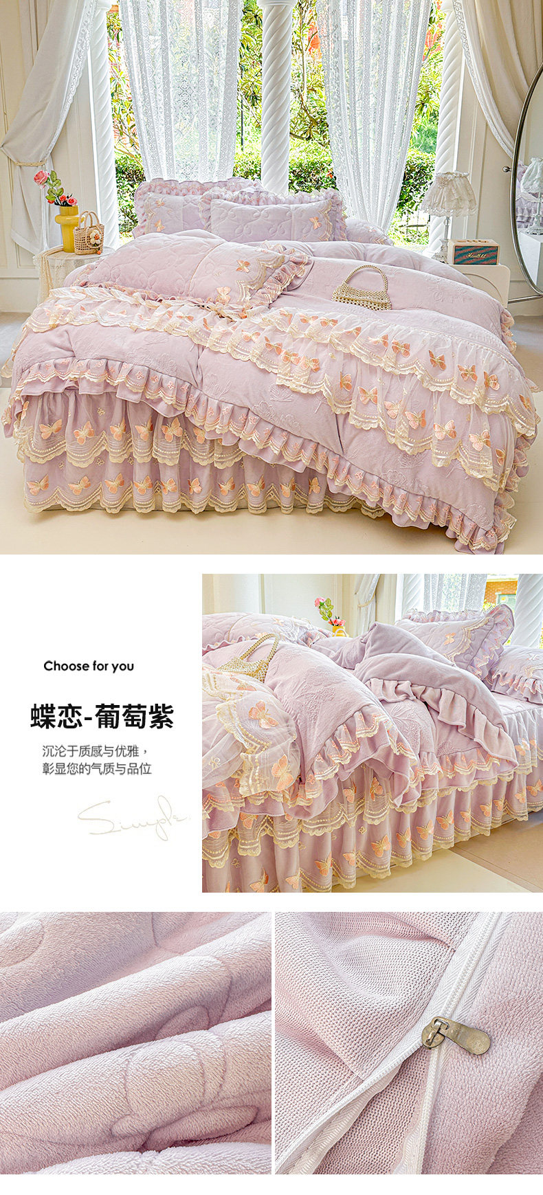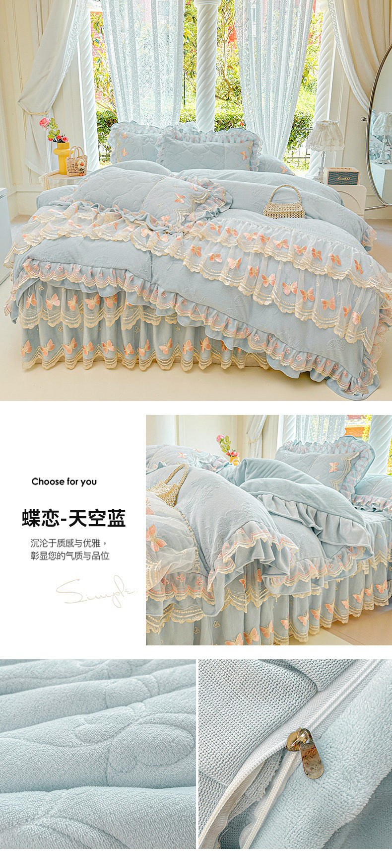 Quilted Warm Milk Velvet Bed Skirt Four-Piece Set Princess Style Lace Trim Double-Sided Fleece Duvet Cover Thickened Bed Skirt