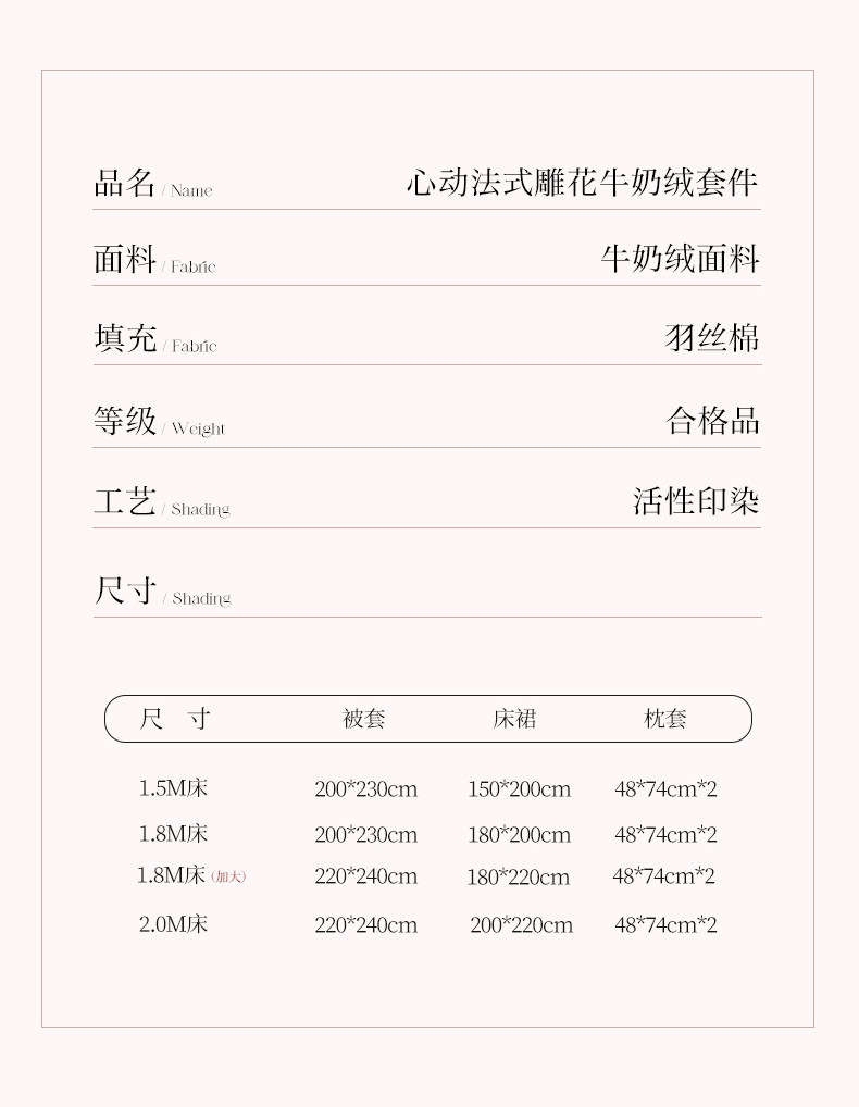 | Applicable Bed Size | 1.5X2.0m Bed Skirt Four-Piece Set[Matching Quilt Cover 200X230Cm],1.8X2.0m Bed Skirt Four-Piece Set[Matching Quilt Cover 200X230Cm],1.8X2.2m Bed Skirt Four-Piece Set[Matching Quilt Cover 200X230Cm],2.0X2.2m Bed Skirt Four-Piece Set[Matching Quilt Cover 200X230Cm],1.8X2.0m Bed Skirt Four-Piece Set[Matching Quilt Cover 220X240Cm],1.8X2.2m Bed Skirt Four-Piece Set[Matching Quilt Cover 220X240Cm],2.0X2.2m Bed Skirt Four-Piece Set[Matching Quilt Cover 220X240Cm],200X230Cm Single Piece Quilt Cover[Excluding Bed Skirt and Pillowcases],220X240Cm Single Piece Quilt Cover[Excluding Bed Skirt and Pillowcases] |