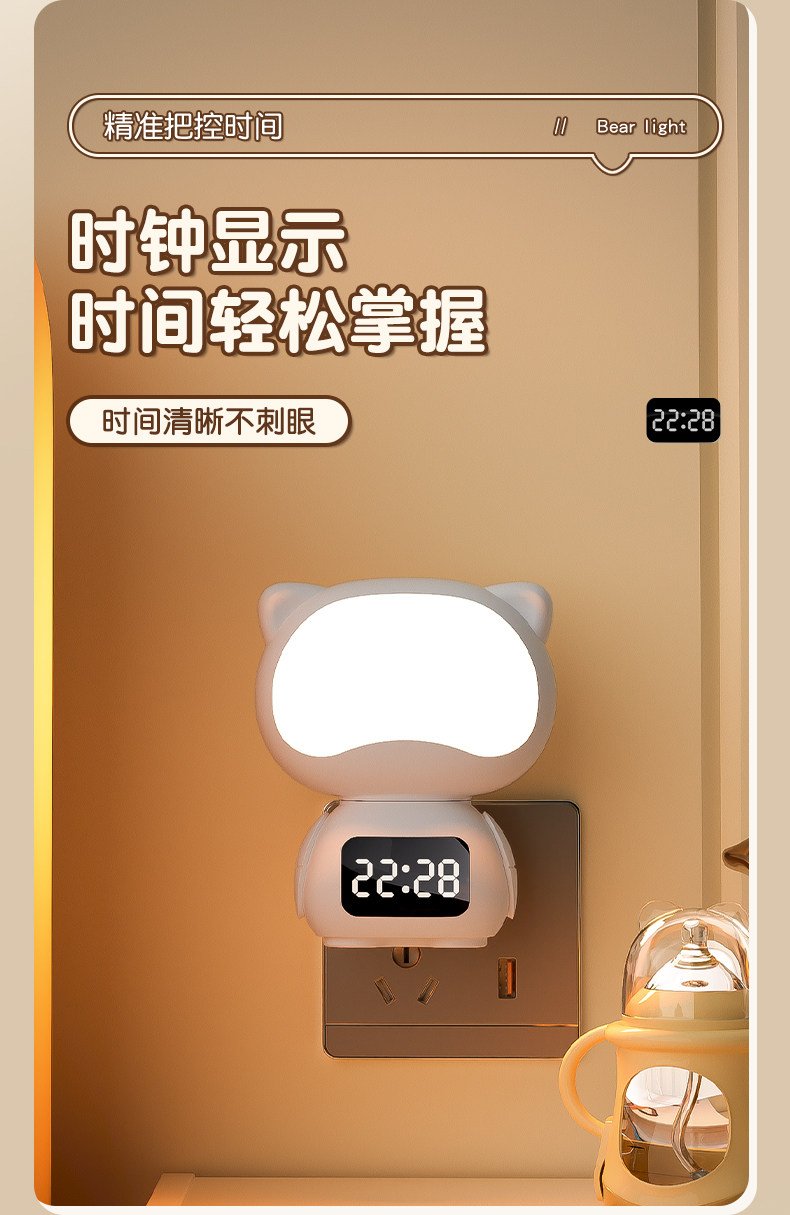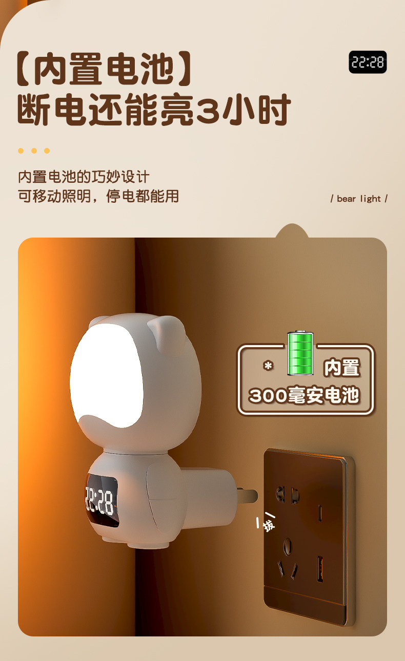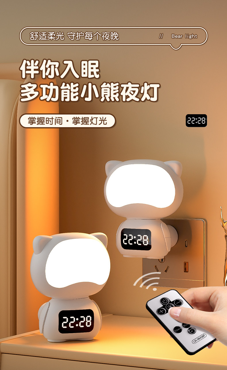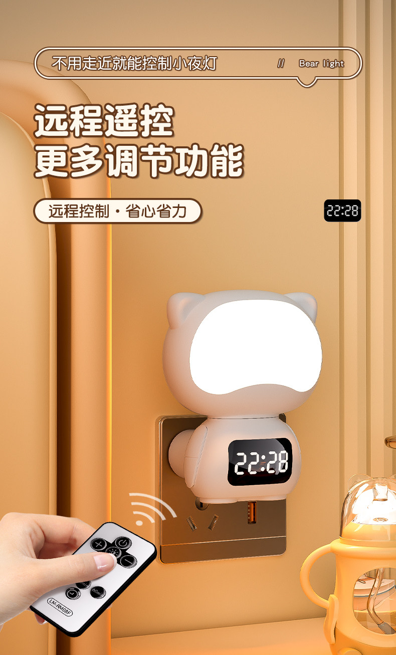 Mipin Creative Bear Night Light Led Remote Control Clock Sleep Night Light Table Lamp Bedroom Bedside Rechargeable Plug-In Dual-Use Lamp