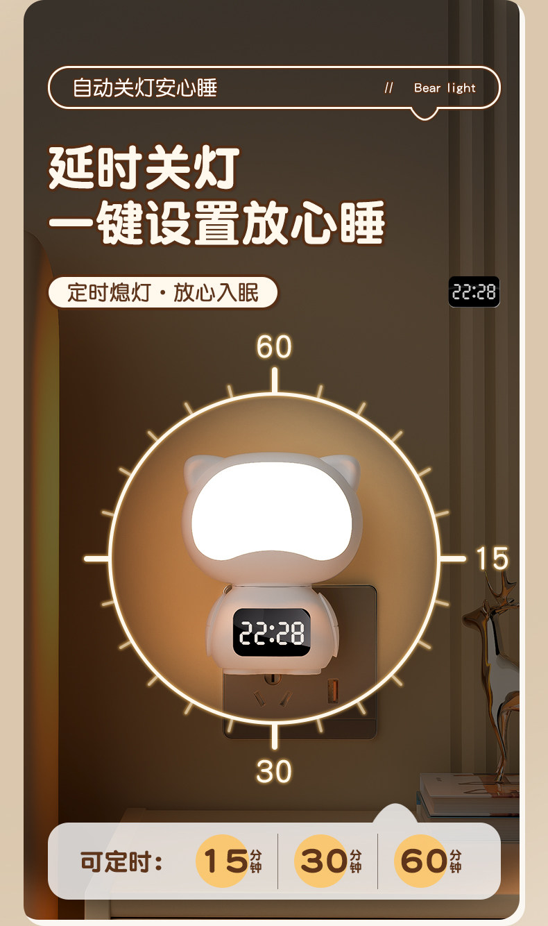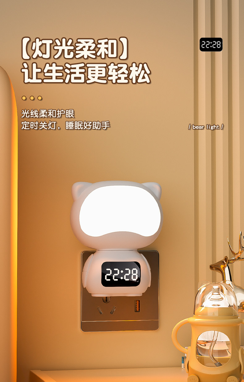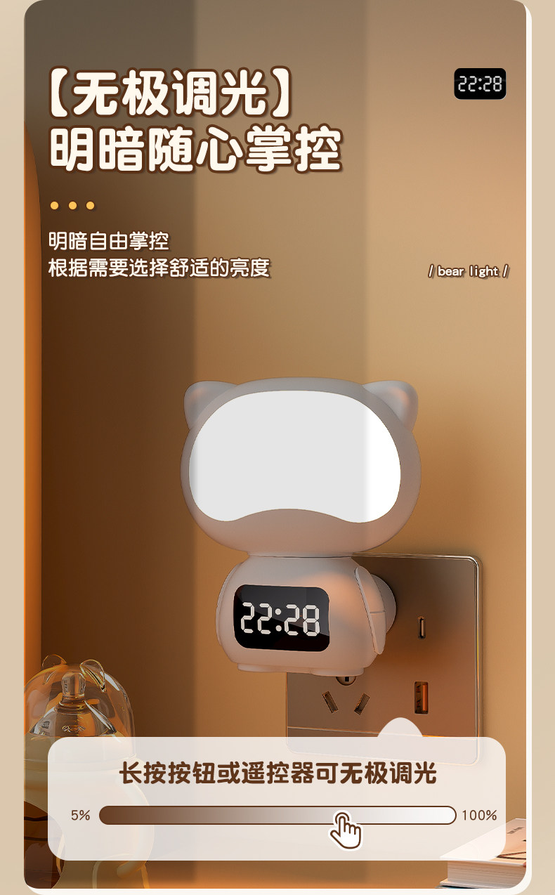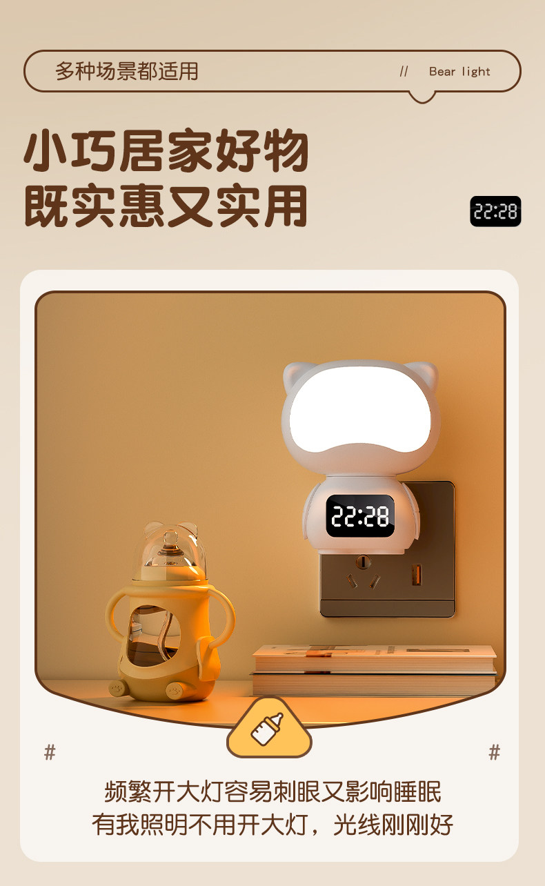 Mipin Creative Bear Night Light Led Remote Control Clock Sleep Night Light Table Lamp Bedroom Bedside Rechargeable Plug-In Dual-Use Lamp