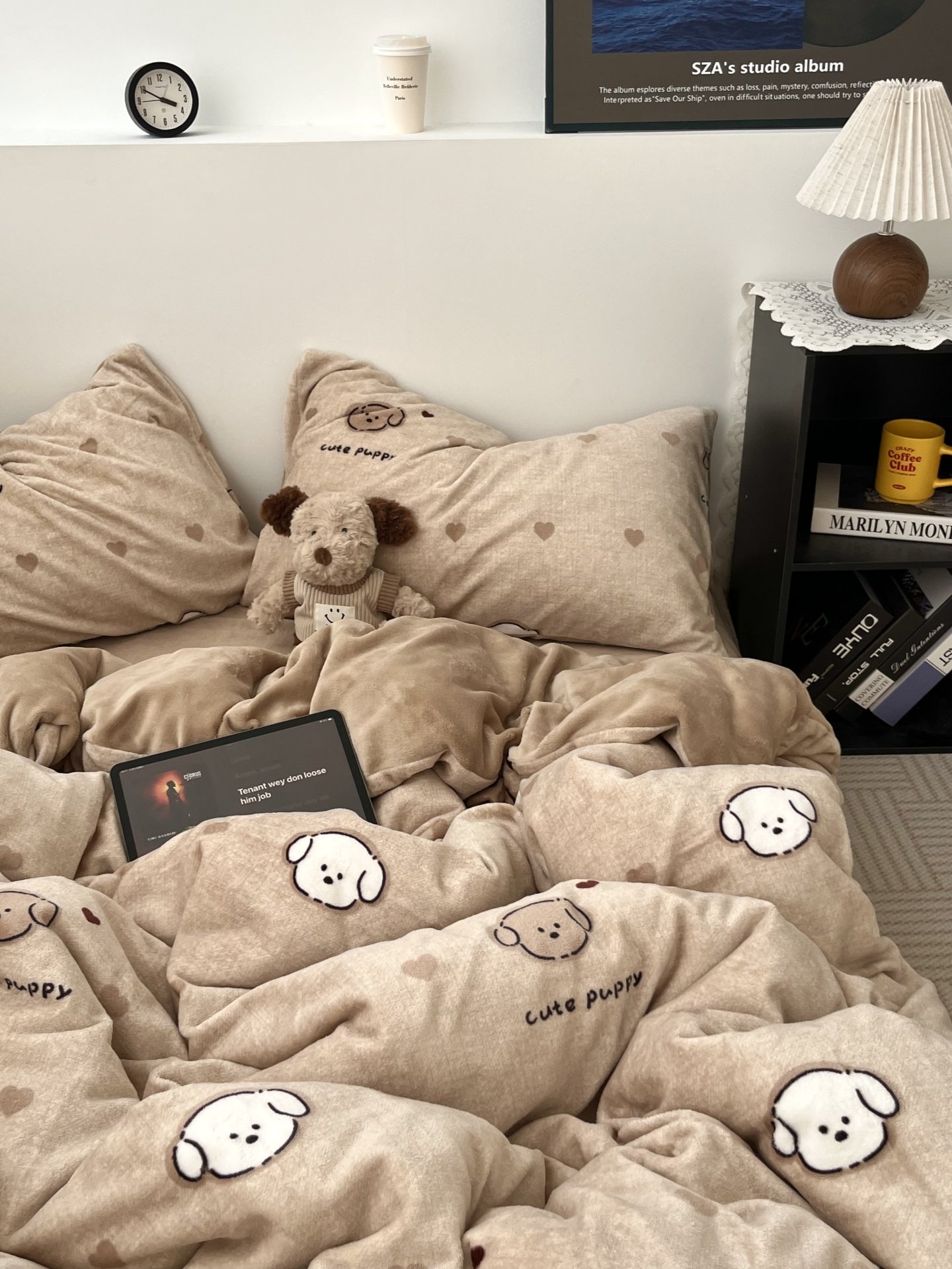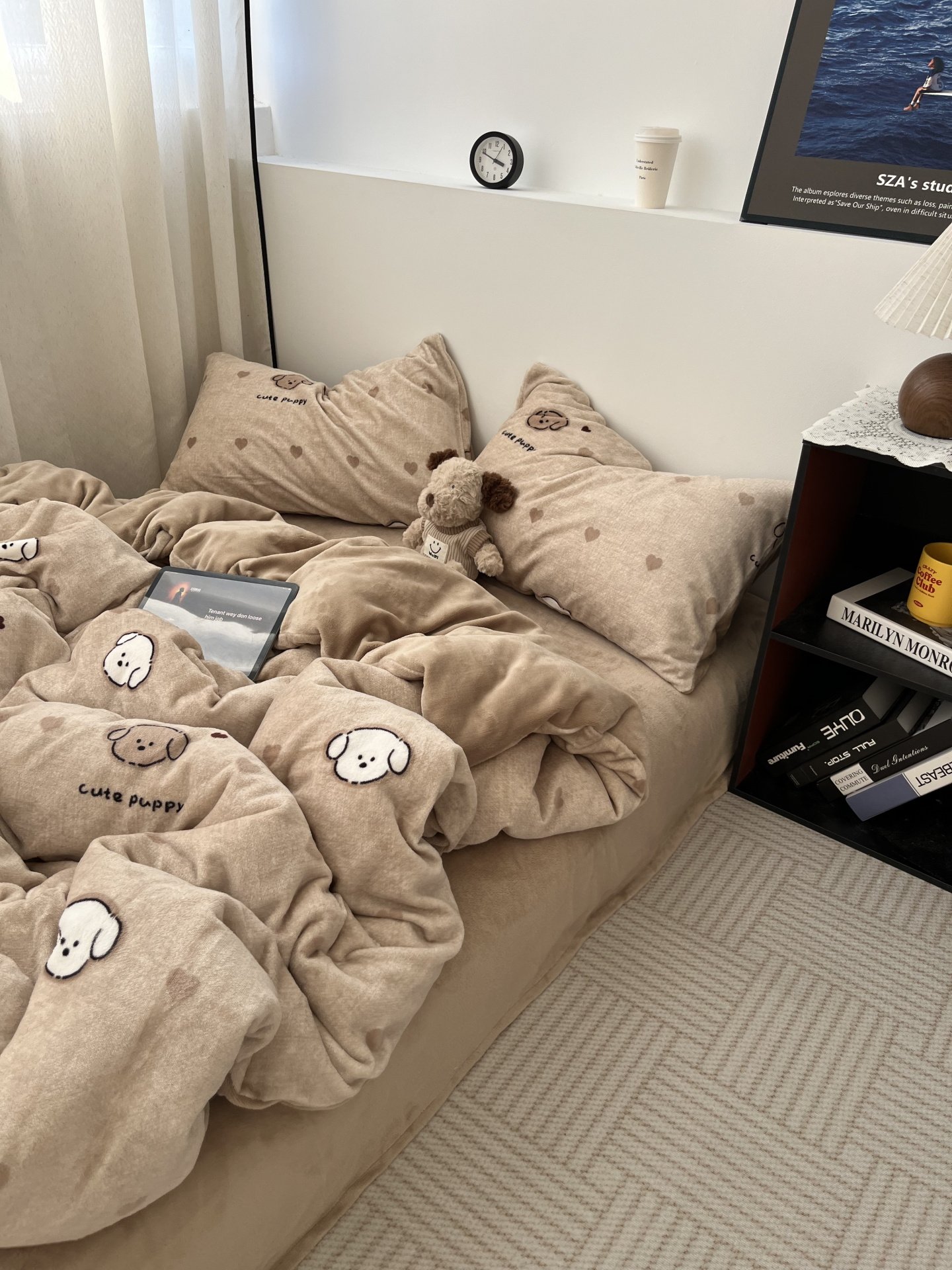 Winter Retro Style Cute Dog Thickened Milk Velvet Bed Sheet Four-Piece Set Warm Duvet Cover Coral Velvet Three-Piece Set