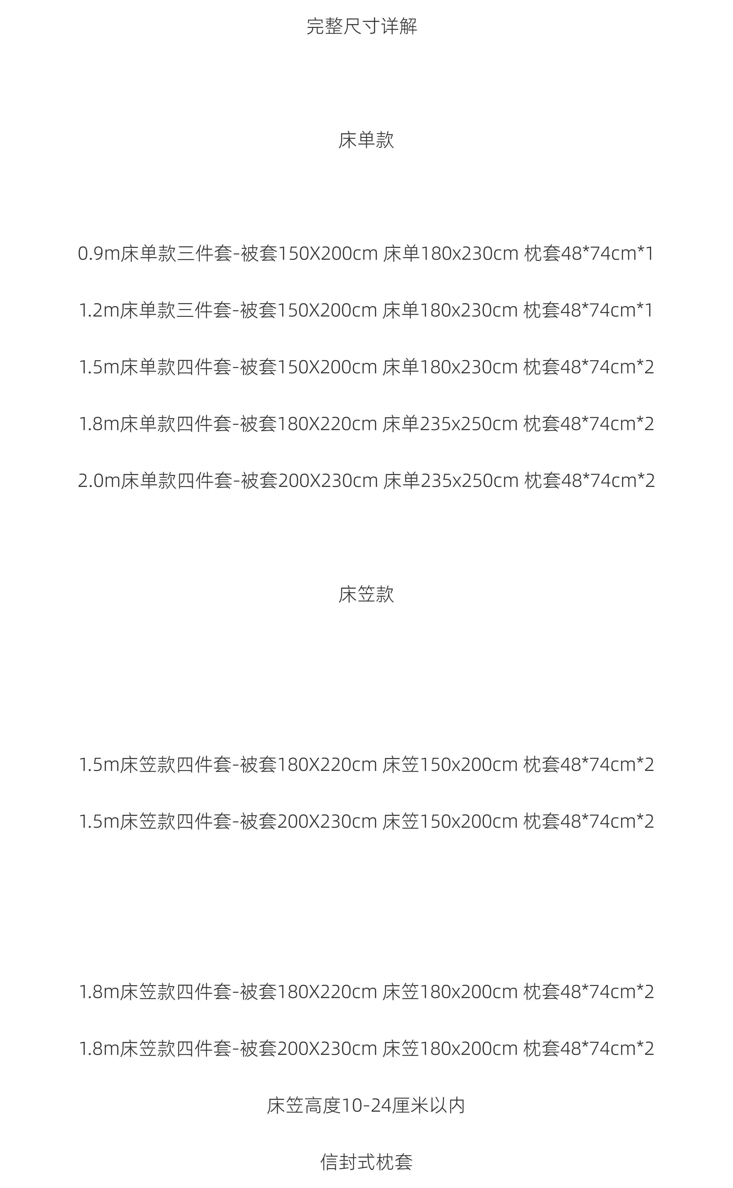 | Applicable Bed Size | 0.9m Bed Sheet Three-Piece Set: Duvet Cover 150*200cm,1.2 Three-Piece Bed Sheet Set: Quilt Cover 150*200cm,1.5 Bed Sheet Four-Piece Set: Quilt Cover 150*200cm,1.8 Bed Sheets Four-Piece Set: Quilt Cover 180*220cm,2.0 Bed Sheet Four-Piece Set: Quilt Cover 200*230cm,1. 5m [Fitted Sheet Style] Four-Piece Bedding Set: Duvet Cover 180*220 cm,1. 5m Fitted Sheet Four-Piece Bedding Set: Duvet Cover 200*230 cm,1.8 [Fitted Sheet Style] Four-Piece Bedding Set: Duvet Cover 180*220 cm,1.8 [Fitted Sheet Style] Four-Piece Bedding Set: Duvet Cover 200*230 cm |