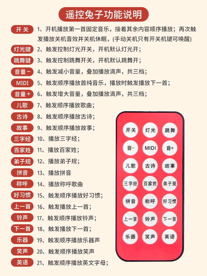 | Color Classification | [USB Direct Charging✅Early Education Remote Control Version]Genuine Dancing Little Lucky Rabbit[500+ Content],[USB Direct Charging Version]Genuine Dancing Little Lucky Rabbit[48 Songs + Music/Lighting Can Be Turned Off],[Battery Version]Genuine Dancing Little Lucky Rabbit[48 Songs + Music/Lighting Can Be Turned Off] |