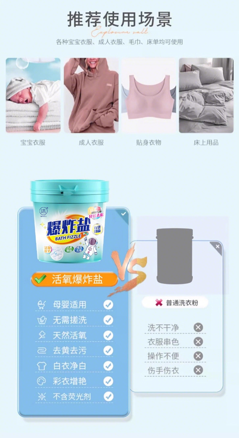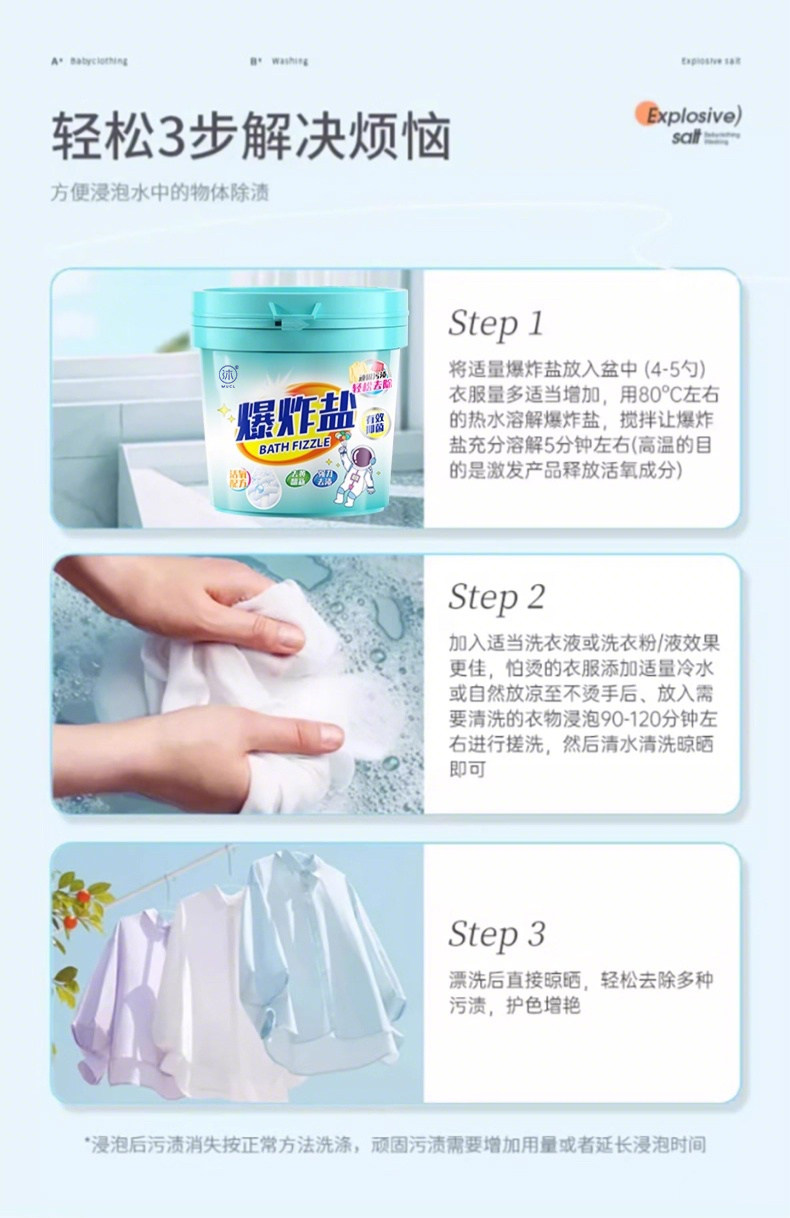 | Package Type | â€90% of Customers Chooseâ€2 Barrels of Explosive Salt 2600g (Recommended by the Store Manager),[Stock up]3 Barrels of Explosive Salt 3900g (Buy Once and Use for 1 Year),[1 Barrel Trial Pack]1300g of Explosive Salt (the Most Expensive Thing Is the Shipping Fee|Not Recommended),[2 Bottles]âThe Store Manager Highly Recommendsâ Stain Removal Technology,[3 Bottles]â Mom's First Choiceâ Save 20.8 Yuan,[Combination Package]Bursting Salt X 2 + School Uniform Net X 1 |