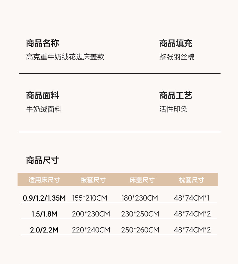 | Applicable Bed Size | 1.2m Three-Piece Bed Cover Set[Quilt Cover 150X200+Bed Cover 180X230+1 Pillowcase],1.5m Bed Cover Four-Piece Set[Quilt Cover 200X230+Bed Cover 230X250+2 Pillowcases],1.8m Bed Cover Four-Piece Set[Quilt Cover 200X230+Bed Cover 230X250+2 Pillowcases],2.0m Bed Cover Four-Piece Set[Quilt Cover 220X240+Bed Cover 250X260+2 Pillowcases] |