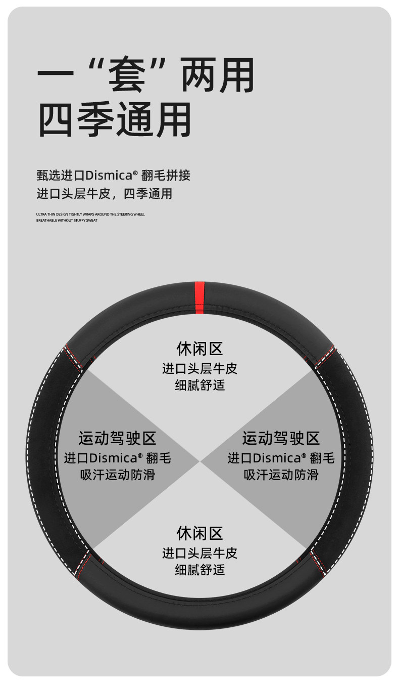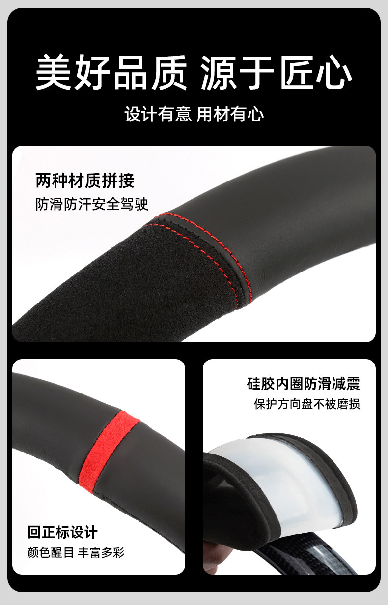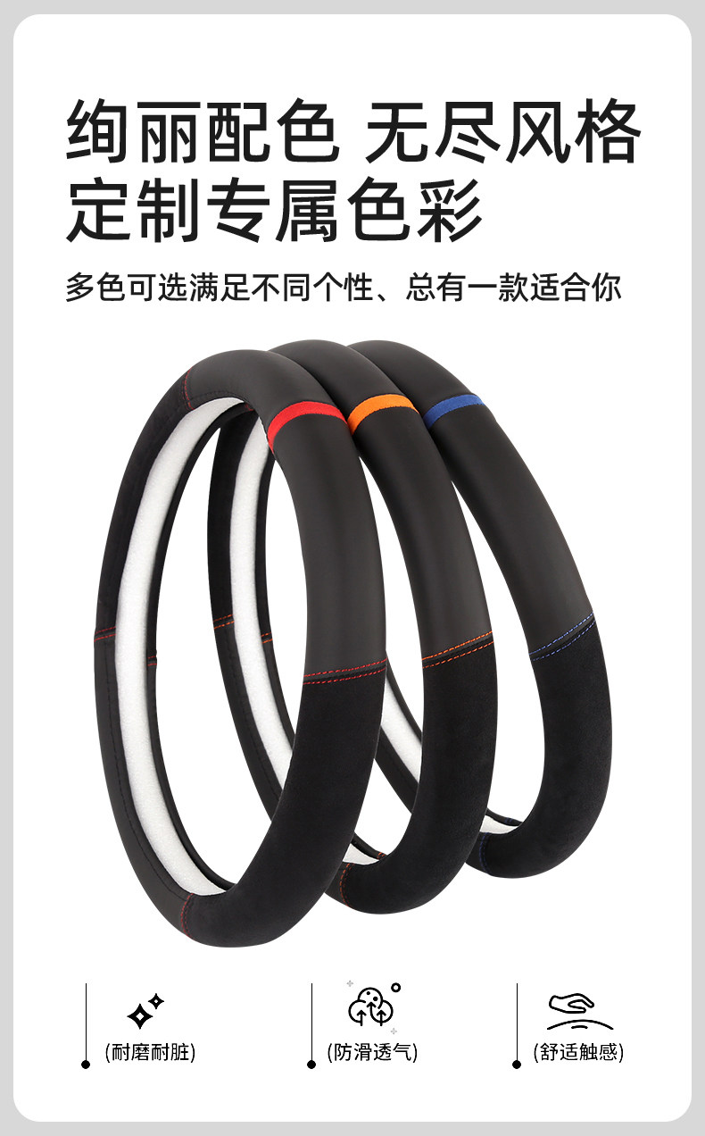 Car Steering Wheel Cover, First-Layer Cowhide Leather, Genuine Leather Spliced with Suede, Seamless Silicone D-Type, All-Season Universal Handlebar Cover