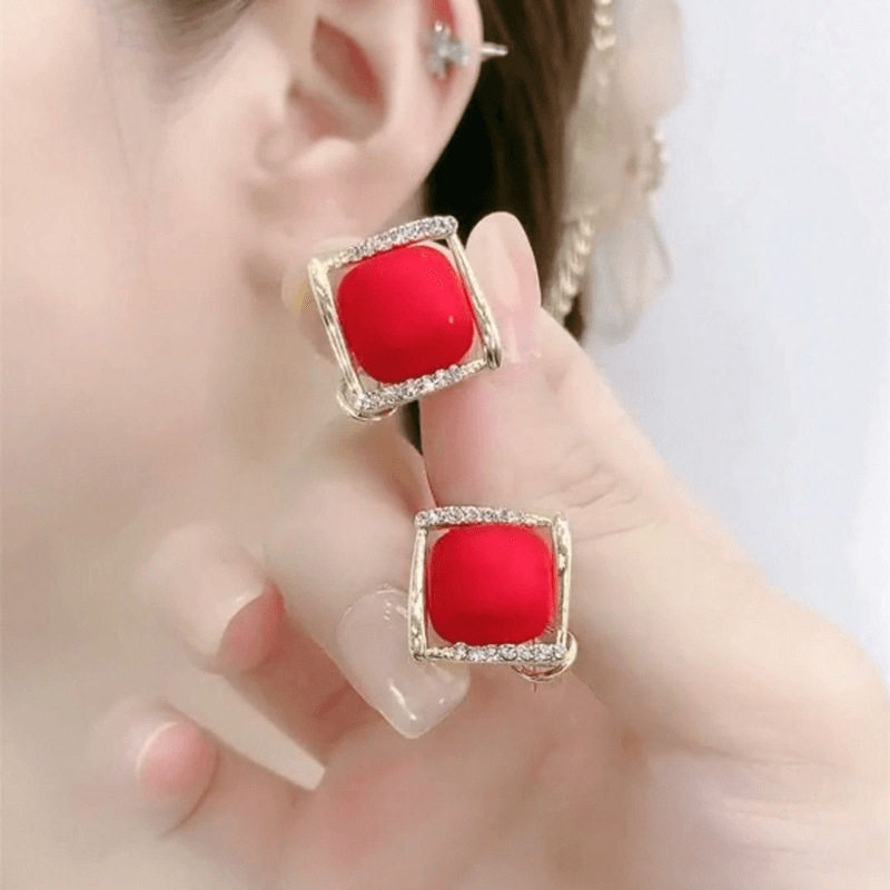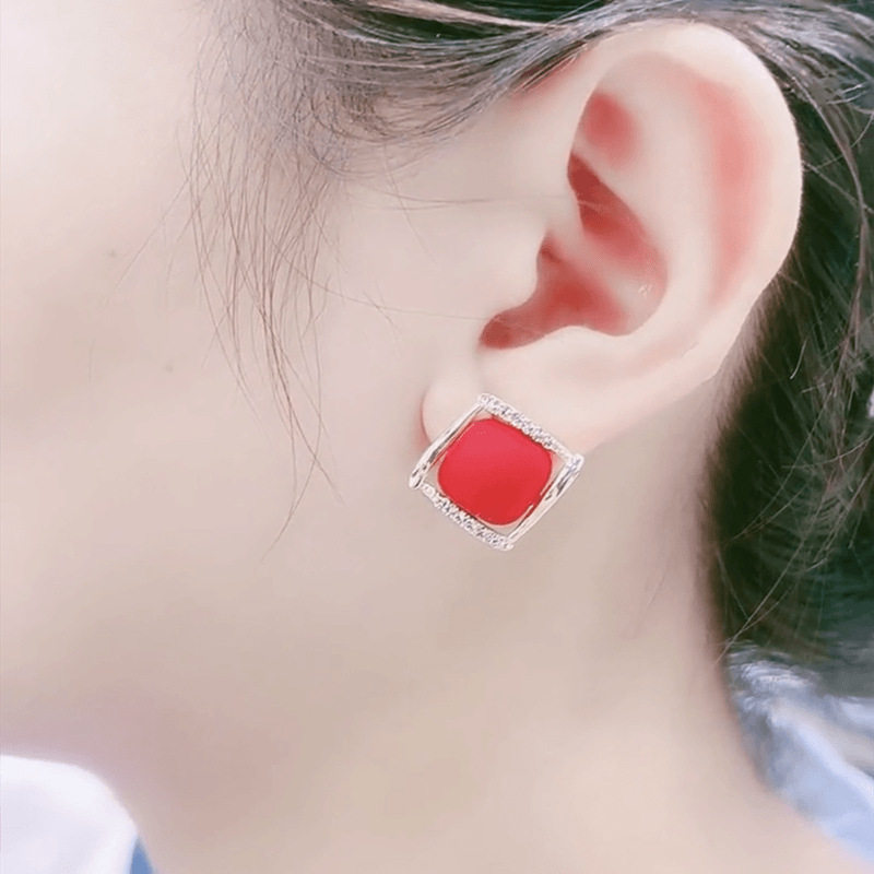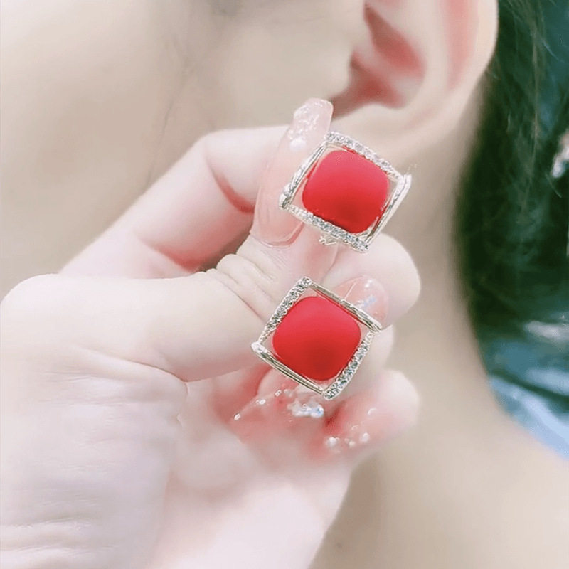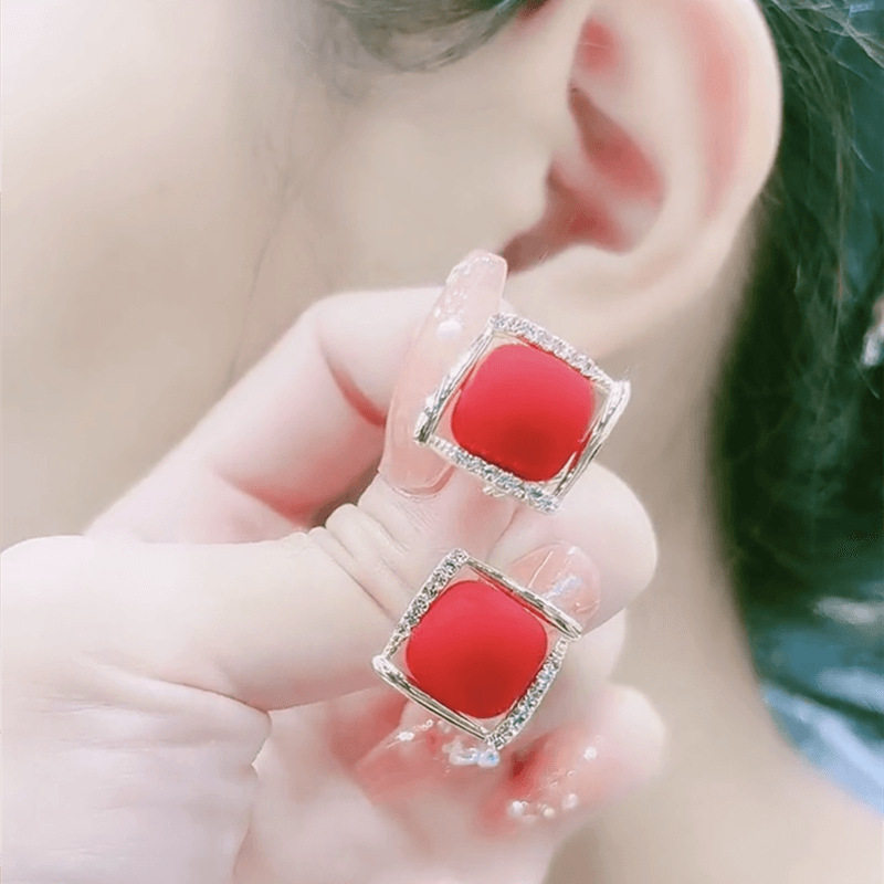 Japanese Premium New 925 Silver Needle Versatile Red Square Stud Earrings Autumn Personality Diamond-Studded Light Luxury High-End Earrings