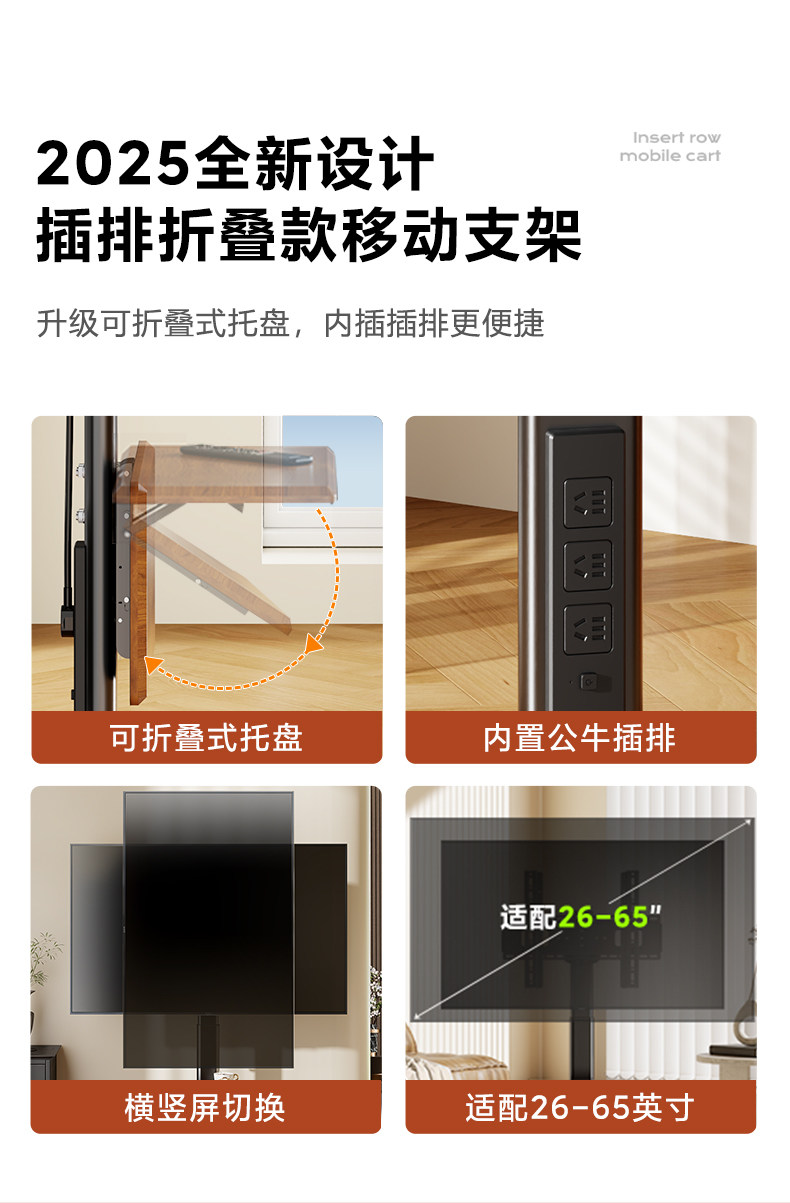 Tv Floor Stand with Movable Cart, Built-In Power Strip, Foldable Tray, Universal Rotating Screen, Wheeled Mount
