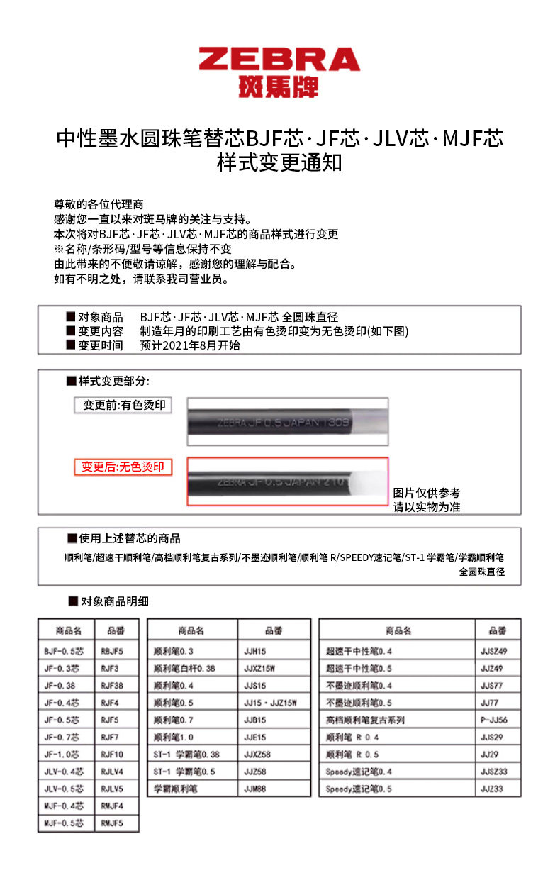 Japanese Zebra Pen Refill Jf-0.5 Replacement Refill Mjf/Bjf/Jrv/Jlv-0.5 Retractable Gel Pen Quick-Drying Refill Jj15 Pen Original Replacement Refill Bullet Tip Student Exam Special
