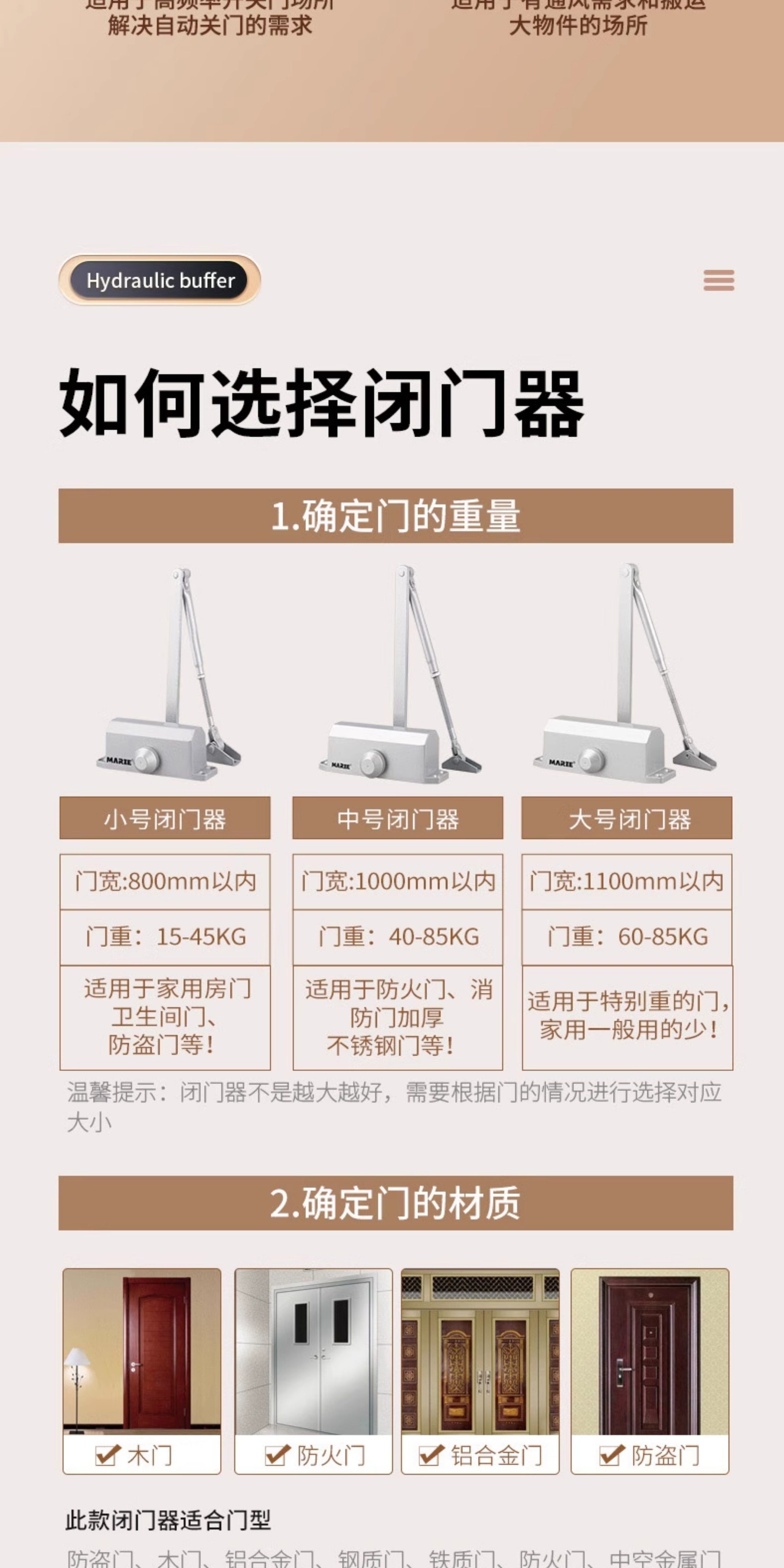 | Color Classification | [Engineering Model] Suitable for Door Weight 15-45kg, Silver Small Size, No Positioning,[Engineering Model] Suitable for Door Weight 40-85kg, Silver Medium Size, No Positioning,[Engineering Model] Suitable for Door Weight 60-85kg, Silver Large Size, No Positioning,ćPremium QualityćSuitable for Door Weights 15-45kg, Silver, Small Size, Non-Positioning,[Quality Model] Suitable for Door Weight 40-85kg, Silver Medium Size, No Positioning,[Quality Model] Suitable for Door Weight 60-85kg, Silver Large Size, No Positioning,ćPremium QualityćSuitable for Door Weights 15-45kg, Black, Small Size, Non-Positioning,[Quality Model] Suitable for Door Weight 40-85kg, Black Medium Size, No Positioning,[Quality Model] Suitable for Door Weight 60-85kg, Black Large Size, No Positioning,[Engineering Model] Suitable for Door Weight 15-45kg Silver Small Size Positioning,[Engineering Model] Suitable for Door Weight 40-85kg Silver Medium Size Positioning,[Engineering Model] Suitable for Door Weight 60-85kg Silver Large Size Positioning,ćPremium QualityćSuitable for Door Weights 15-45kg, Silver, Small Size, Fixed Positioning,[Quality Model] Suitable for Door Weight 40-85kg Silver Medium Size Positioning,[Quality Model] Suitable for Door Weight 60-85kg Silver Large Size Positioning,ćPremium QualityćSuitable for Door Weights 15-45kg, Black, Small Size, Fixed Positioning,[Quality Model] Suitable for Door Weight 40-85kg Black Medium Size Positioning,[Quality Model] Suitable for Door Weight 60-85kg Black Large Size Positioning |