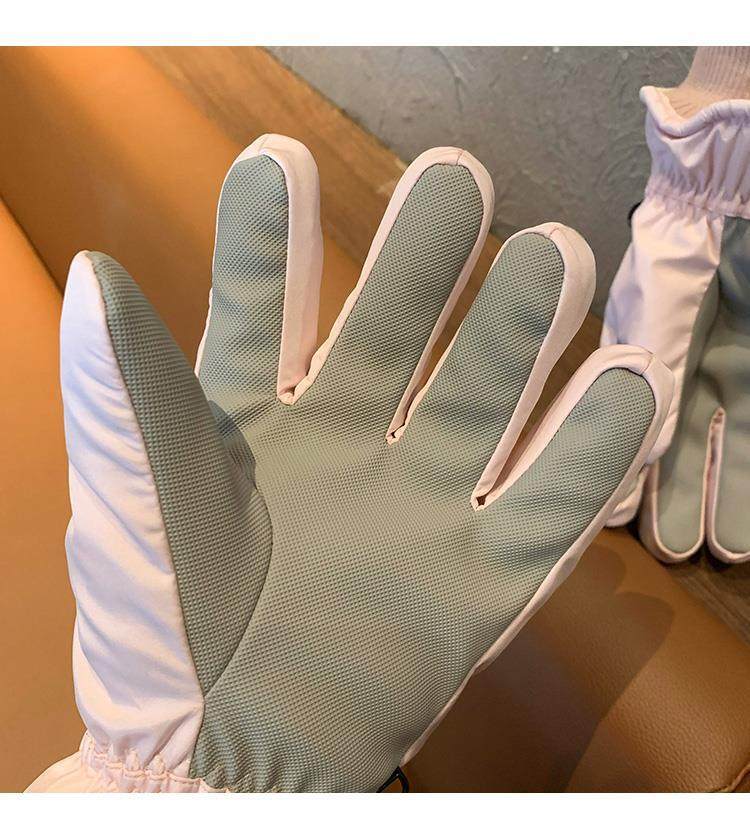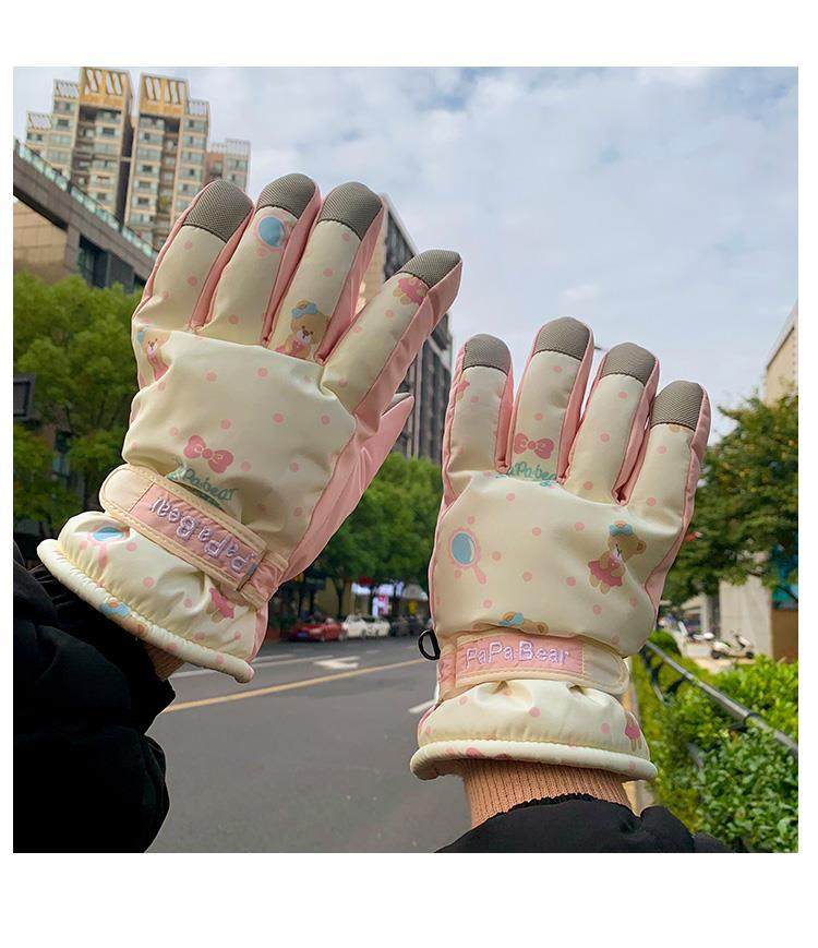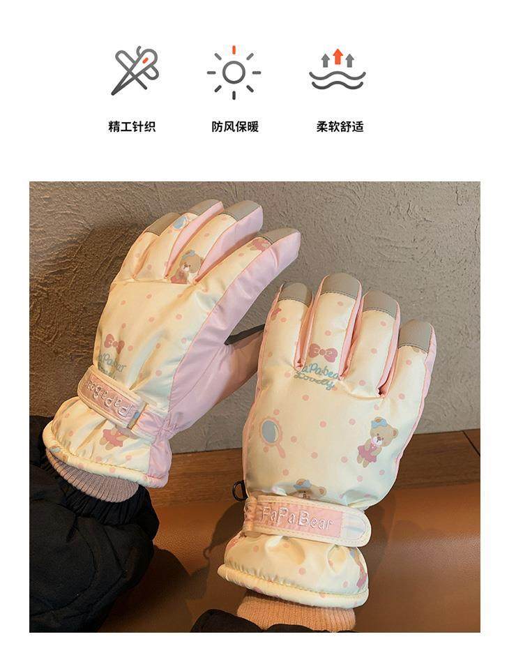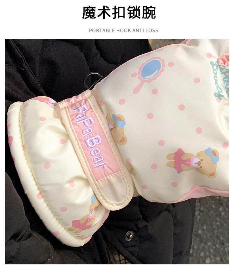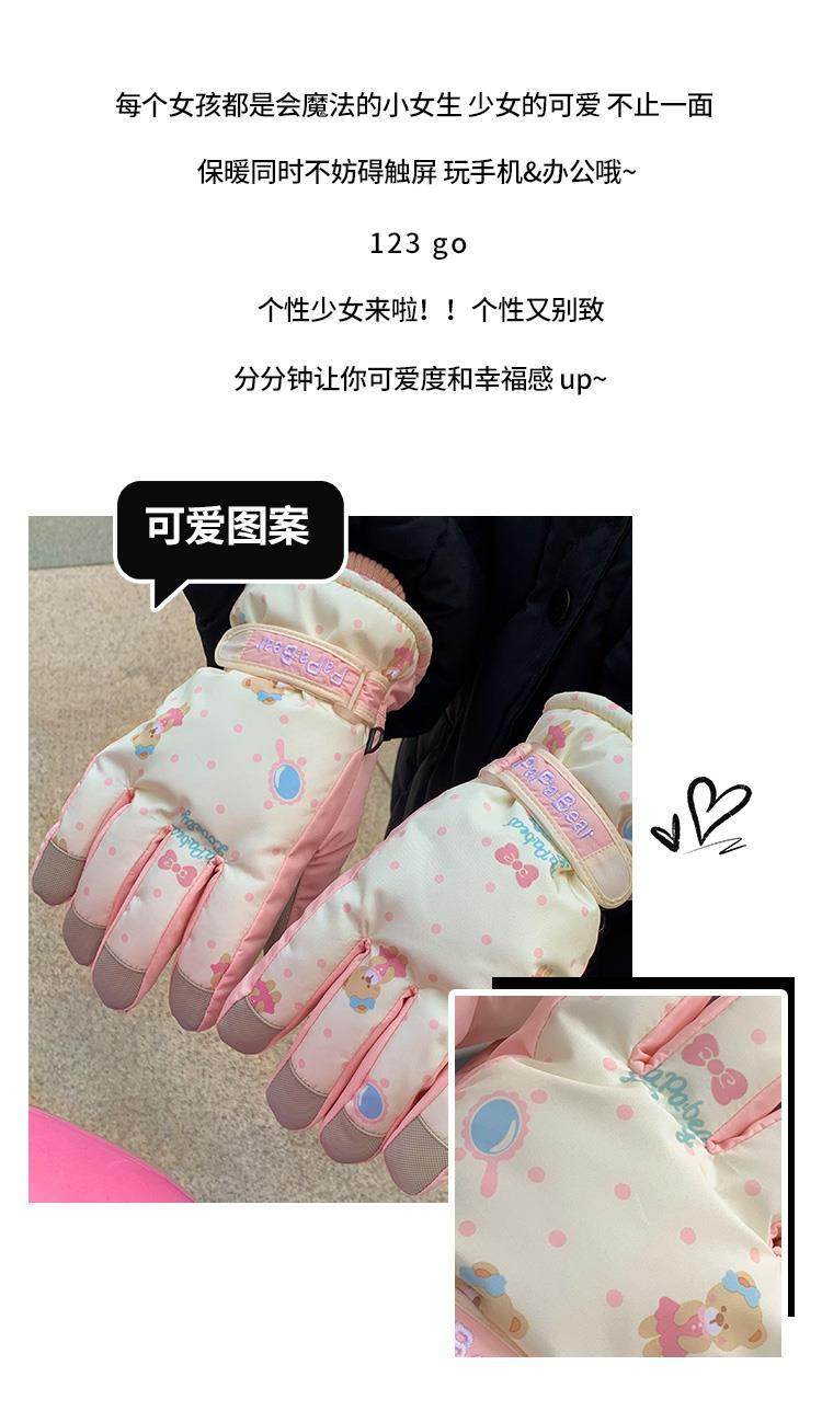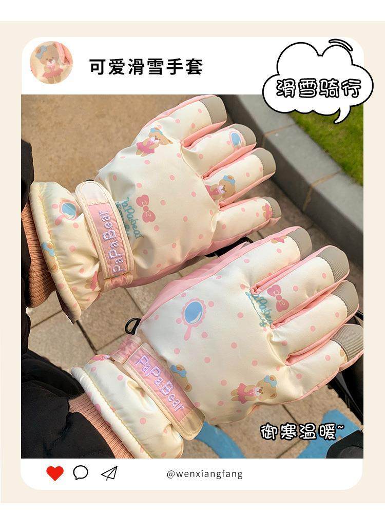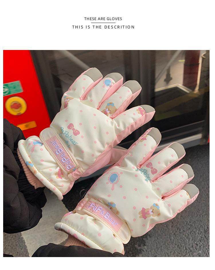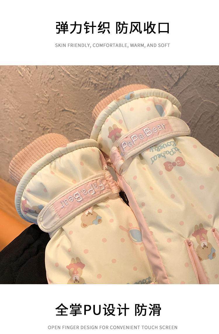 Beige Cute Bear Ski Gloves for Women, Winter Korean Style, Warm, Fleece-Lined, Thickened, Outdoor Windproof, Cold-Proof, Trendy for Cycling