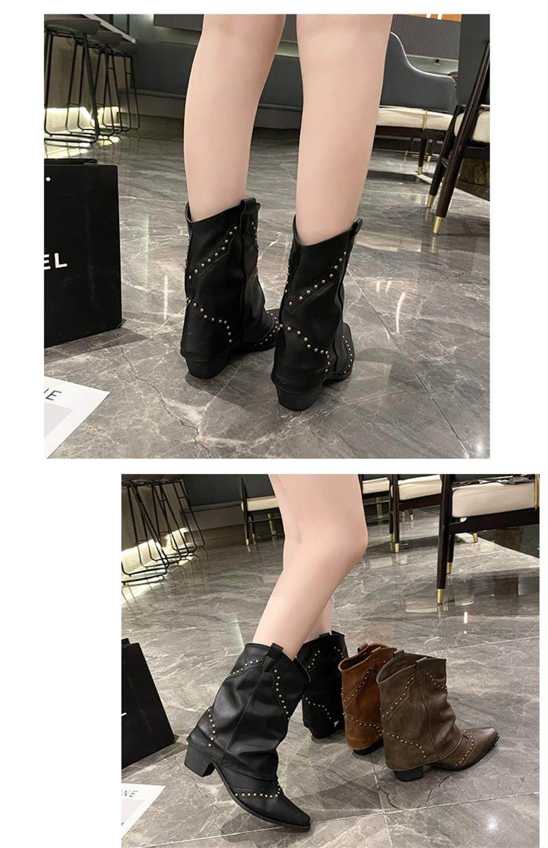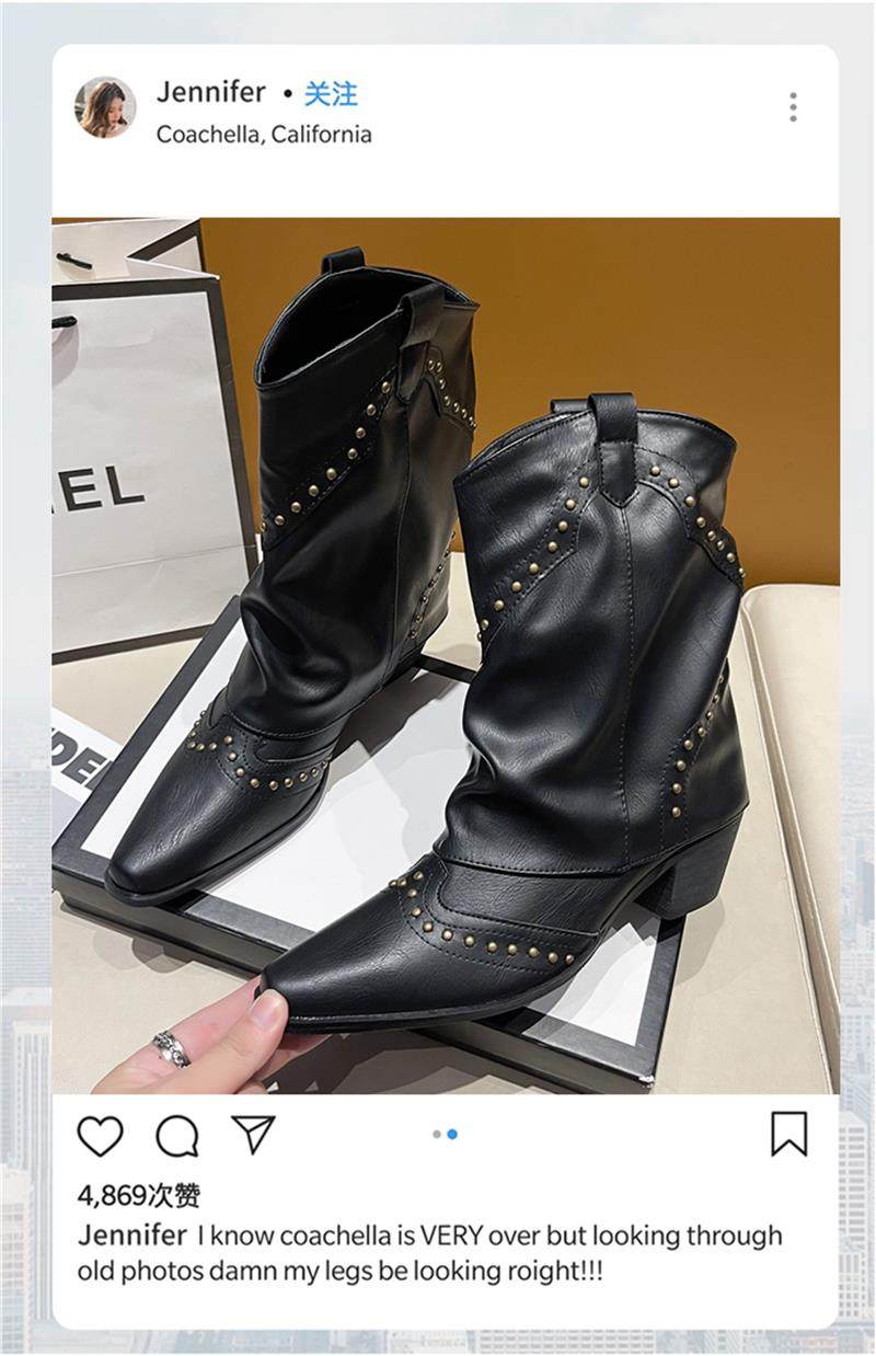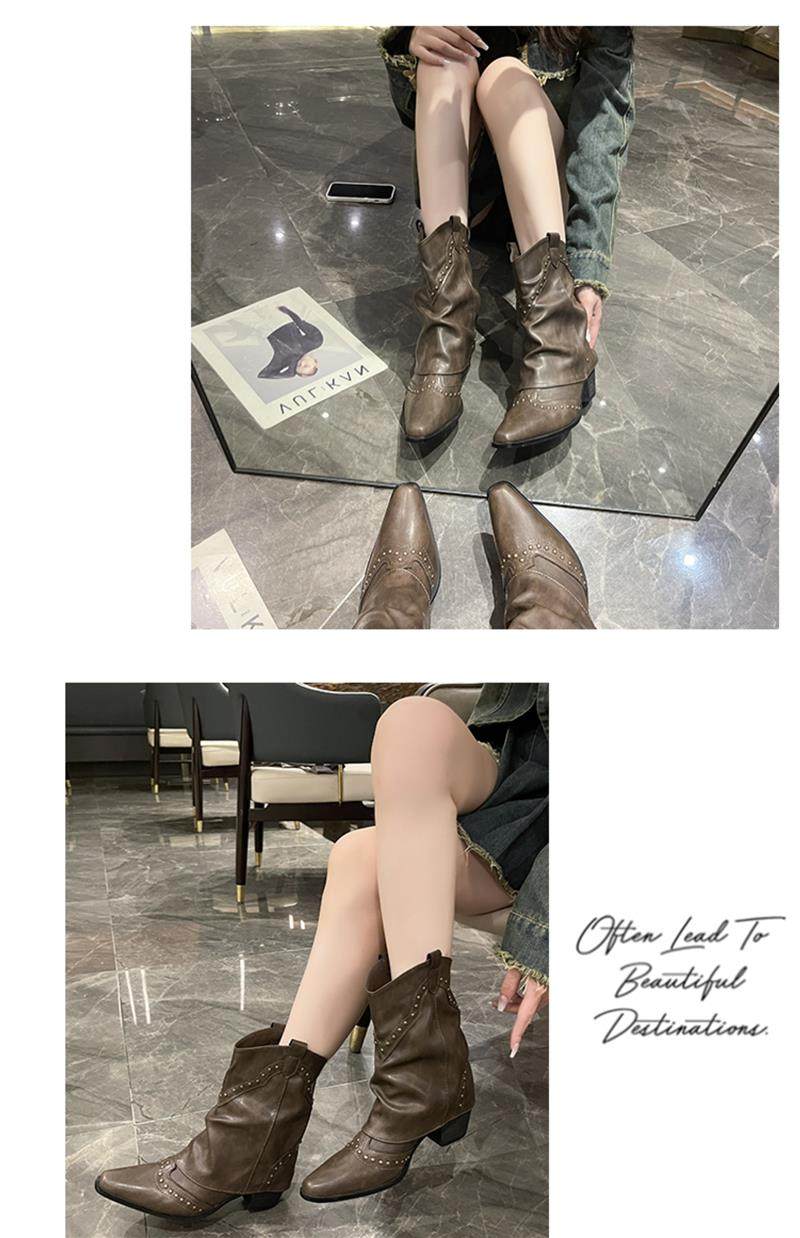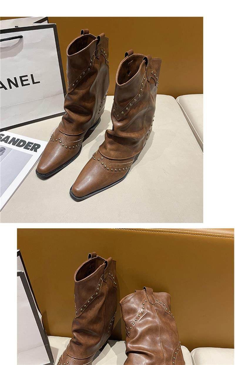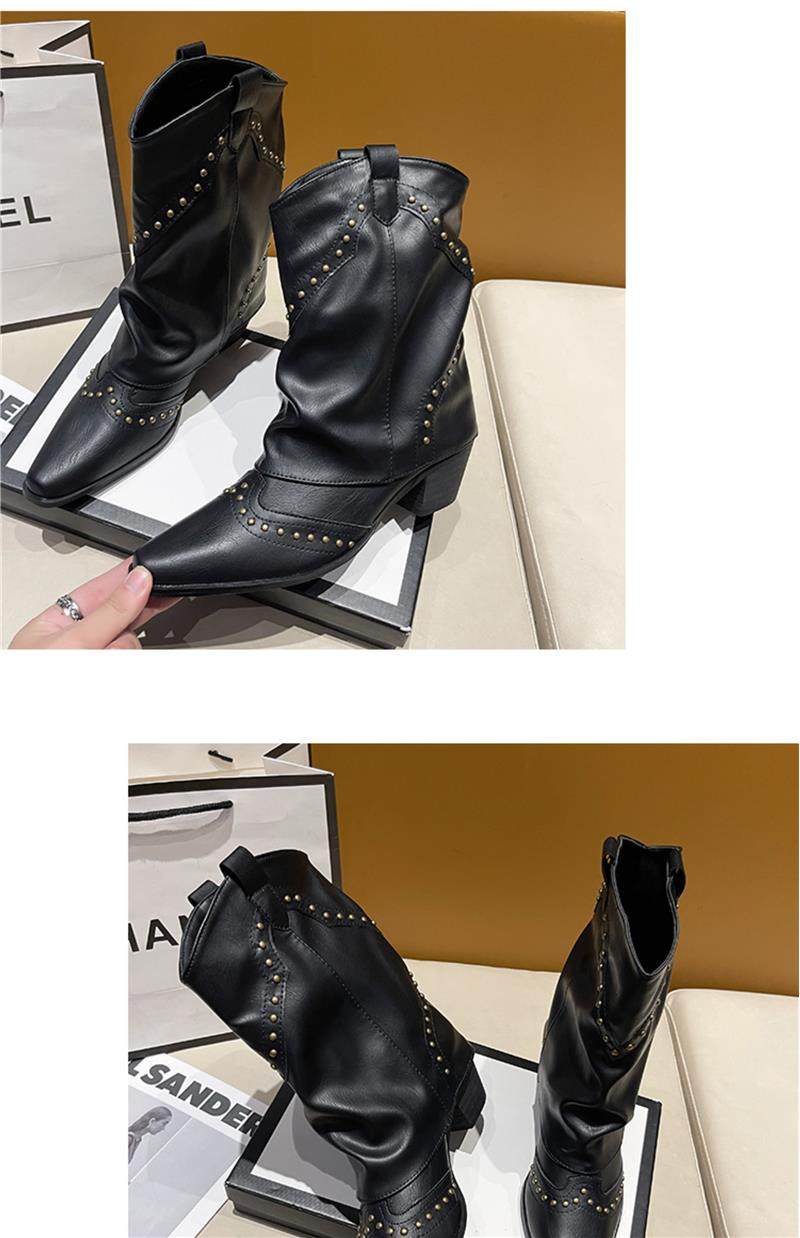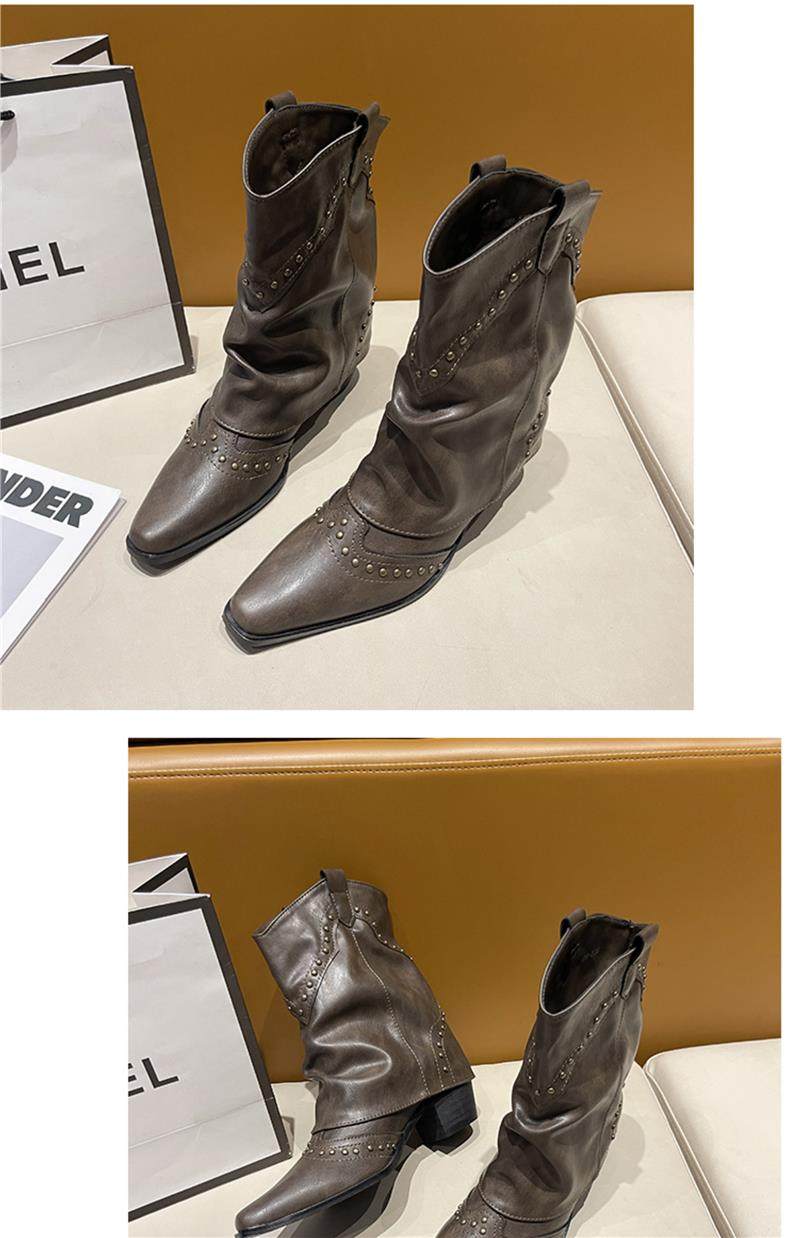 Western Cowboy Boots with Chunky Heels for Women, 2026 New Autumn V-Cut Riding Boots, Pointed Toe Studded Retro Bootcut Boots