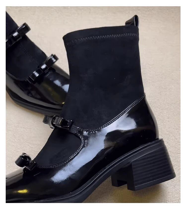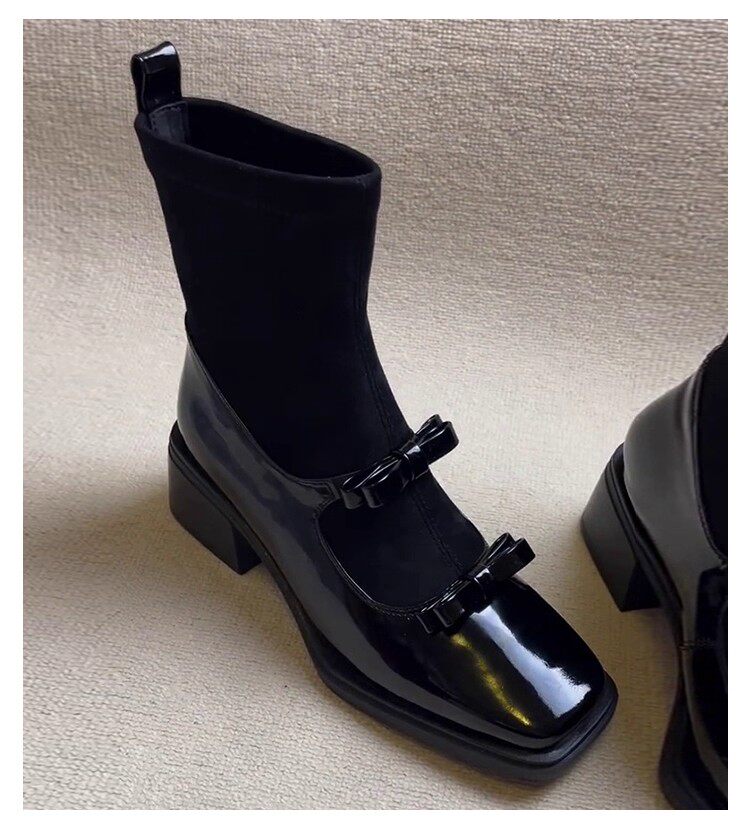 2025 Autumn and Winter Square-Toe Retro Bow Elastic Slim Boots Patchwork Mary Jane Sock Boots Slimming Chunky Heel Short Boots for Women