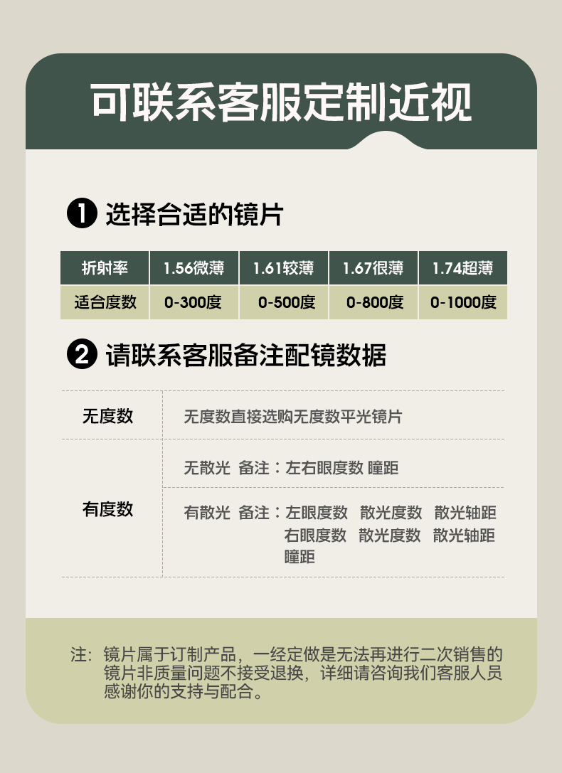 | Lens Refractive Index | Non-Prescription Anti-Blue Light Lenses [Ruiyabo Carefully Selected, Quality and Peace of Mind],Frame + [Thin] 1.56 Anti-Radiation Lenses [Degree Remarks],Frame + [Thinner] 1.61 Radiation-Proof Lens [Degree Remarks],Frame + [Ultra-Thin] 1.67 Anti-Radiation Lens [Degree Remarks],Frame + [Thinnest] 1.74 Radiation-Proof Lens [Degree Remarks],Frame + [Thin] 1.56 Anti-Blue Light Lens [Remarks on Prescription],Frame + [Thinner] 1.61 Anti-Blue Light Lens [Degree Remarks],Frame + [Ultra-Thin] 1.67 Anti-Blue Light Lens [Remarks on Prescription],Frame + [Thinnest] 1.74 Anti-Blue Light Lens [Remarks on Prescription],[Thin] 1.56 Color-Changing Anti-Blue Light Lenses [Remarks on Prescription],[Thinner] 1.61 Color-Changing Anti-Blue Light Lenses [Remarks on Prescription],[Ultra-Thin] 1.67 Color-Changing Anti-Blue Light Lenses [Degree Remarks],[Korean Kemi U2] 1.56 Aspherical (Thinner) [Degree Remarks],[Korean Kemi U2] 1.61 Aspherical Surface (Thin and Light) [Degree Remarks],[Korean Kemi U2] 1.67 Aspherical (Ultra-Thin) [Degree Remarks],[Korean Kemi U2] 1.74 Aspherical (Ultra-Thin) [Degree Remarks],[Korean Kemi U6] Anti-Blue Light 1.56 Aspherical (Thinner) [Degree Remarks],[Korean Kemi U6] Anti-Blue Light 1.61 Aspherical (Thinner) [Degree Remarks],[Korean Kemi U6] Anti-Blue Light 1.67 Aspherical Surface (Thinner) [Degree Remarks],[Korean Kemi U6] Anti-Blue Light 1.74 Aspherical Surface (Thinner) [Degree Remarks],[Thin] Essilor Wanxin Lenses 1.56 Daily Aspheric [Degree Remarks],[Thinner] Essilor Wanxin Lenses 1.61 Daily Aspheric [Prescription Remarks],[Ultra-Thin] Essilor Wanxin Lenses 1.67 Daily Aspheric [Degree Remarks],[the Thinnest] Essilor Wannxin Lenses 1.74 Daily Aspheric [Degree Remarks],[Thin] Essilor Wanxin Lenses 1.56 Multi-Screen Anti-Blue Light [Prescription Remarks],[Thinner] Essilor Wanxin Lenses 1.61 Multi-Screen Anti-Blue Light [Prescription Remarks],[Ultra-Thin] Essilor Wanxin Lenses 1.67 Multi-Screen Anti-Blue Light [Remarks on Degree],[Ultra-Thin] Essilor Wanxin Lenses 1.74 Multi-Screen Anti-Blue Light [Remarks on Degree],[Zisight] 1.56 Aspherical (Thinner) [Degree Remarks],[Zisight] 1.61 Aspherical Surface (Thin and Light) [Degree Remarks],[Zisight] 1.67 Aspheric (Ultra-Thin) [Degree Remarks],[Zisight] Anti-Blue Light 1.56 Aspherical (Thinner) [Degree Remarks],[Zisight] Anti-Blue Light 1.61 Aspherical (Thin and Light) [Degree Remarks],[Zisight] Anti-Blue Light 1.67 Aspherical (Ultra-Thin) [Degree Remarks] |