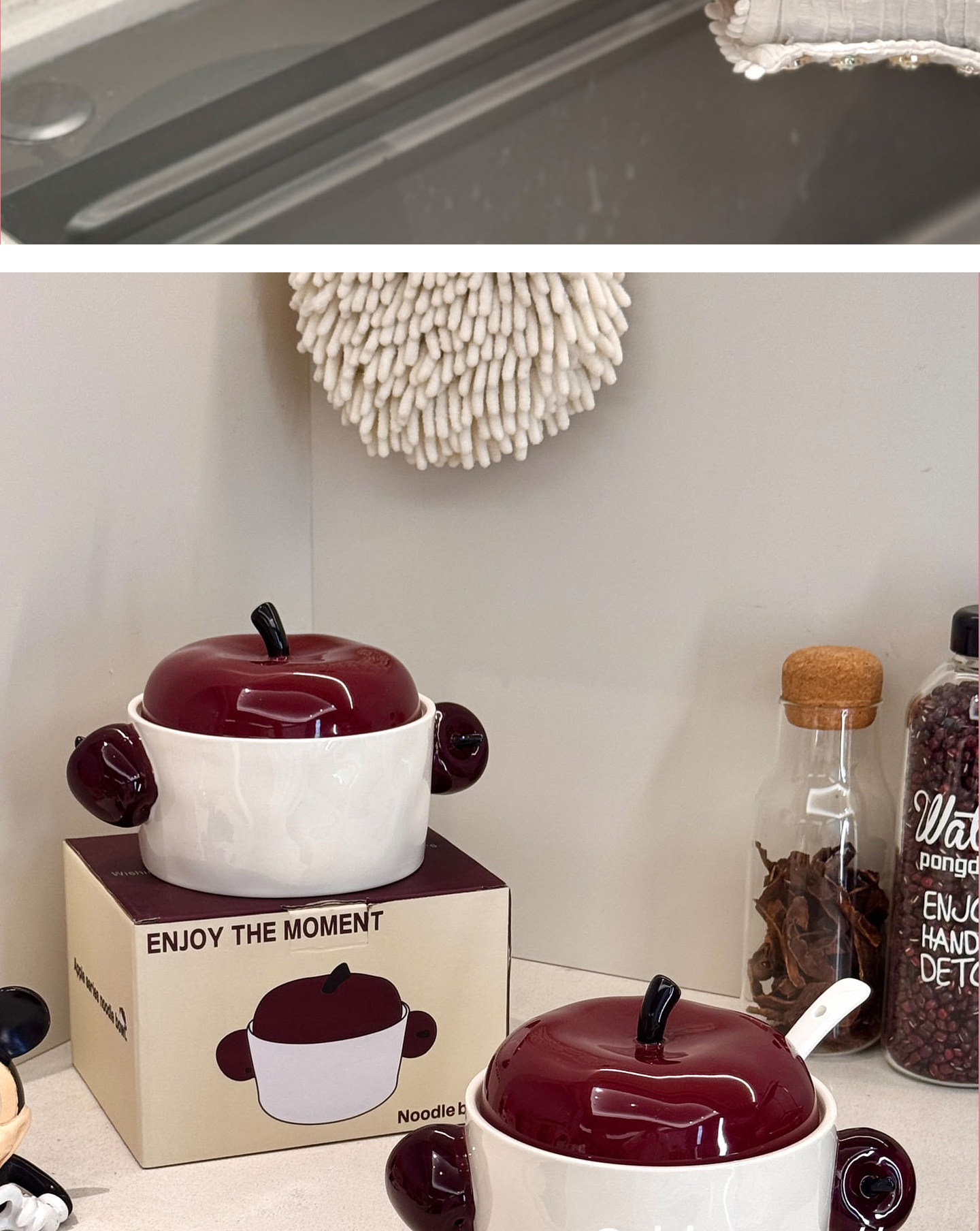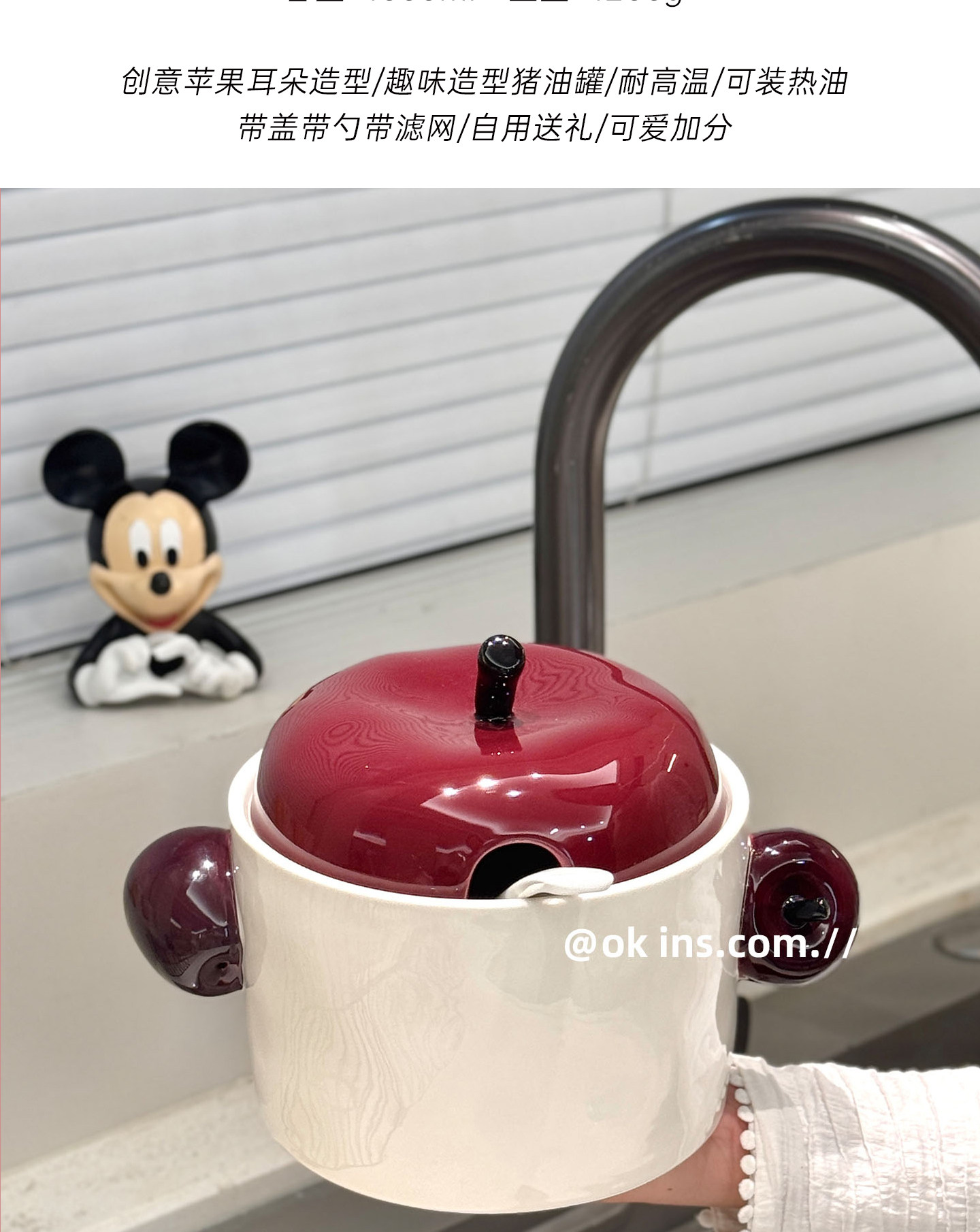 Apple Ceramic Lard Jar with Lid and Spoon for Home Kitchen, Red Oil Jar, Oil and Chili Seasoning Storage Jar