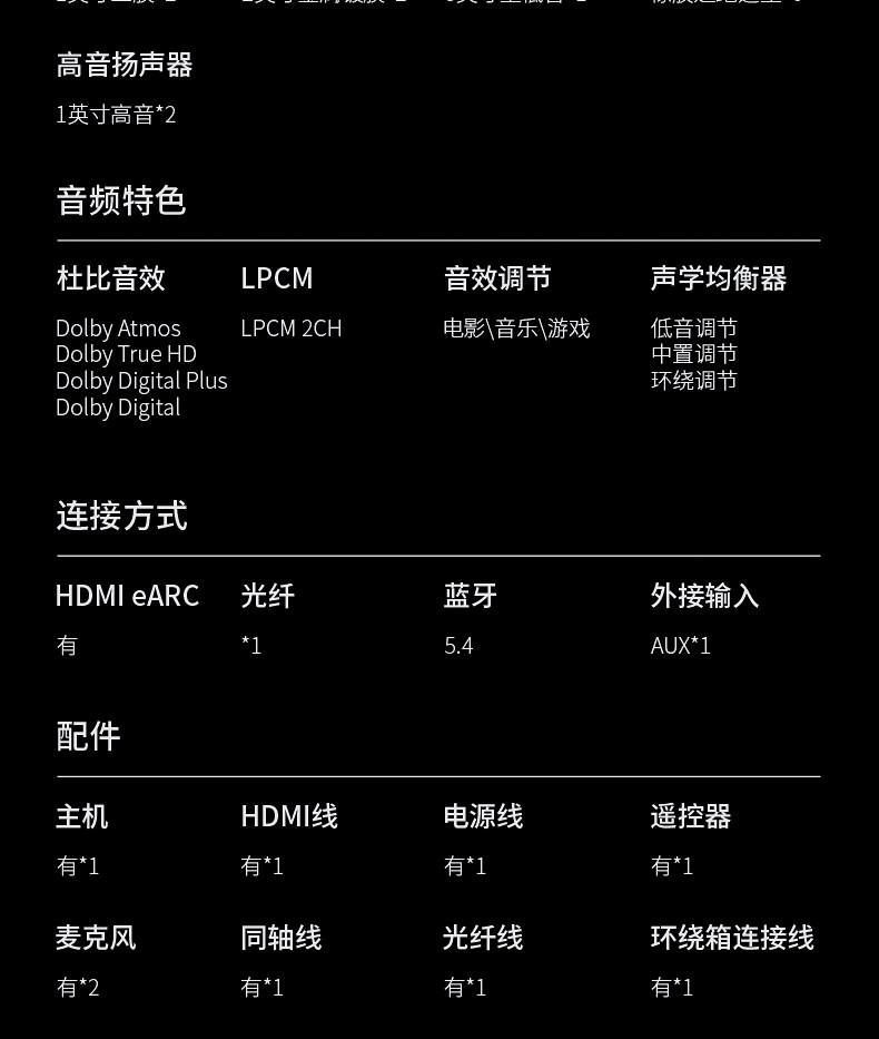 | Speaker Connection Method | HDMI Transmission,Fiber Transmission,Wireless,Coaxial Transmission |