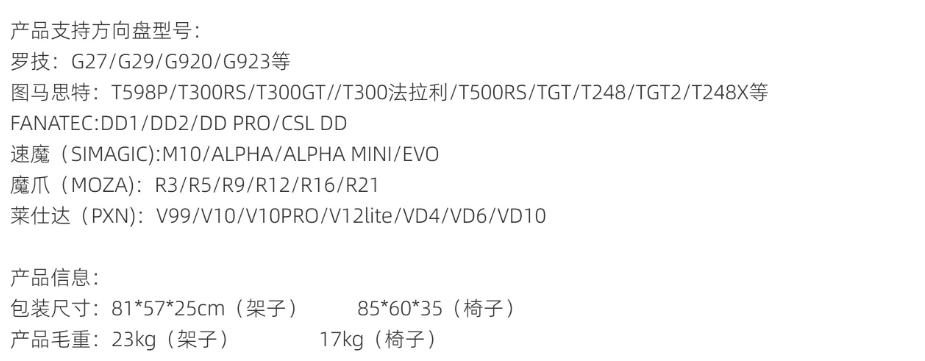 | Color Classification | Black and White Leather Seats,Black and Red Pro Leather Seats,Gold Velvet Pro Seat,Base Stand (Including Gear Stand and Monitor Stand) |