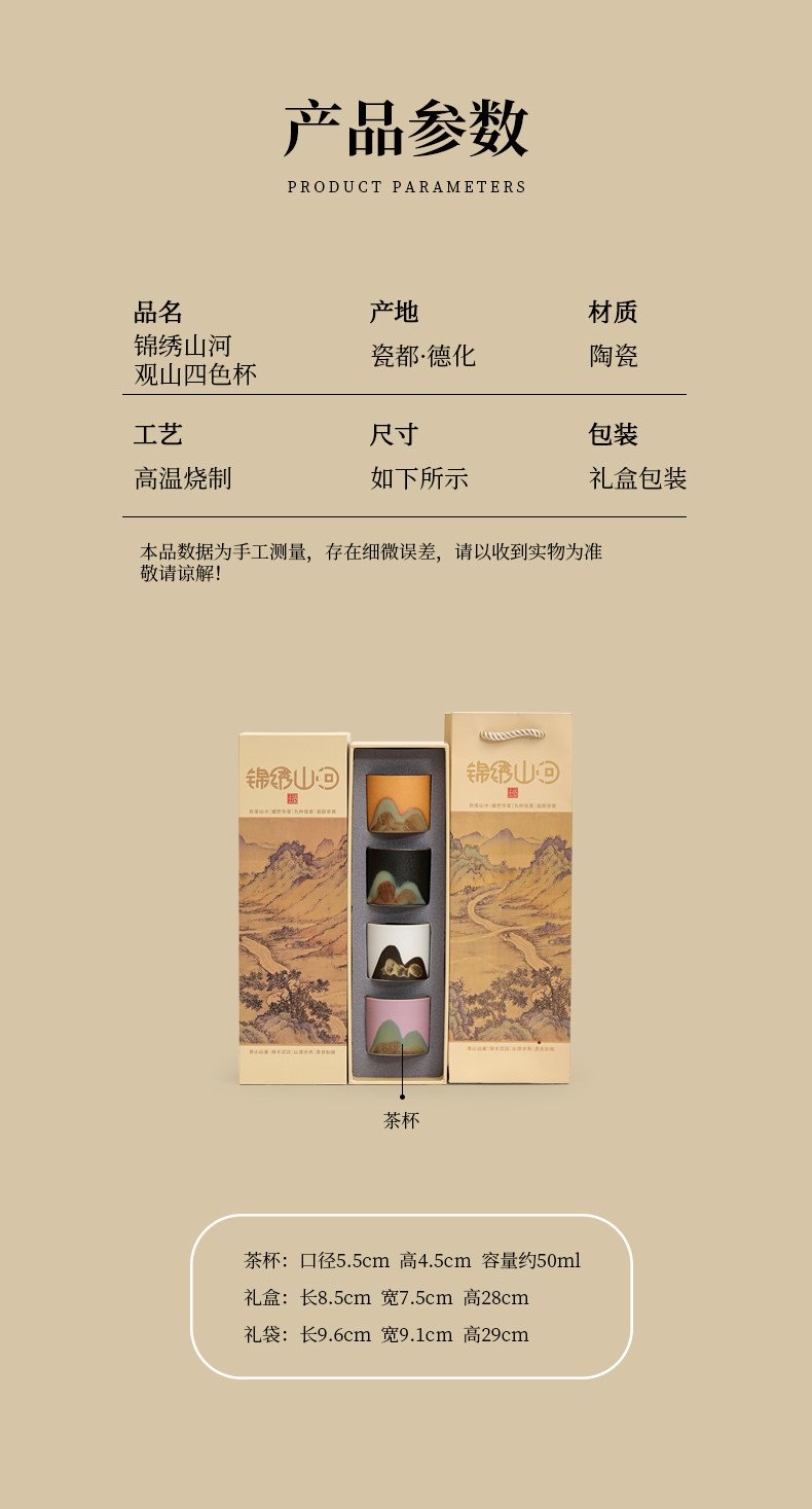 | Color Classification | Splendid Mountains and Rivers - Four Color Mountain Viewing Cup,A Thousand Miles of Mountains and Rivers - Four Cups of Landscape,Thousand Miles of Rivers and Mountains Straight Body-Four Color Cup,Hand-Painted Distant Mountains Straight - Four-Color Cup,Jinxiu Jiangshan Straight Body-Four Seasons Cup |