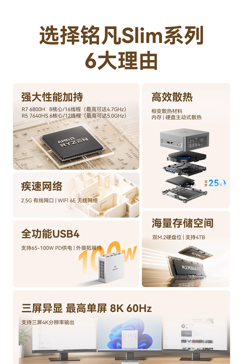 Mingfan Um760Slim Amd Ryzen R5-7640Hs High-Performance Mini Host Computer Ultra-Quiet Home Office Gaming Design Business Office Mini Host Portable Desktop