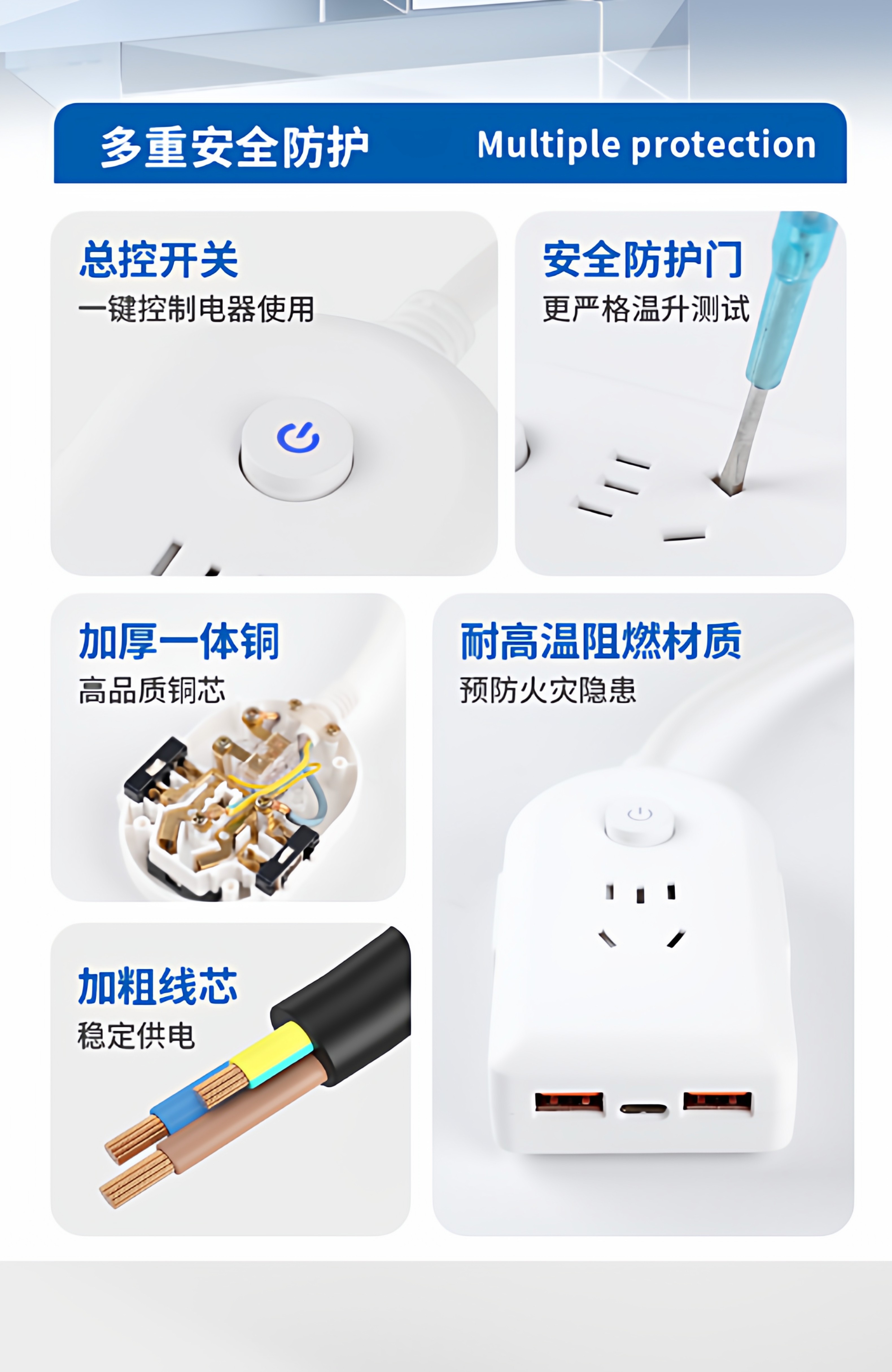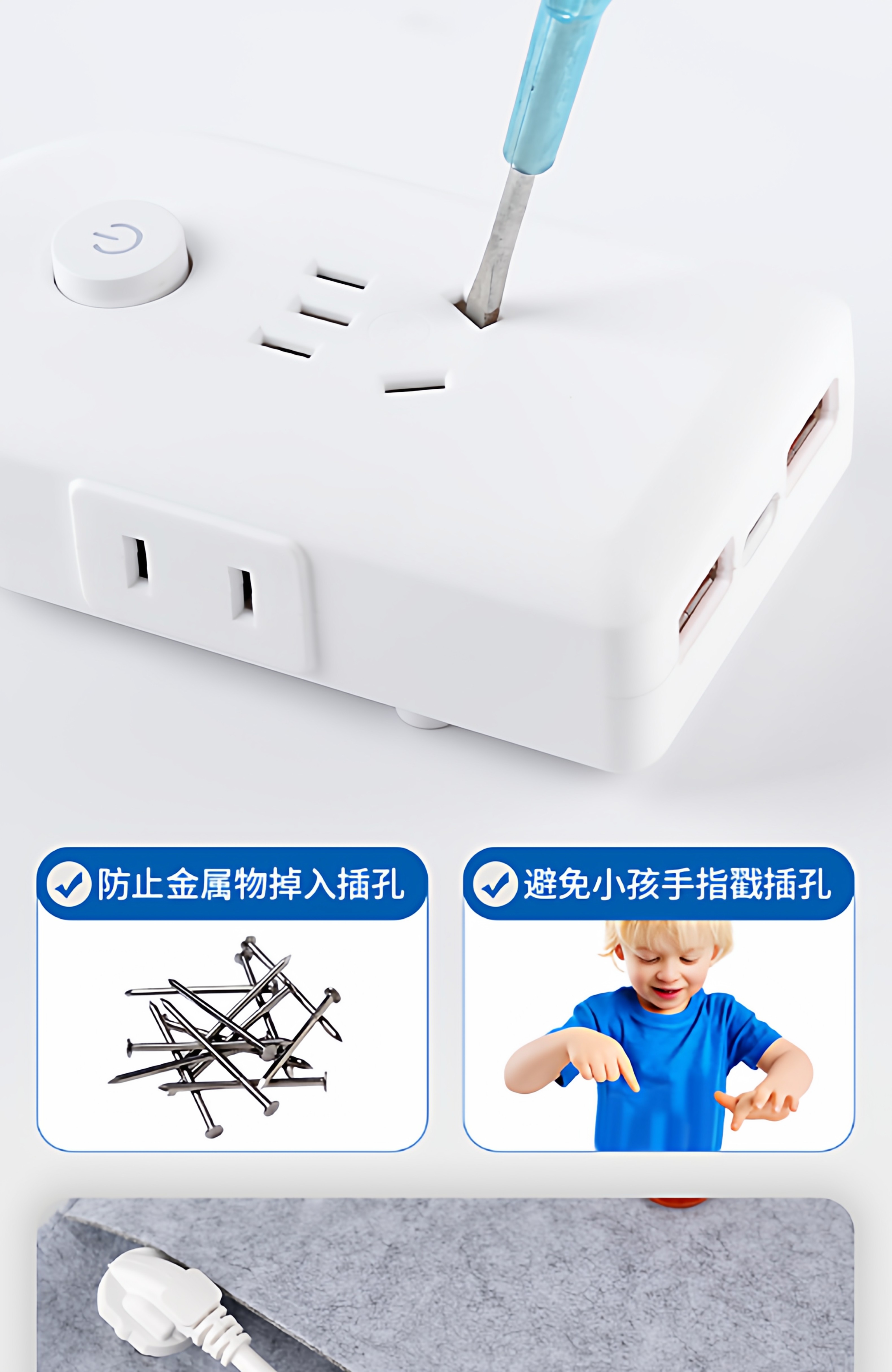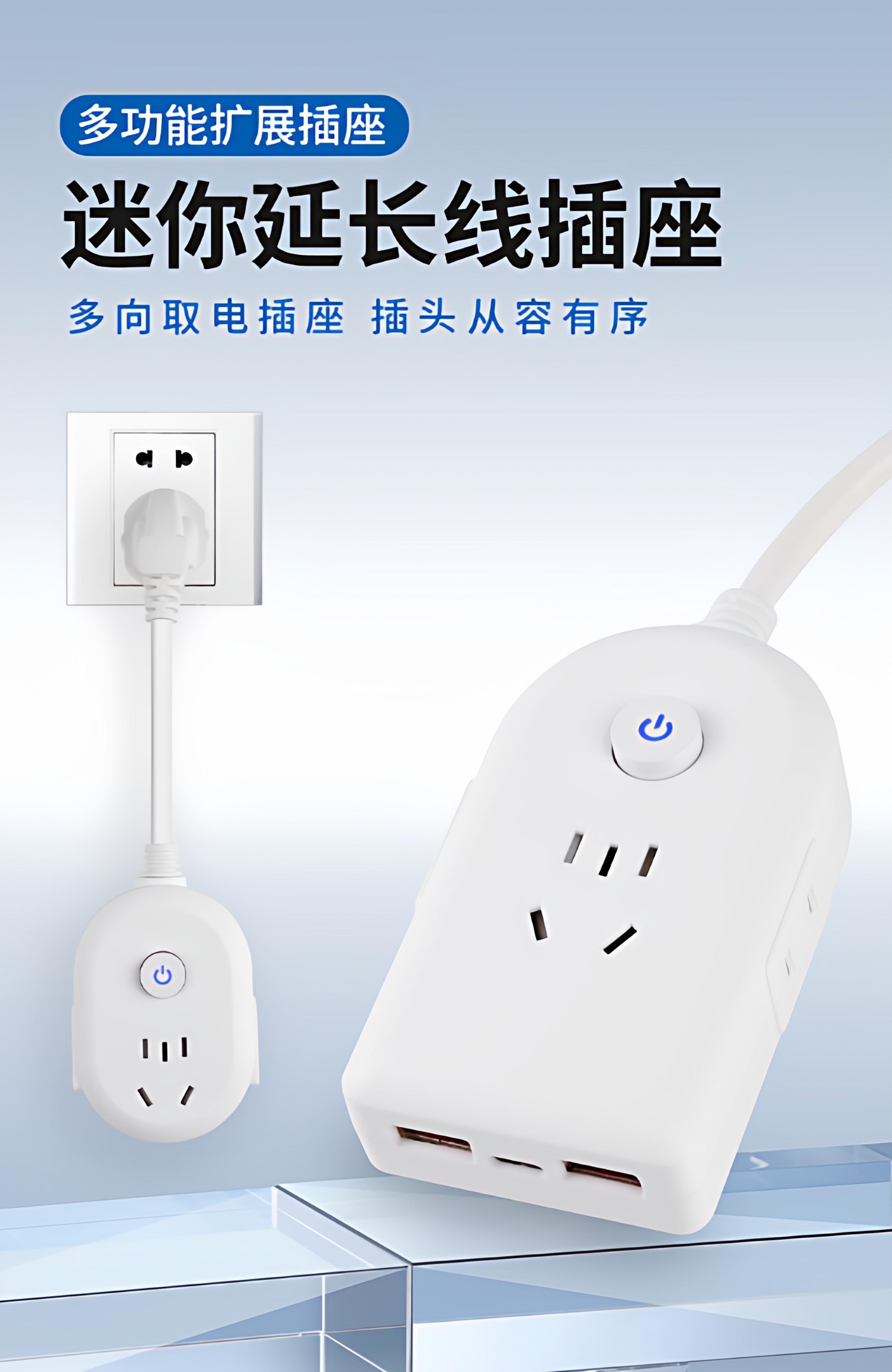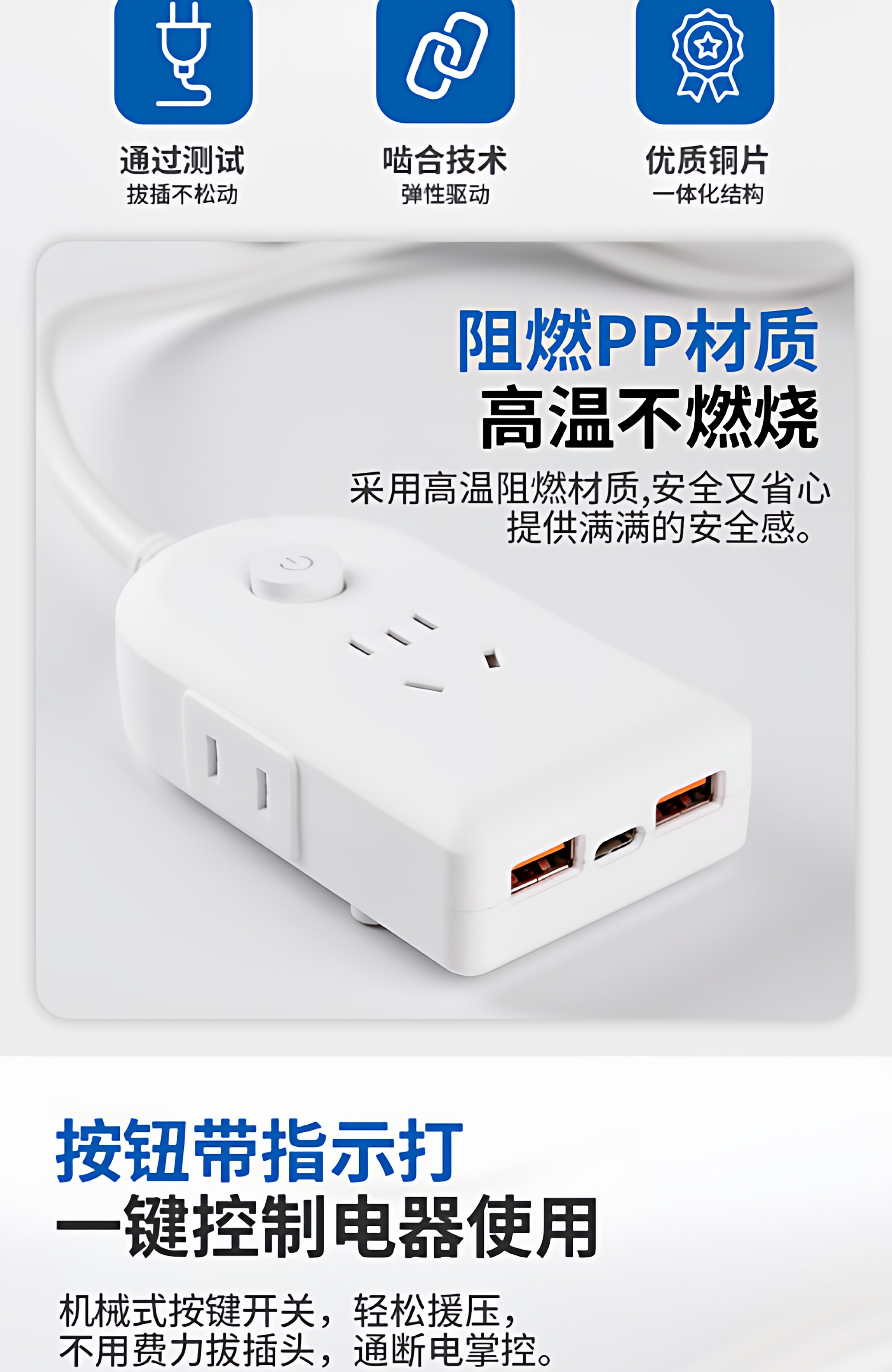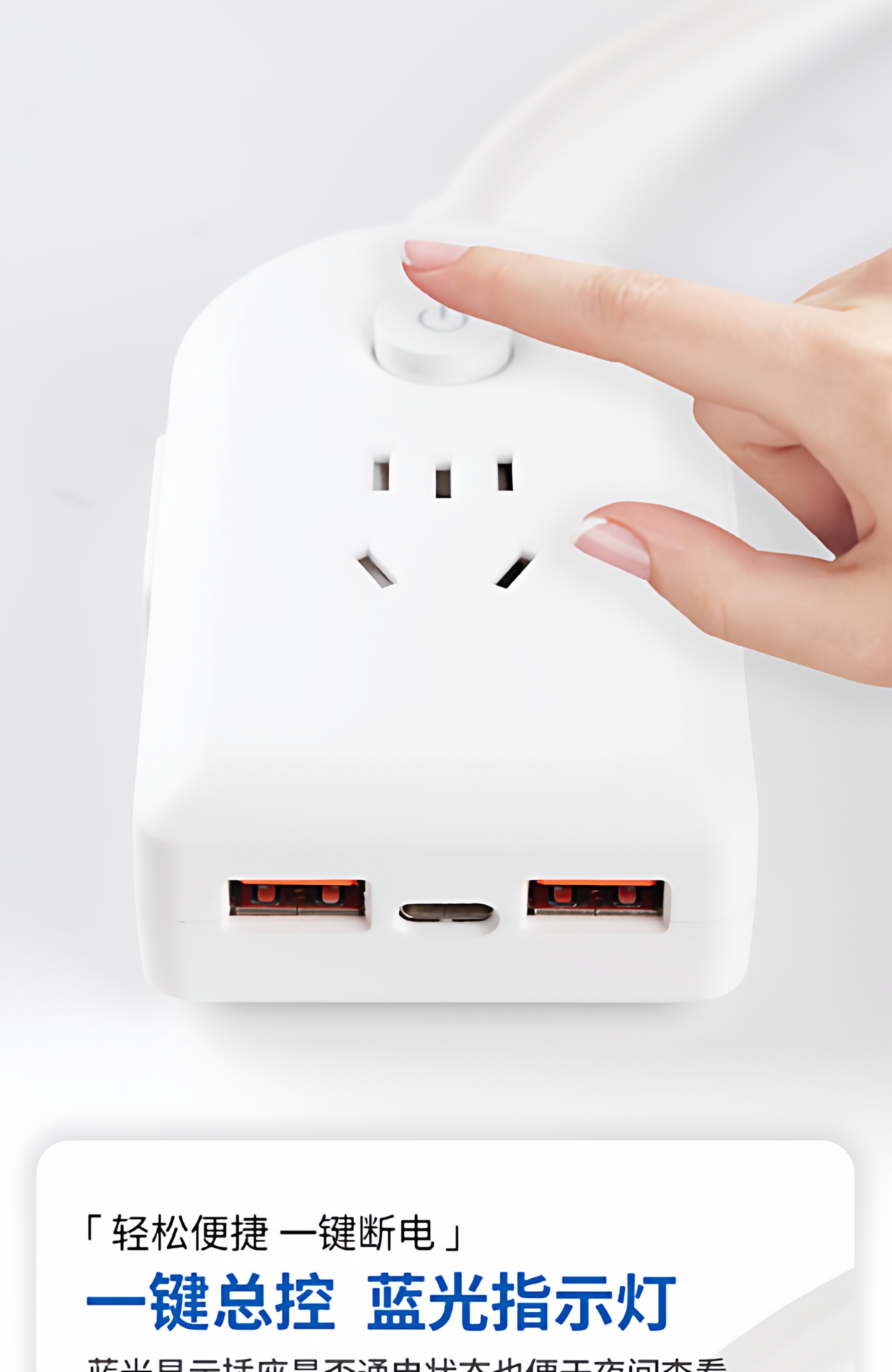 Multi-Functional Travel Power Strip with One-To-Three USB Charging Extension Cord, Portable Multi-Port Power Strip for Student Dormitories
