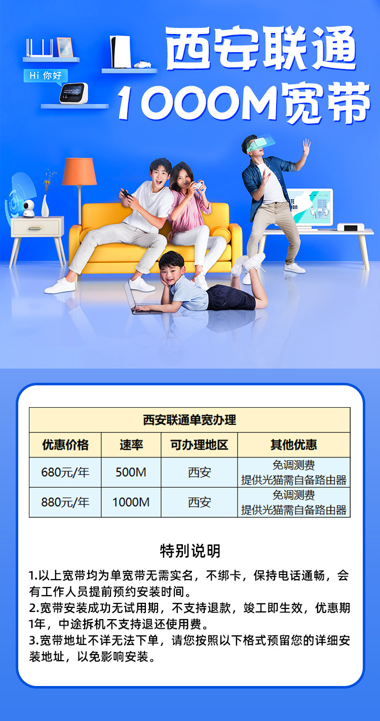 | Broadband Installation and Rental | Xi'An China Unicom 1000m Annual Package Single Width 880 Yuan/Year,Xi'An China Unicom 500m Annual Package Single Width 680 Yuan/Year |