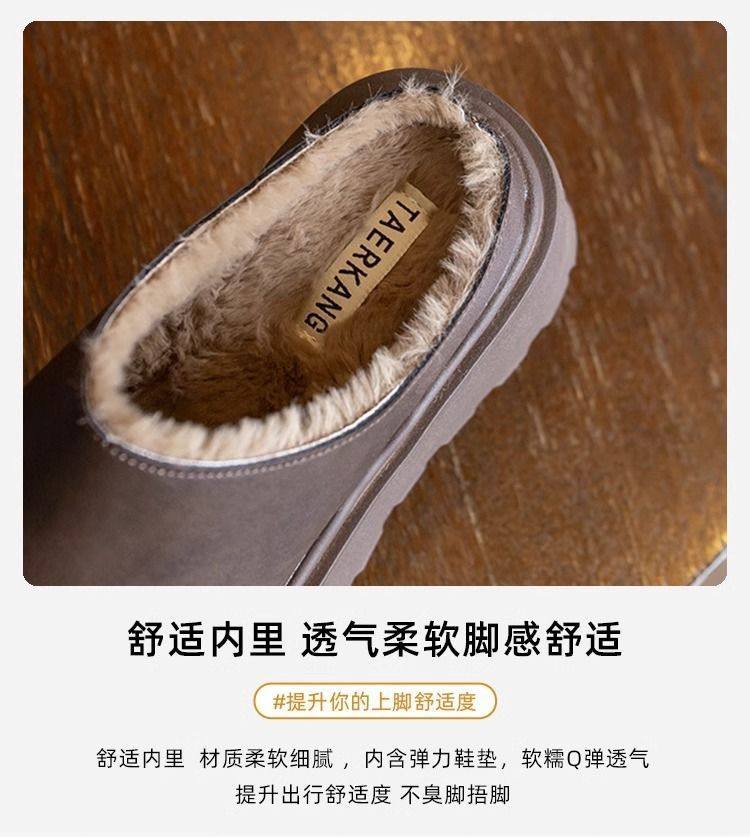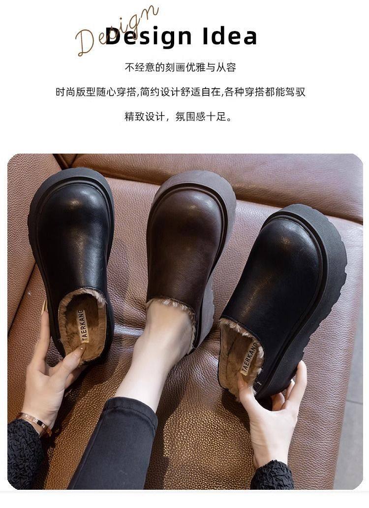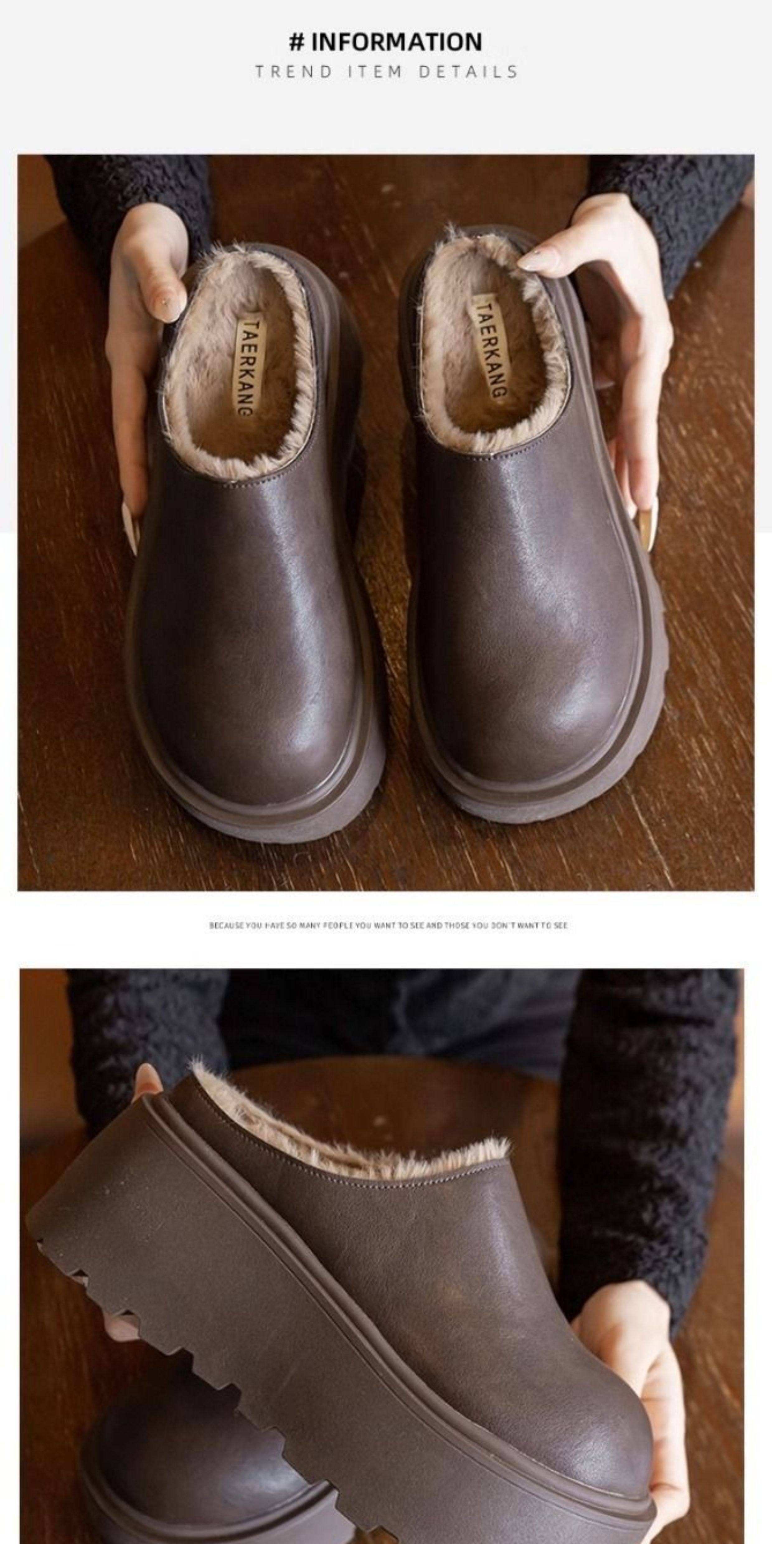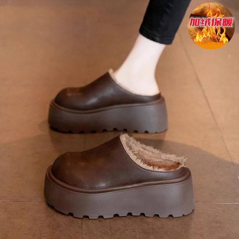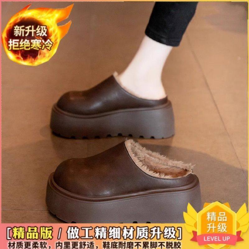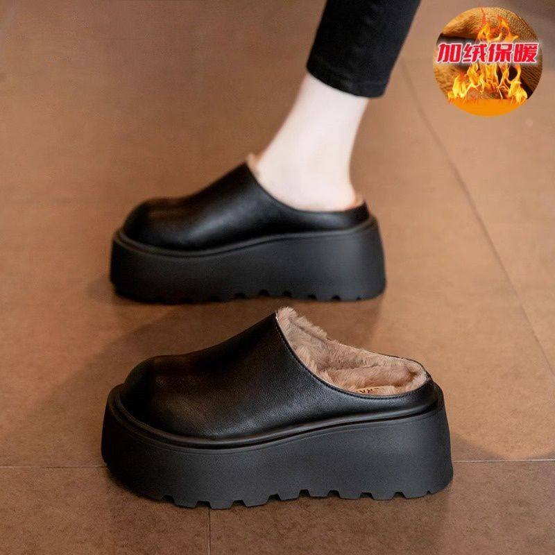 Genuine Leather Thick-Soled Outdoor Wear 2025 Winter New Style Furry Slippers for Women, Stylish Height-Increasing Plush Snow Boots, Closed-Toe Cotton Slippers