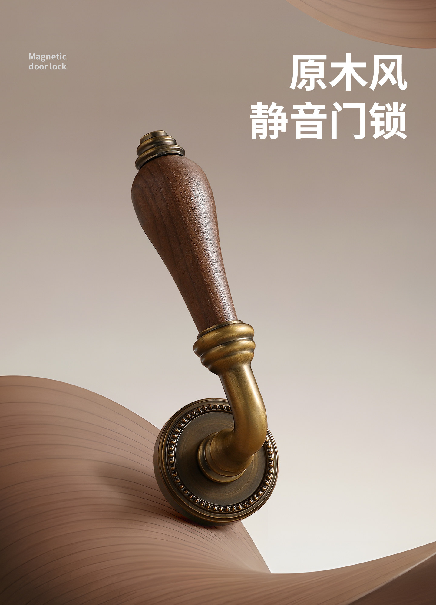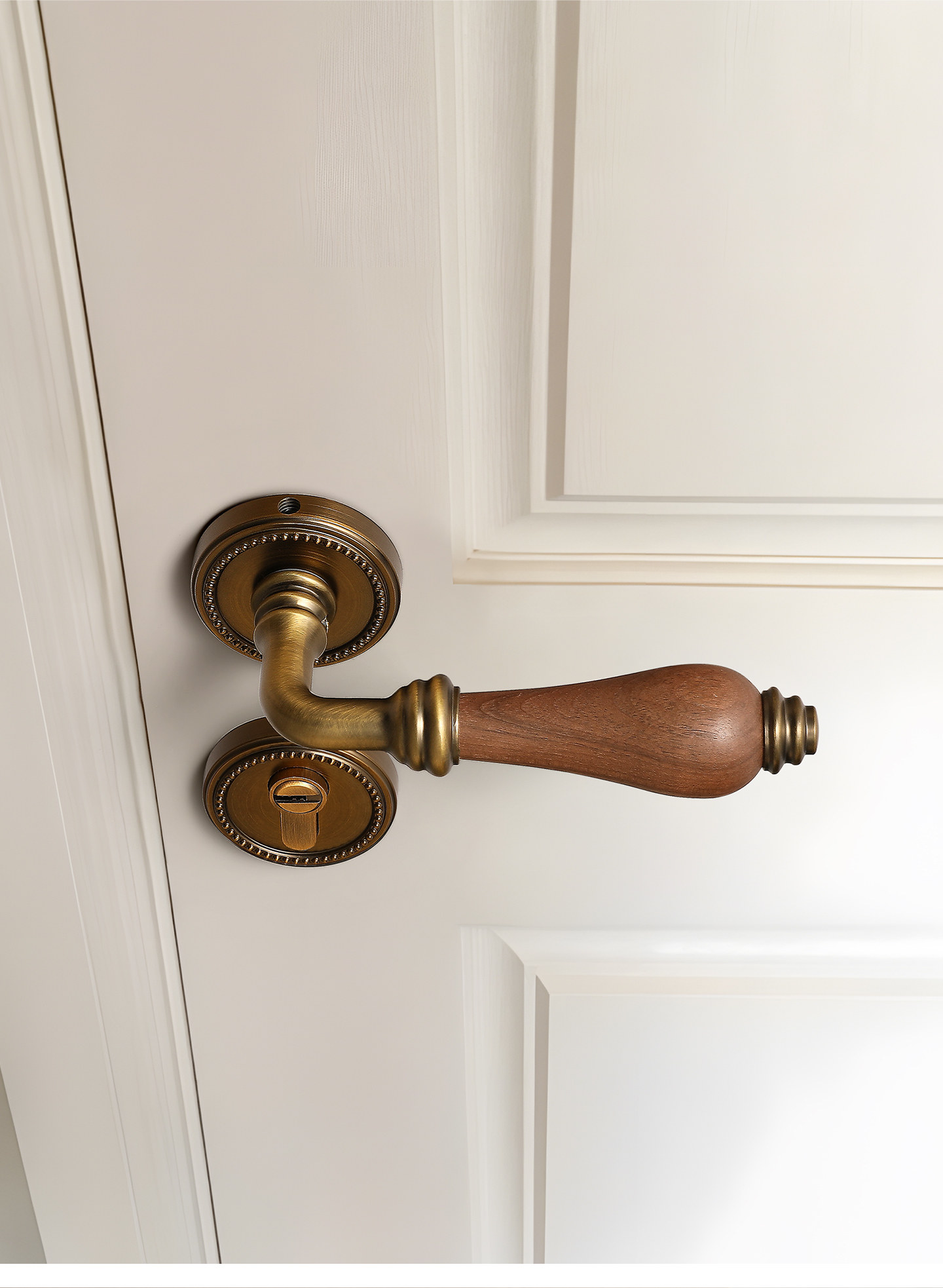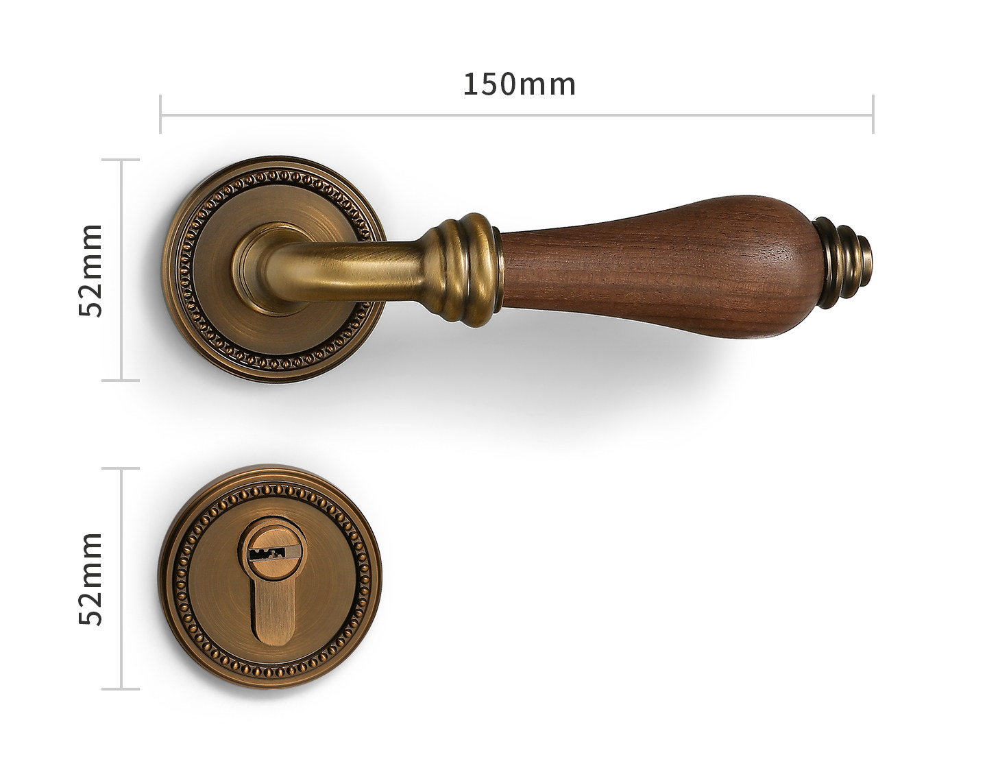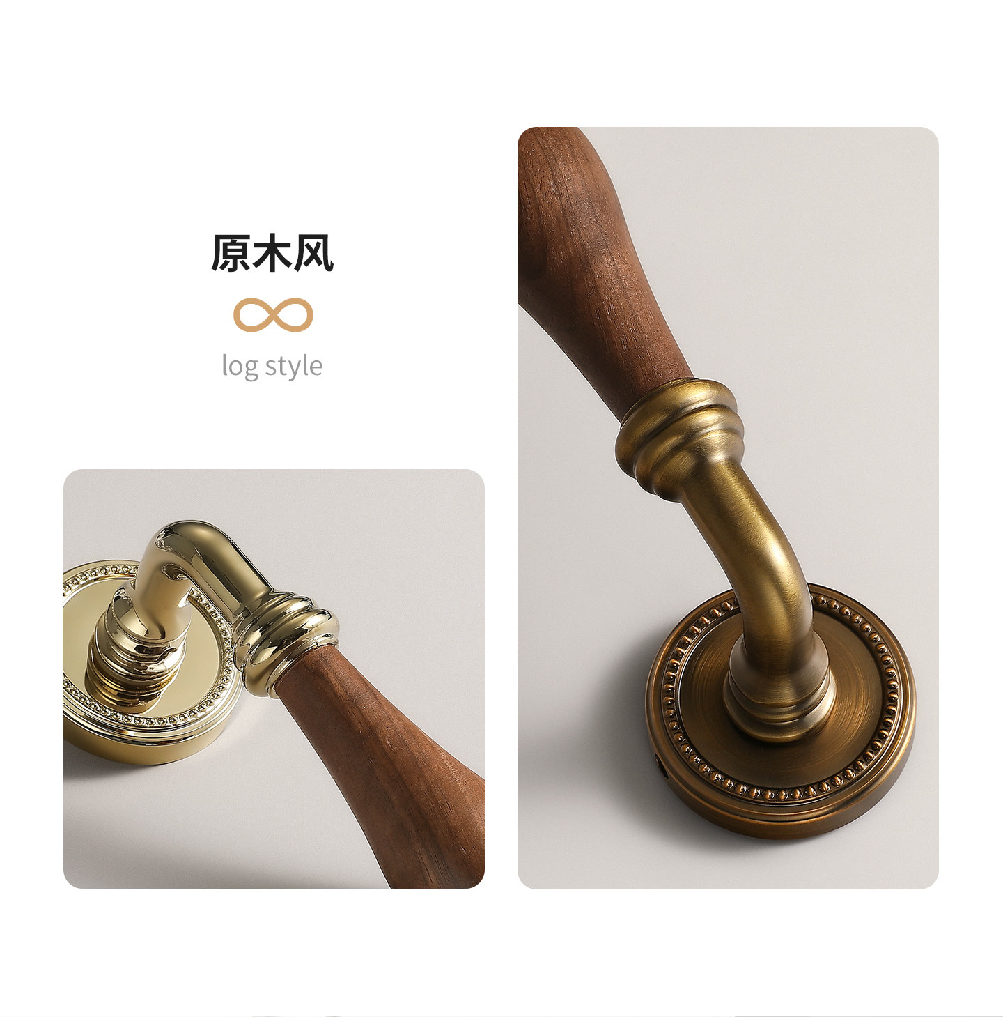 French-Style Vintage Yellow Bronze Bedroom Door Lock, Antique-Style Household Indoor Walnut Door Lock Handle